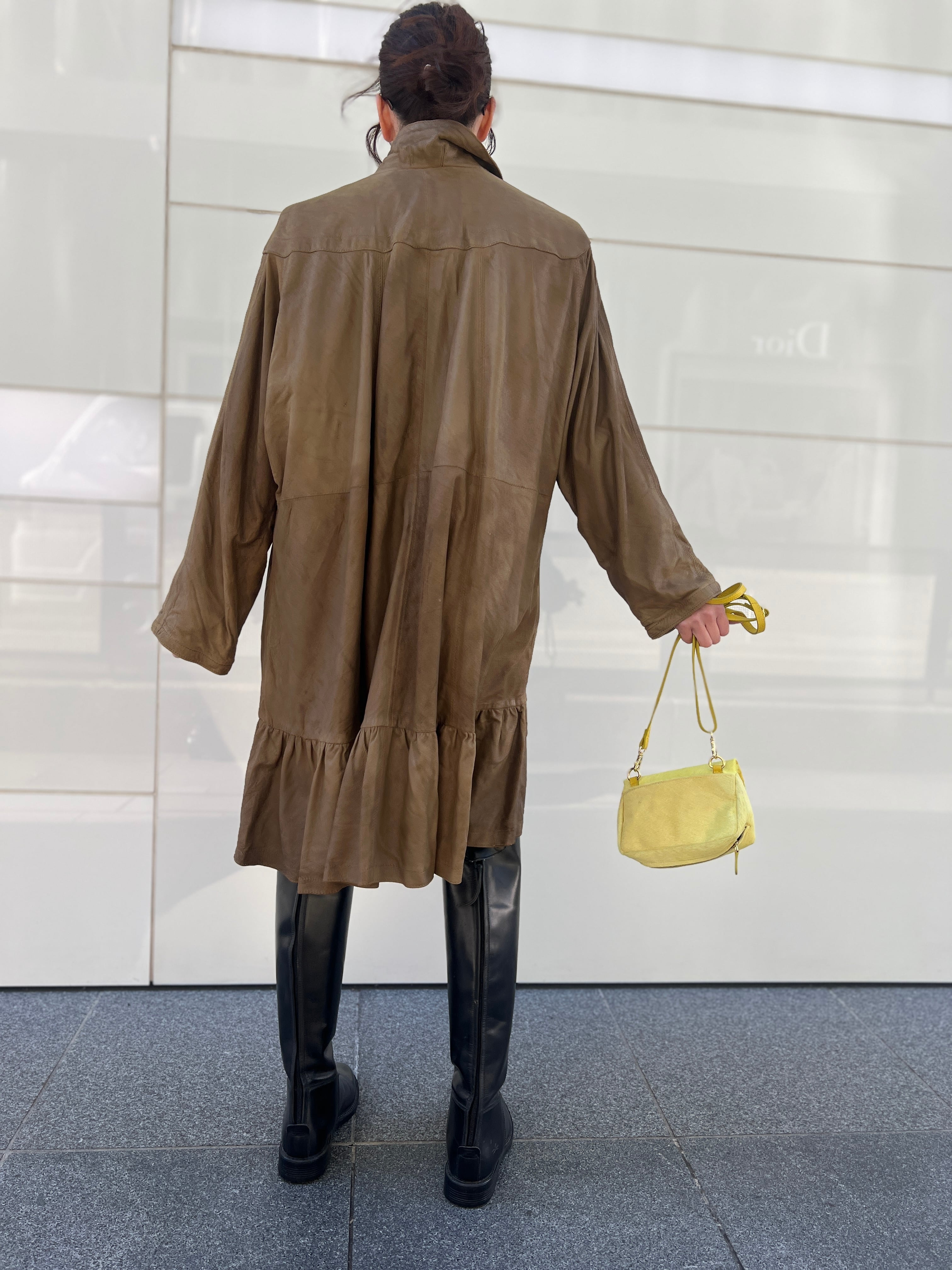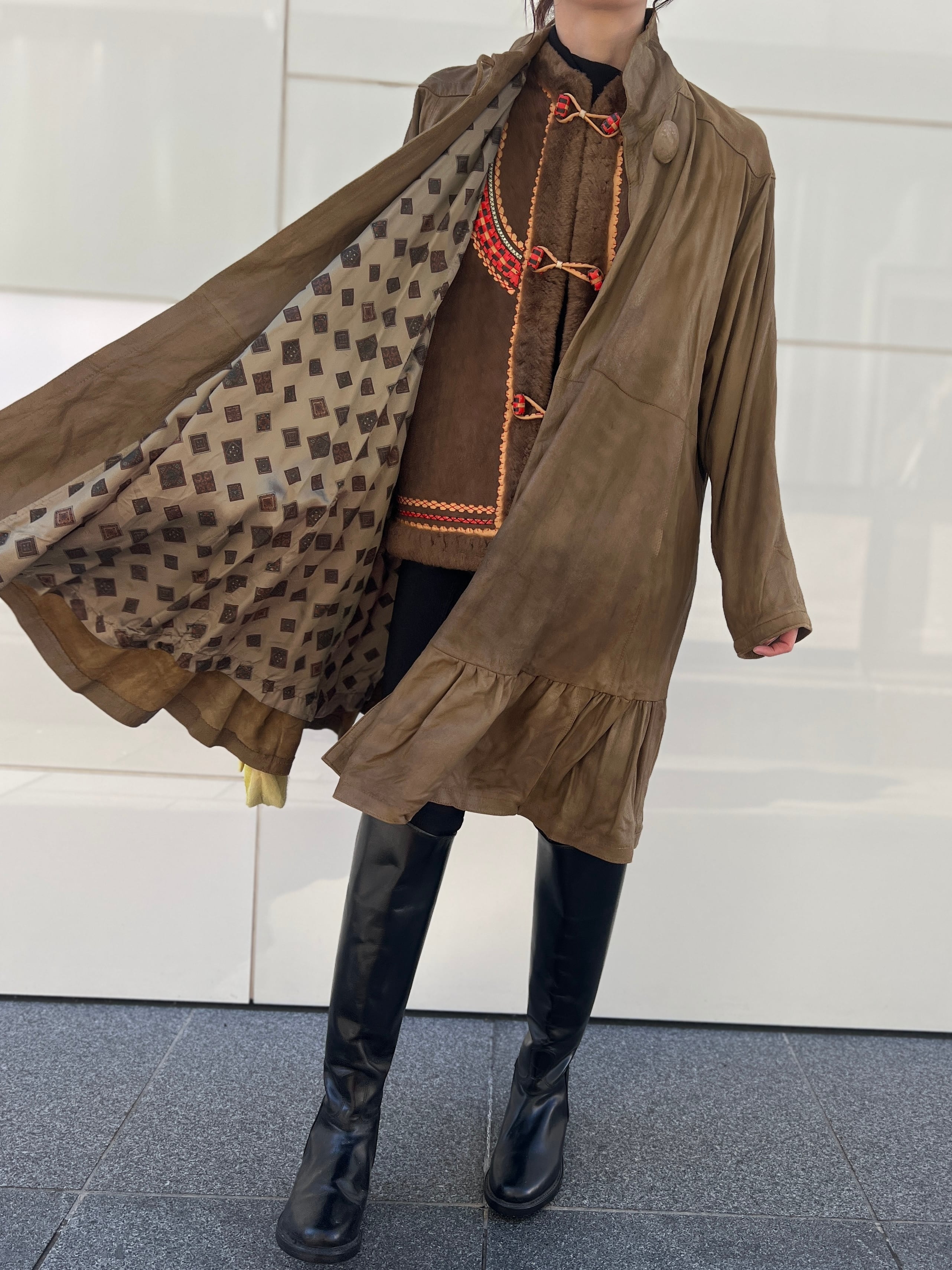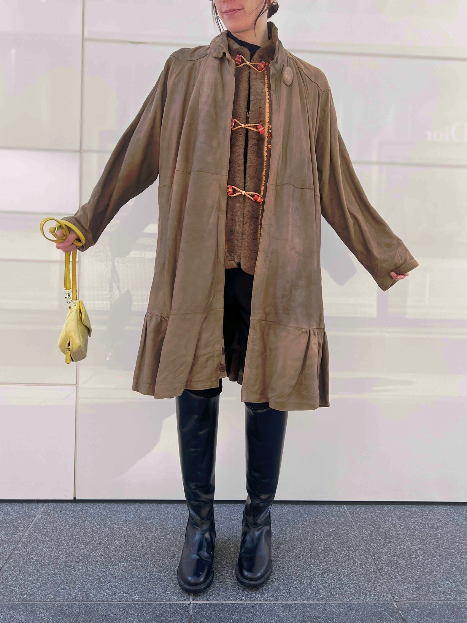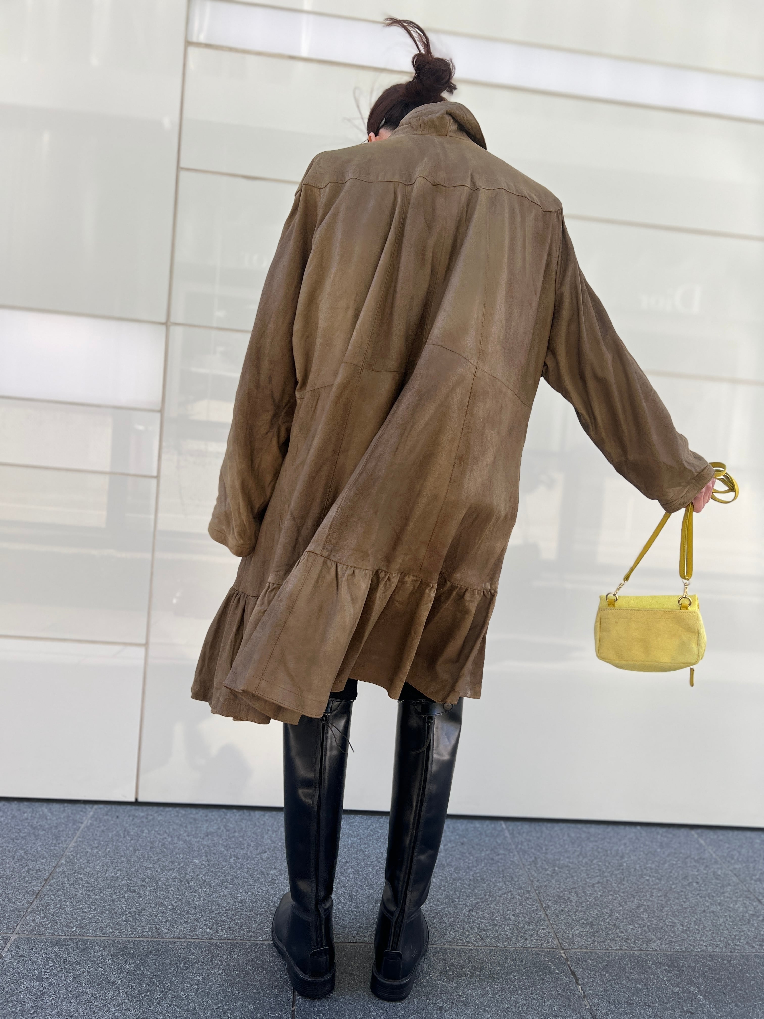 軽やかに揺れるレザーフレアコート。