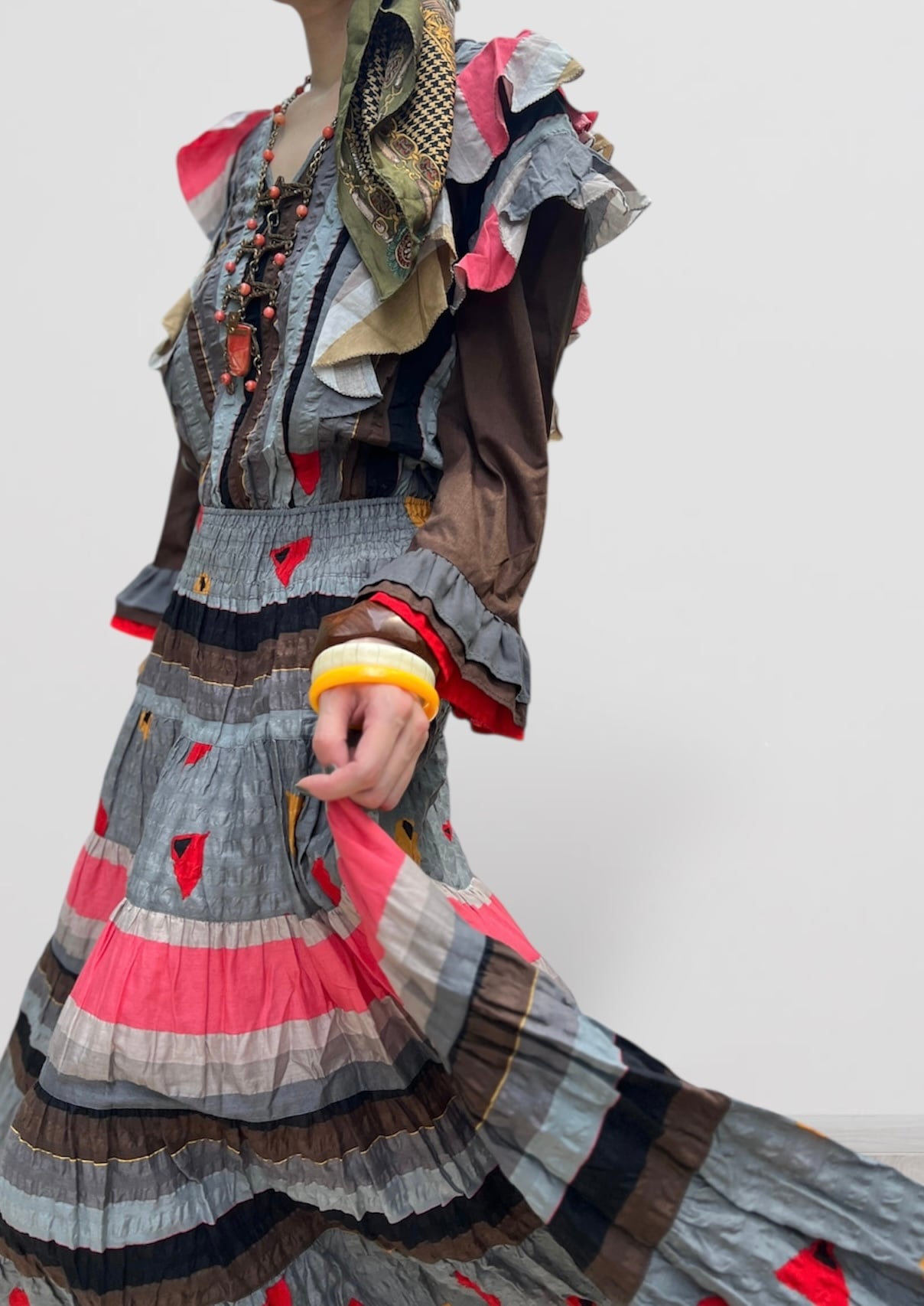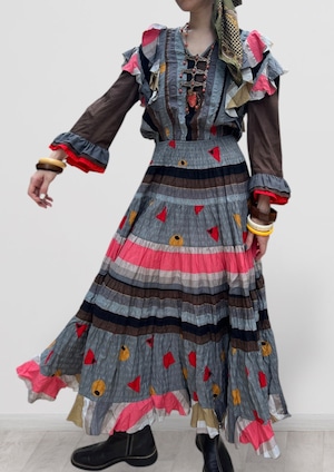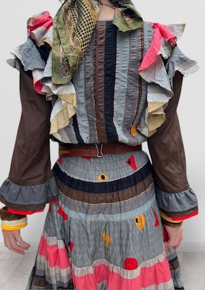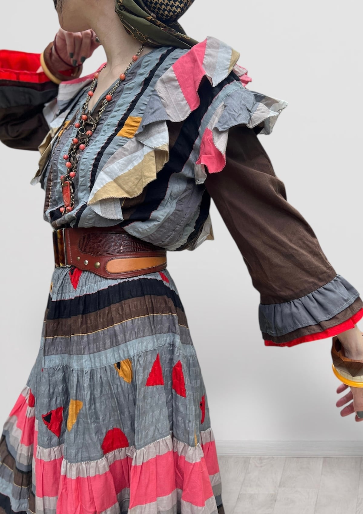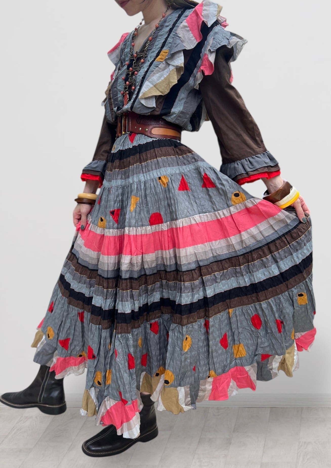 ストライプとドットのような幾何学的アクセント、立体的なカッティング、そしてアイコニックなフリルディテール。