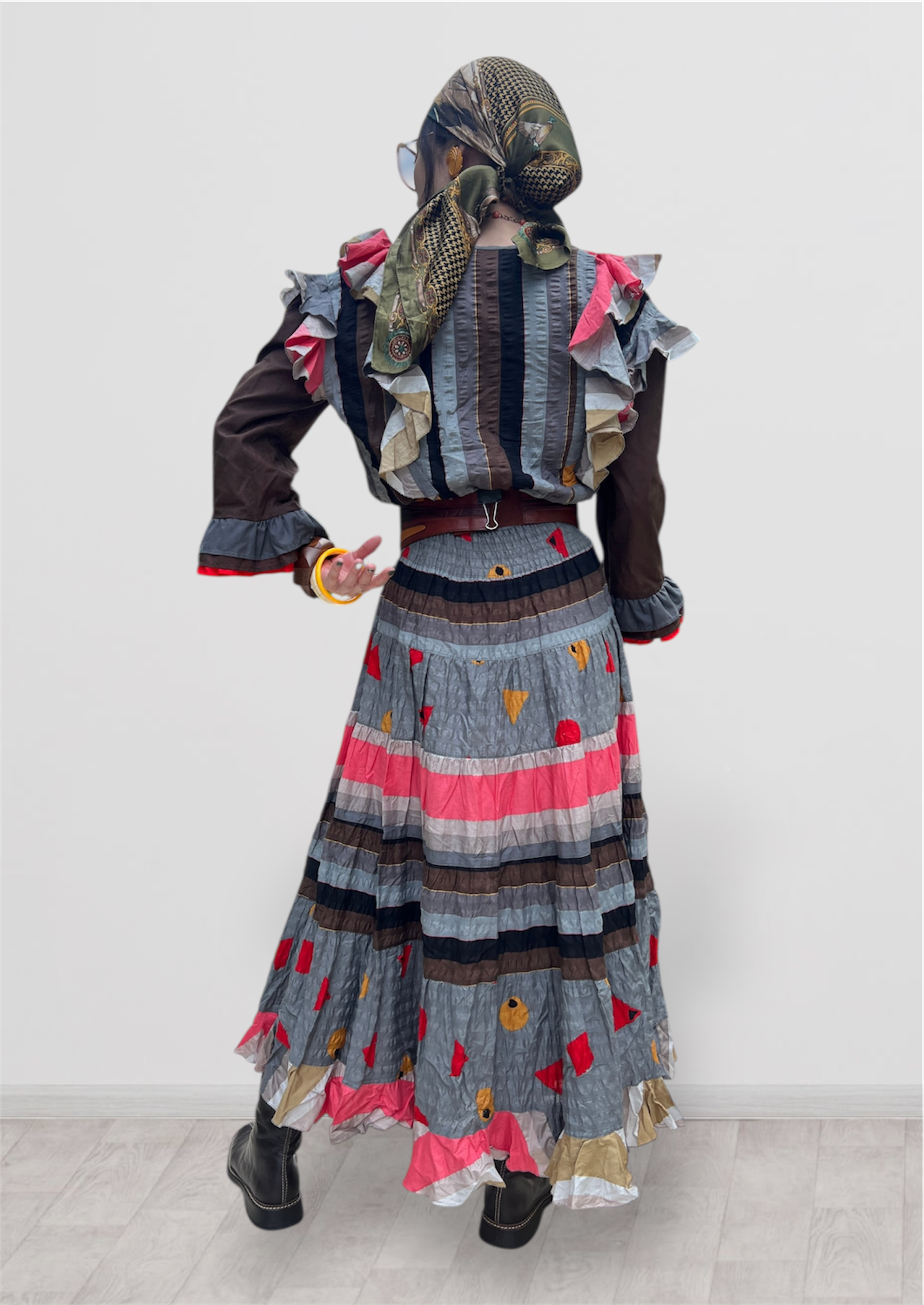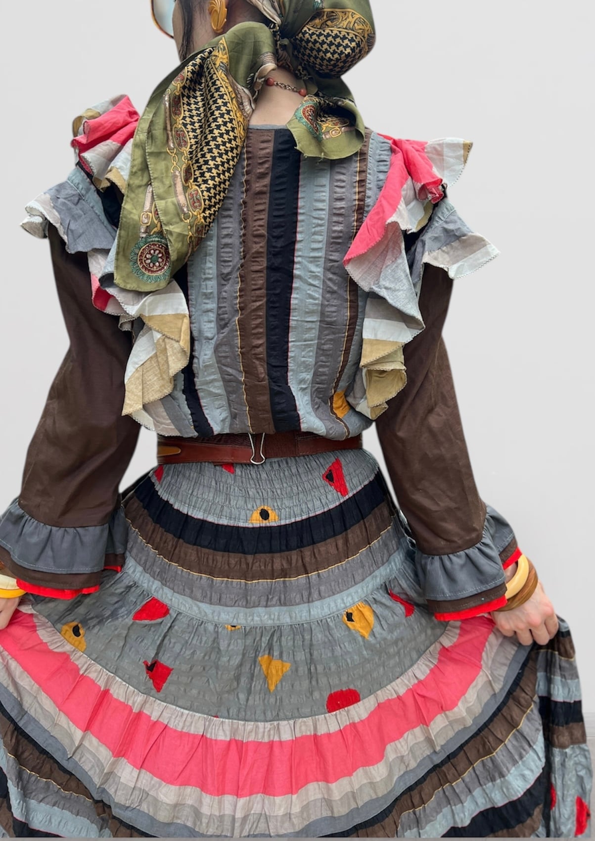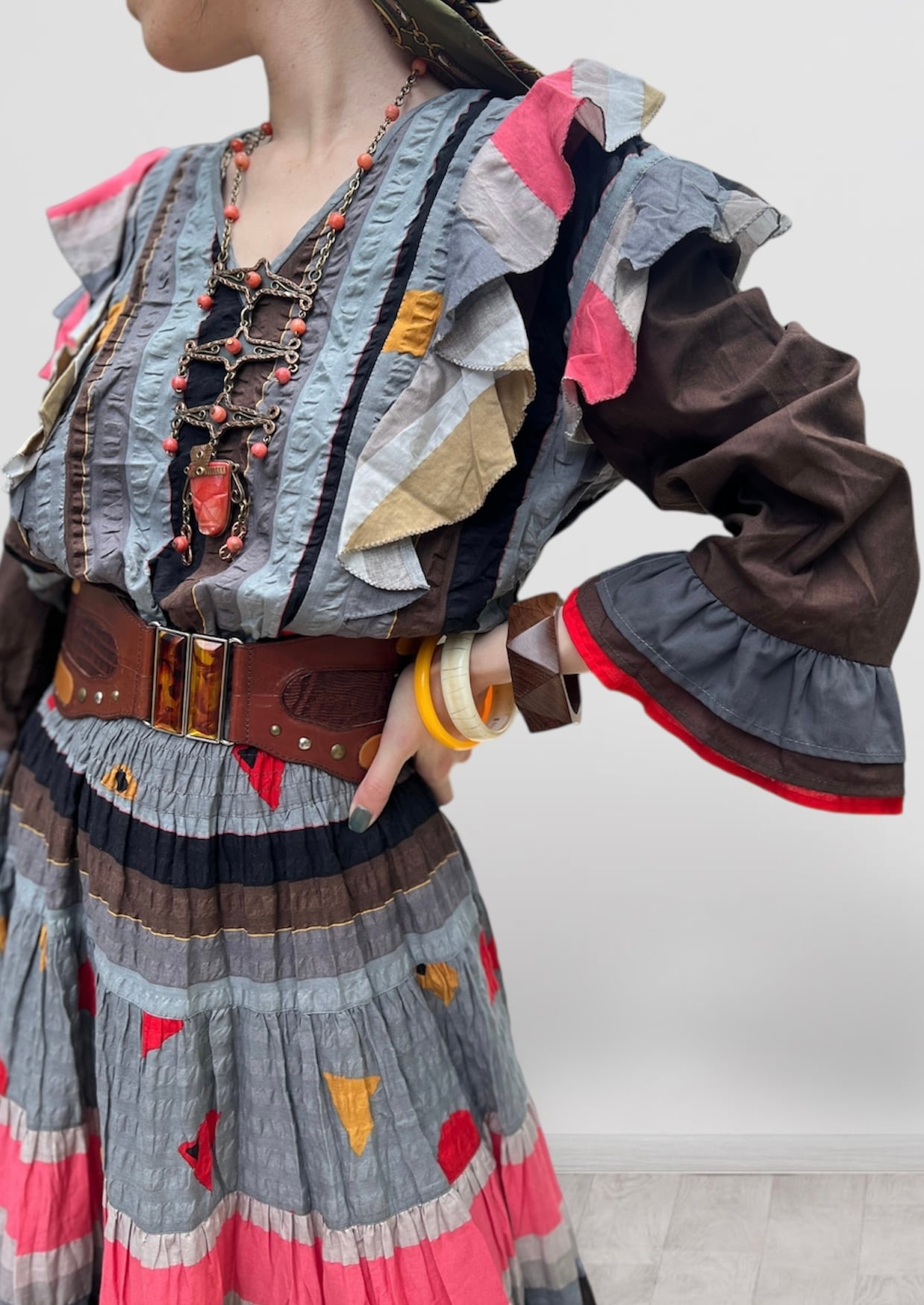 ストライプとドットのような幾何学的アクセント、立体的なカッティング、そしてアイコニックなフリルディテール。
