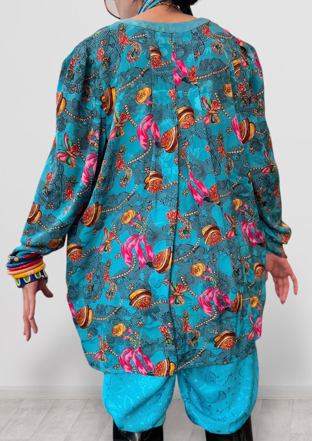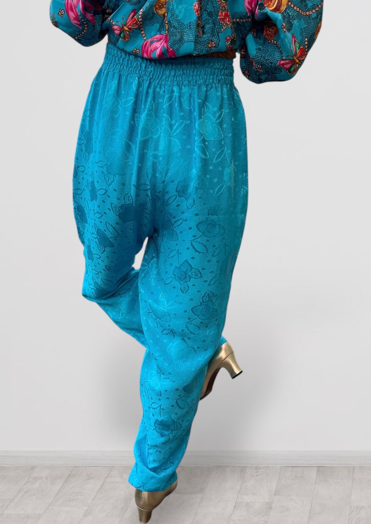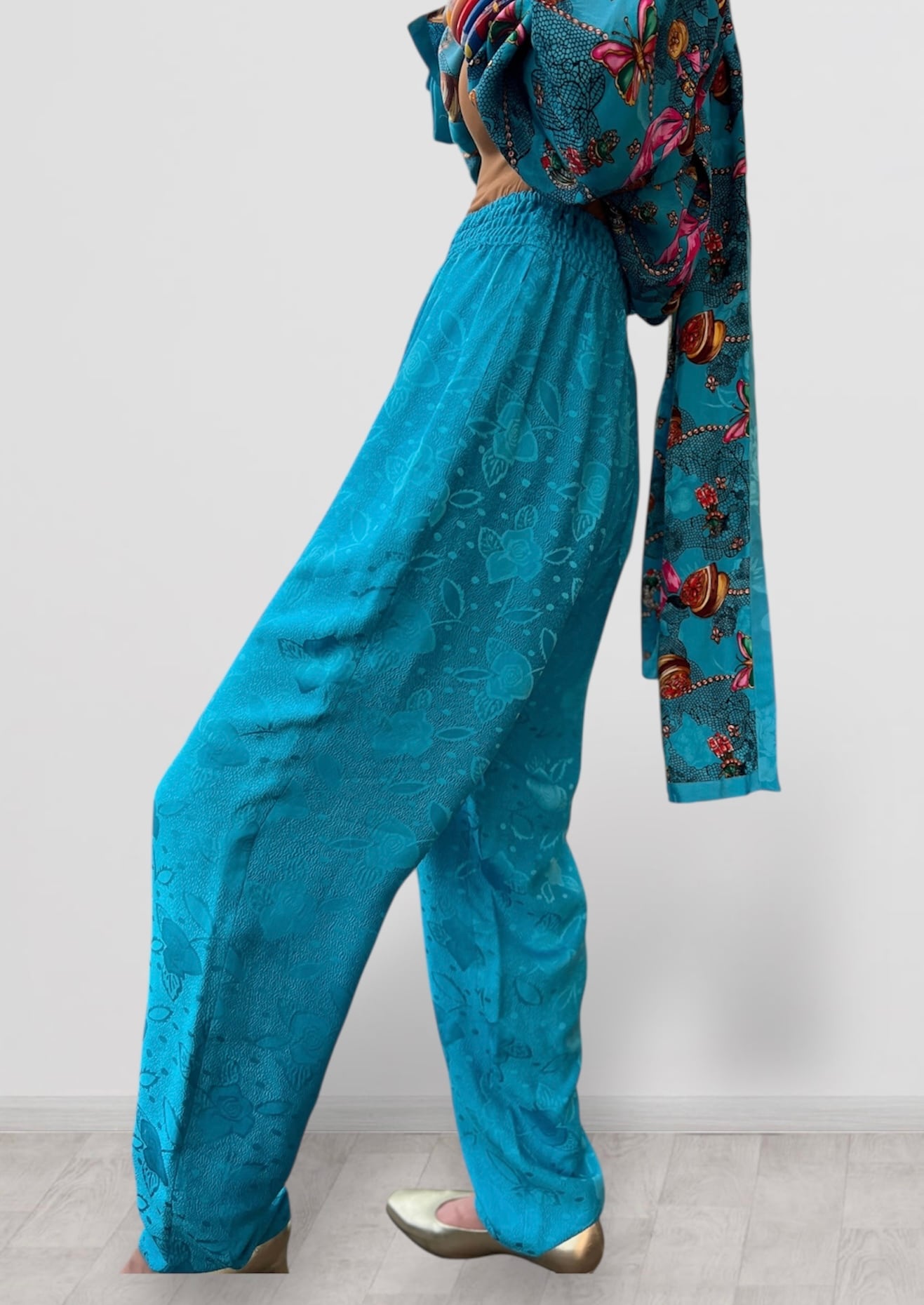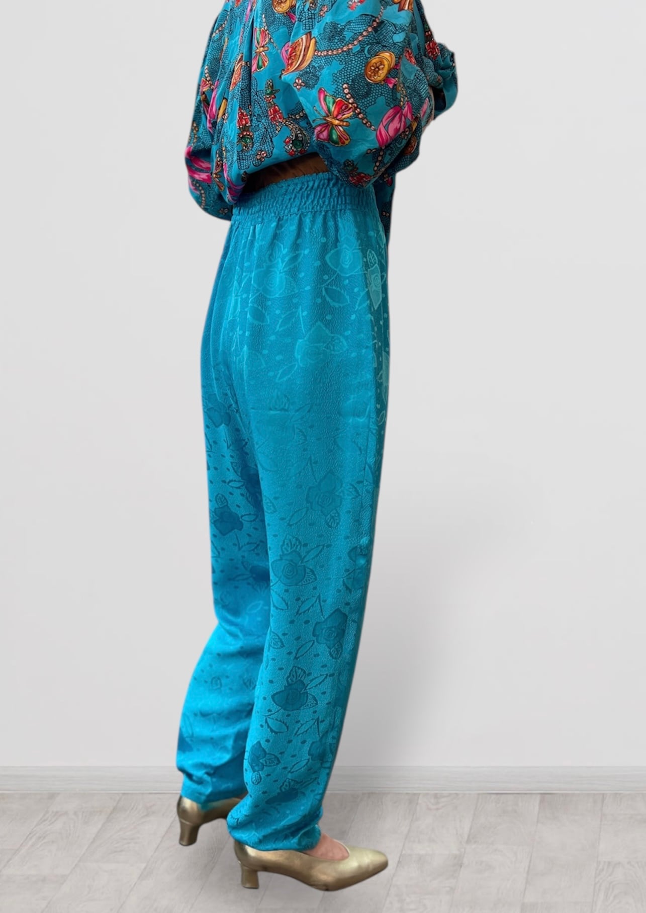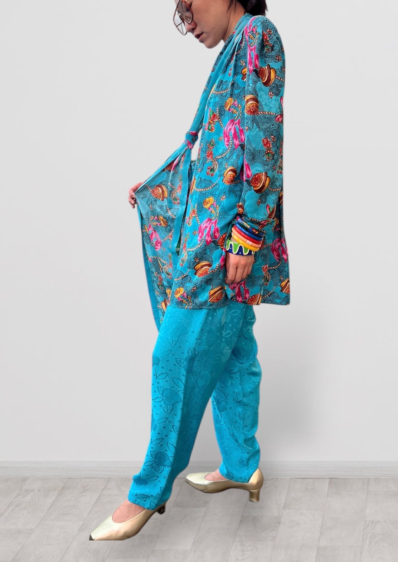 80s Diane turquoise butterfly× jewelry print silk pants suits