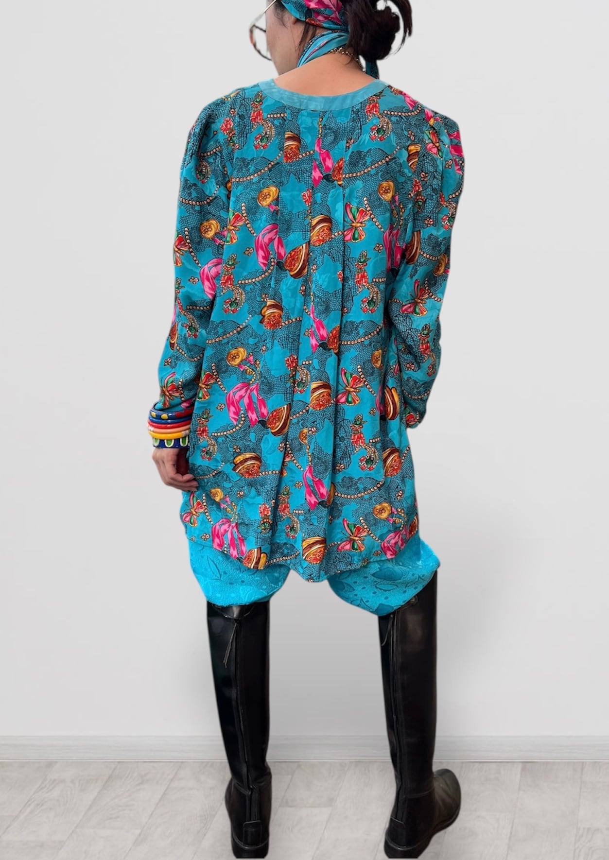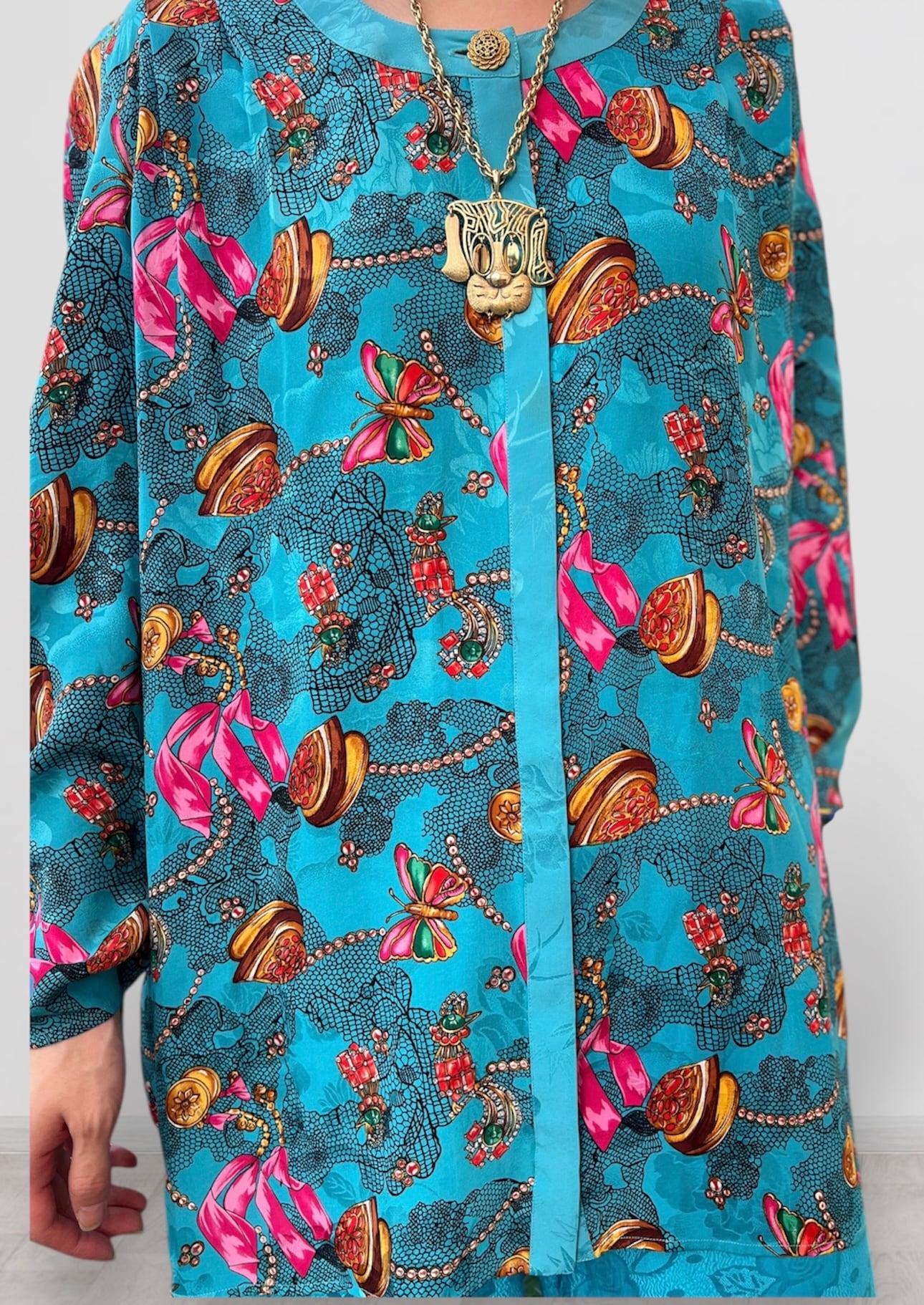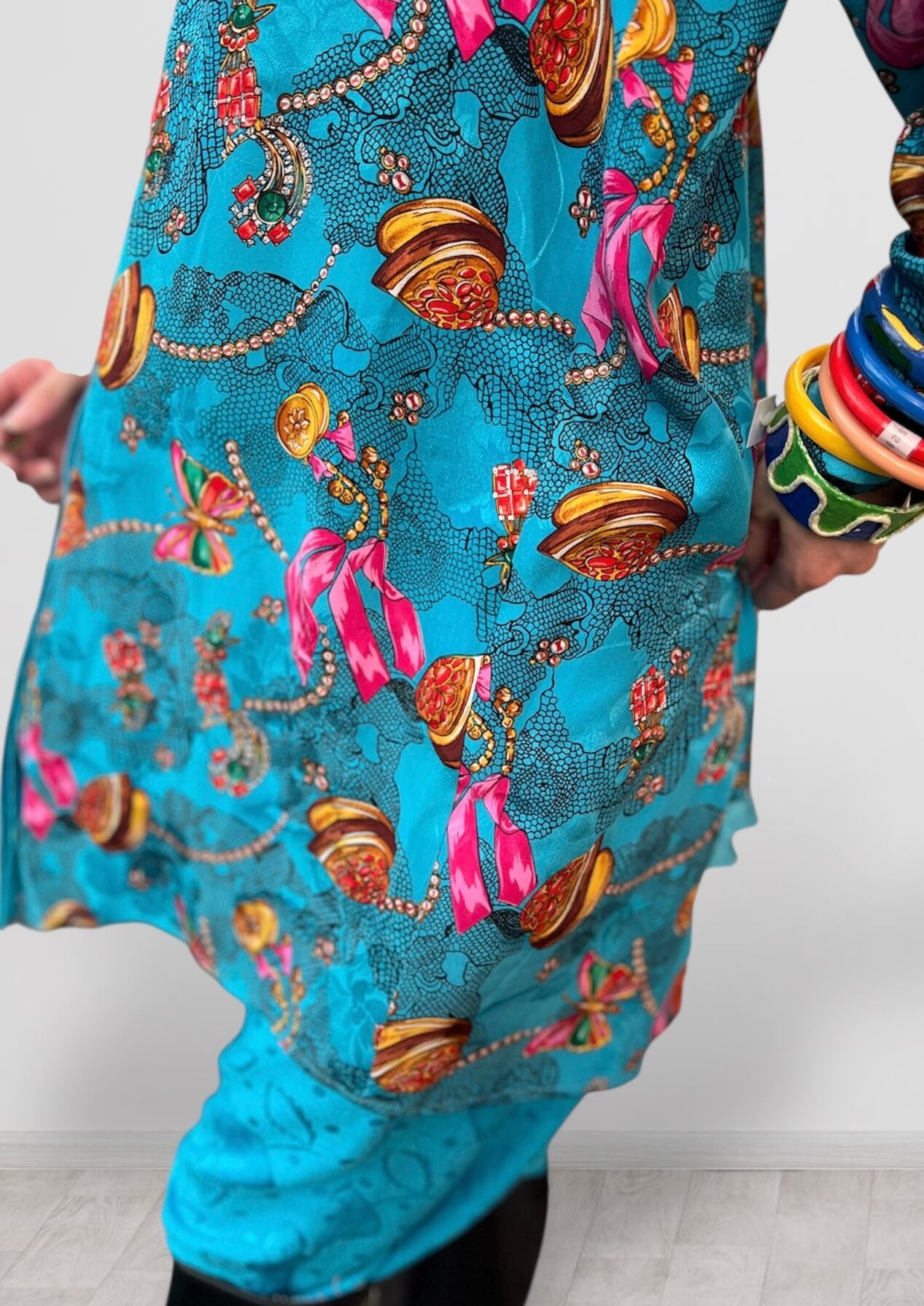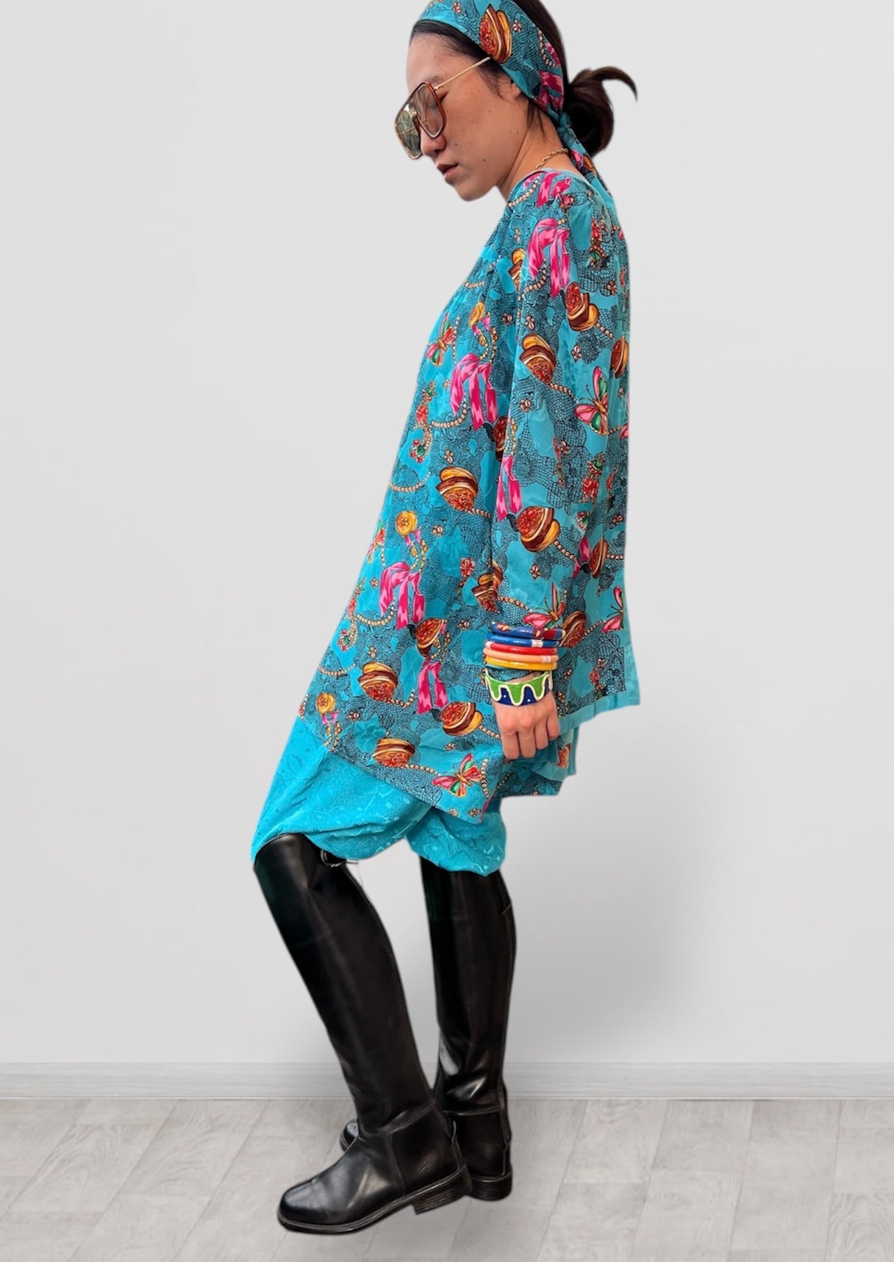鮮やかなターコイズブルーを主役に、ゴールド・フューシャ・レースパターンが散りばめられた、80年代ダイアン の希少なパンツタイプの3点コーディネートセット。