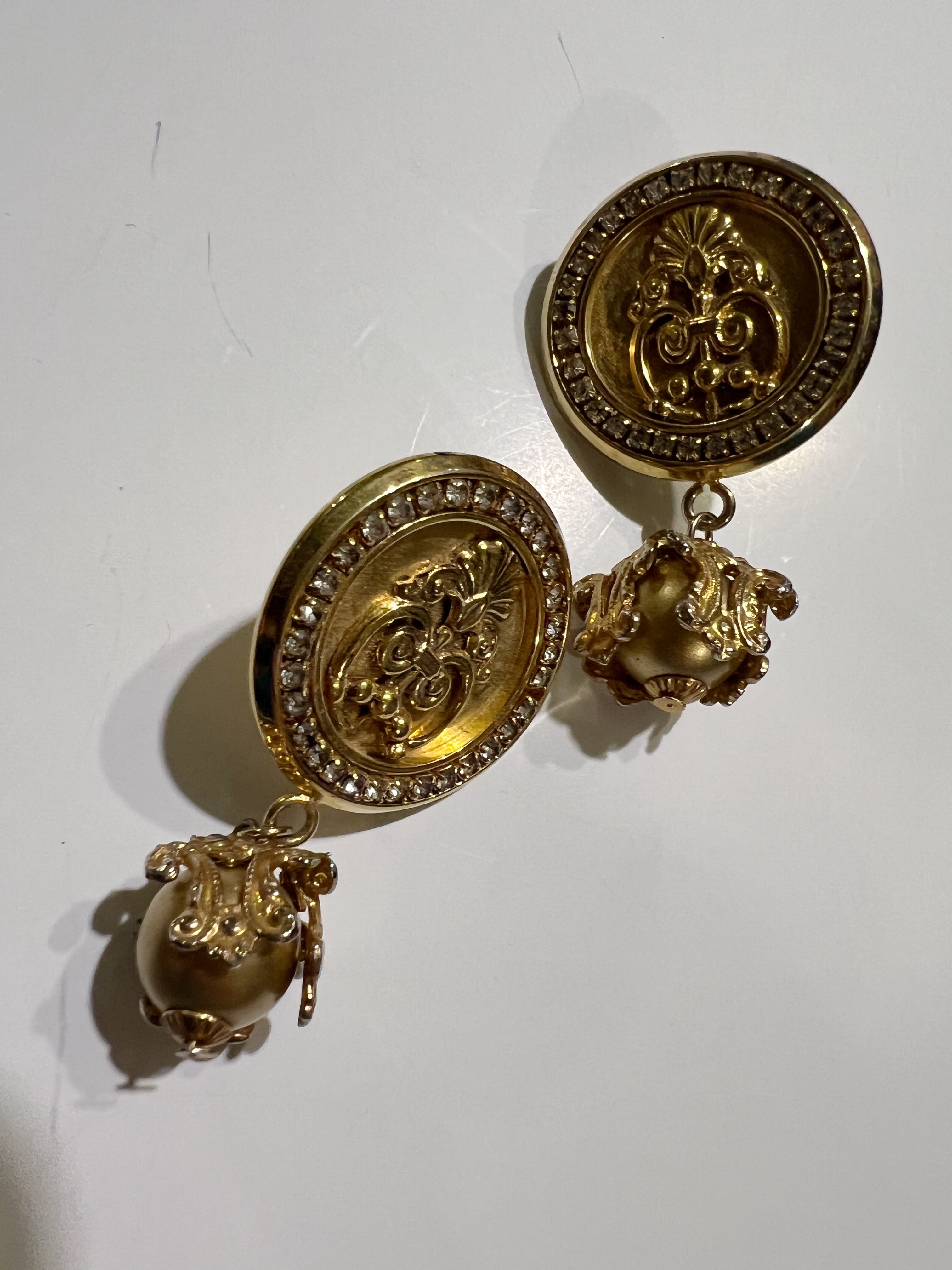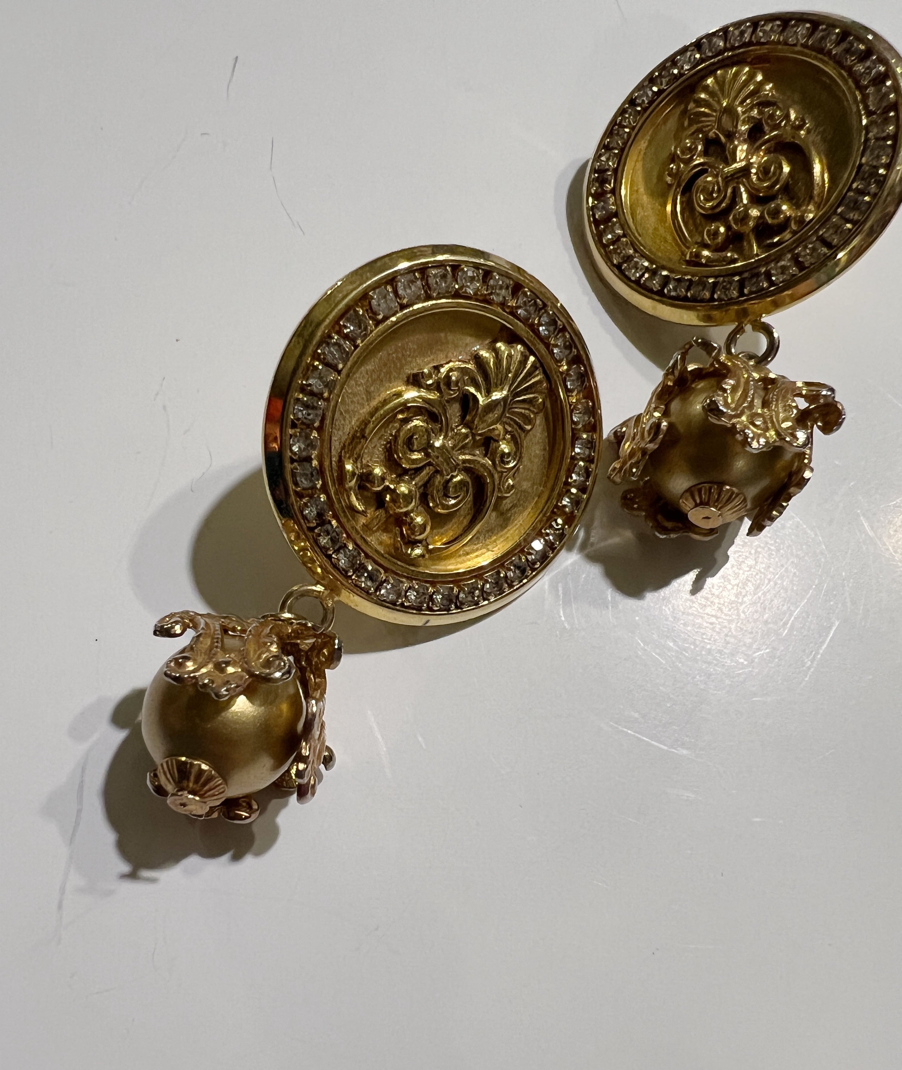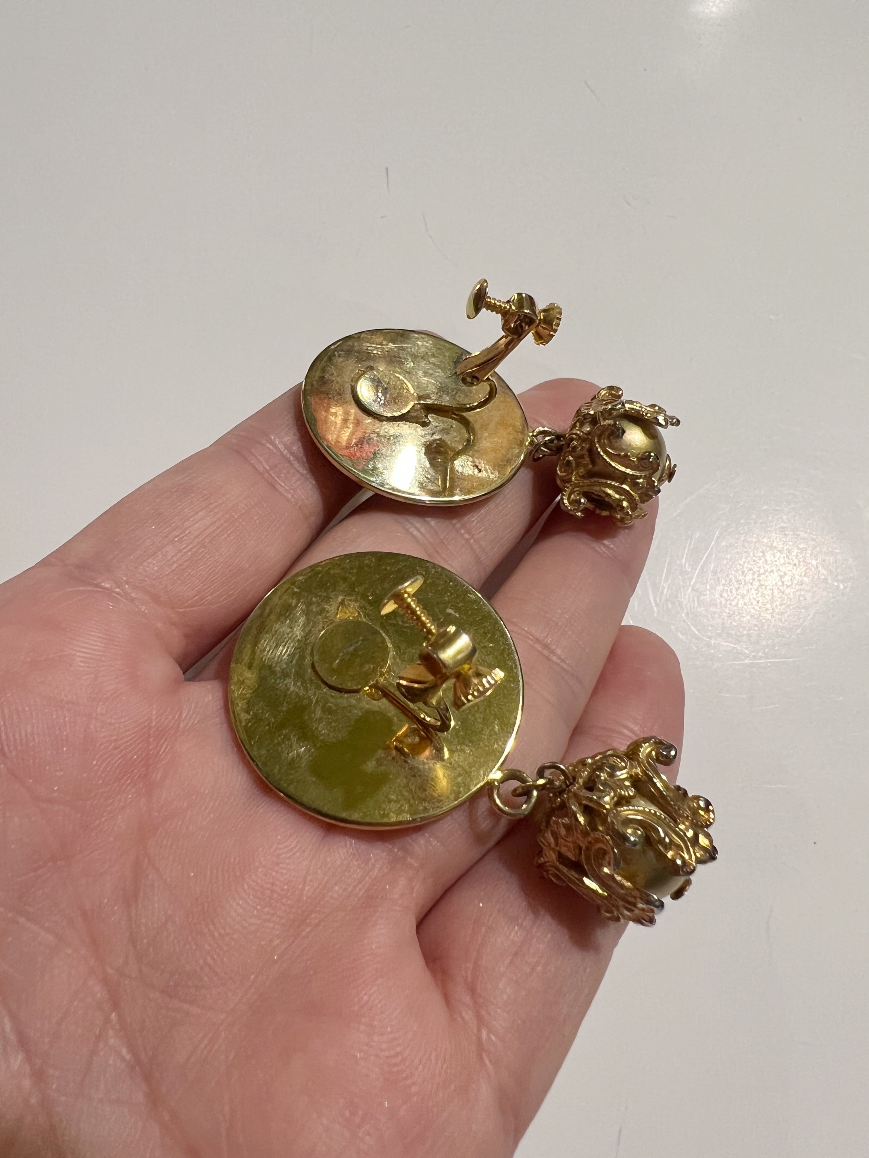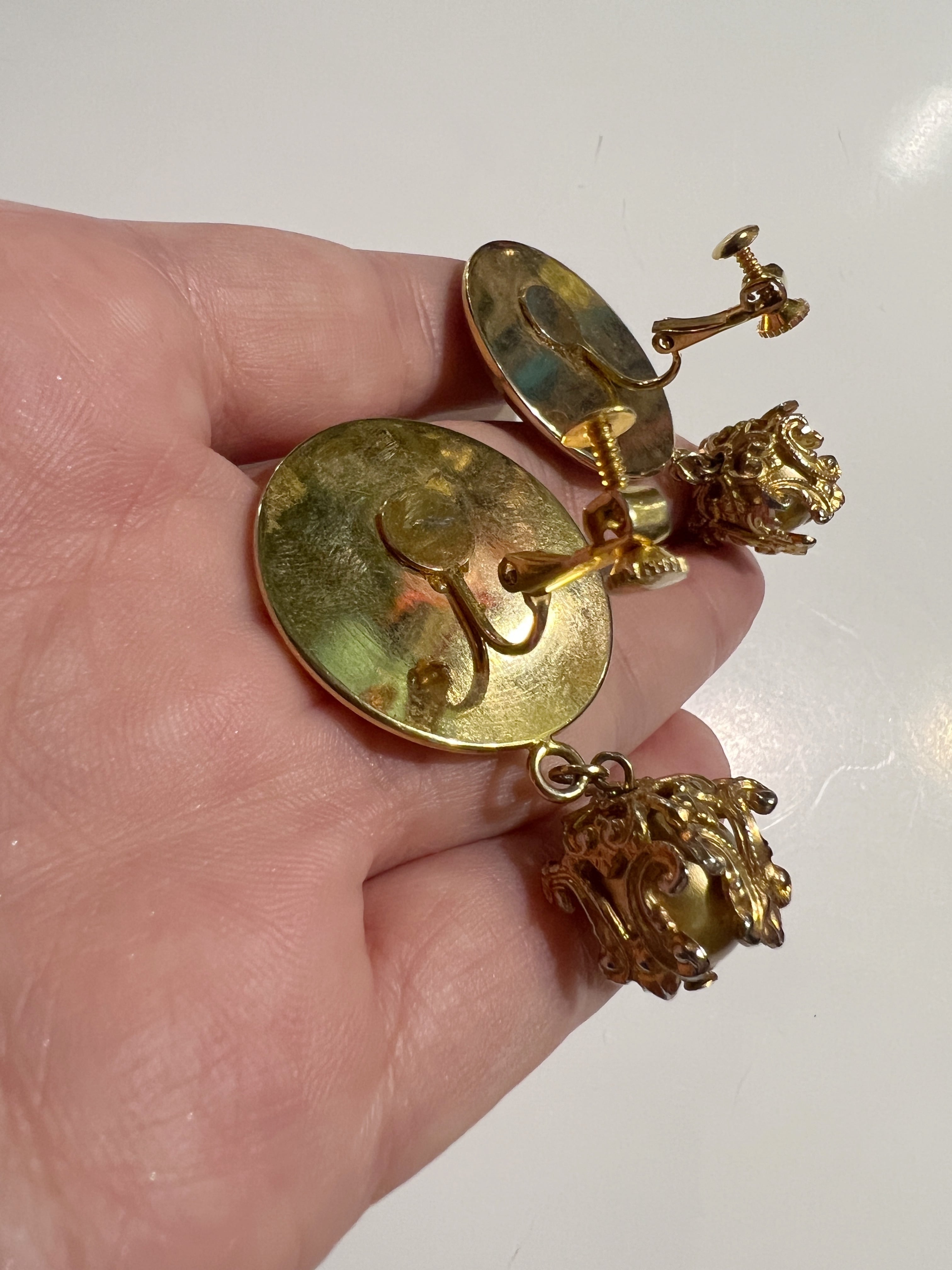 80s -90s Ornament Medallion & Baroque Pearl Drop Earrings