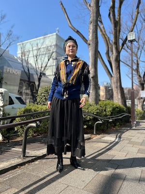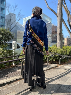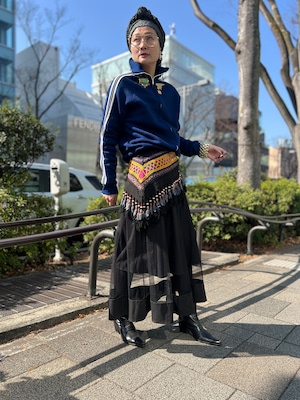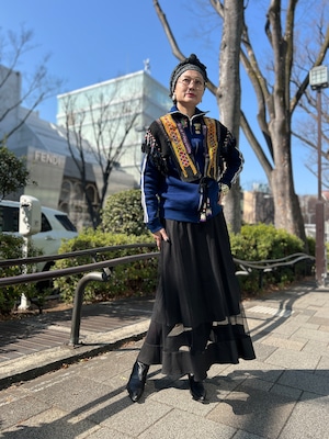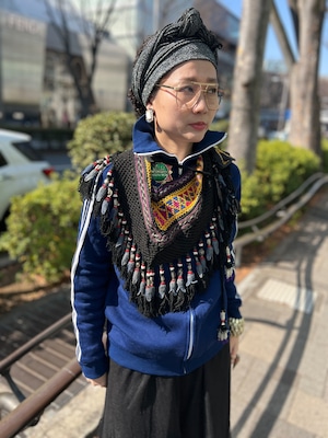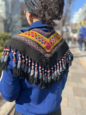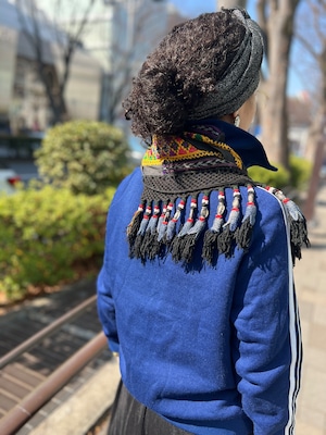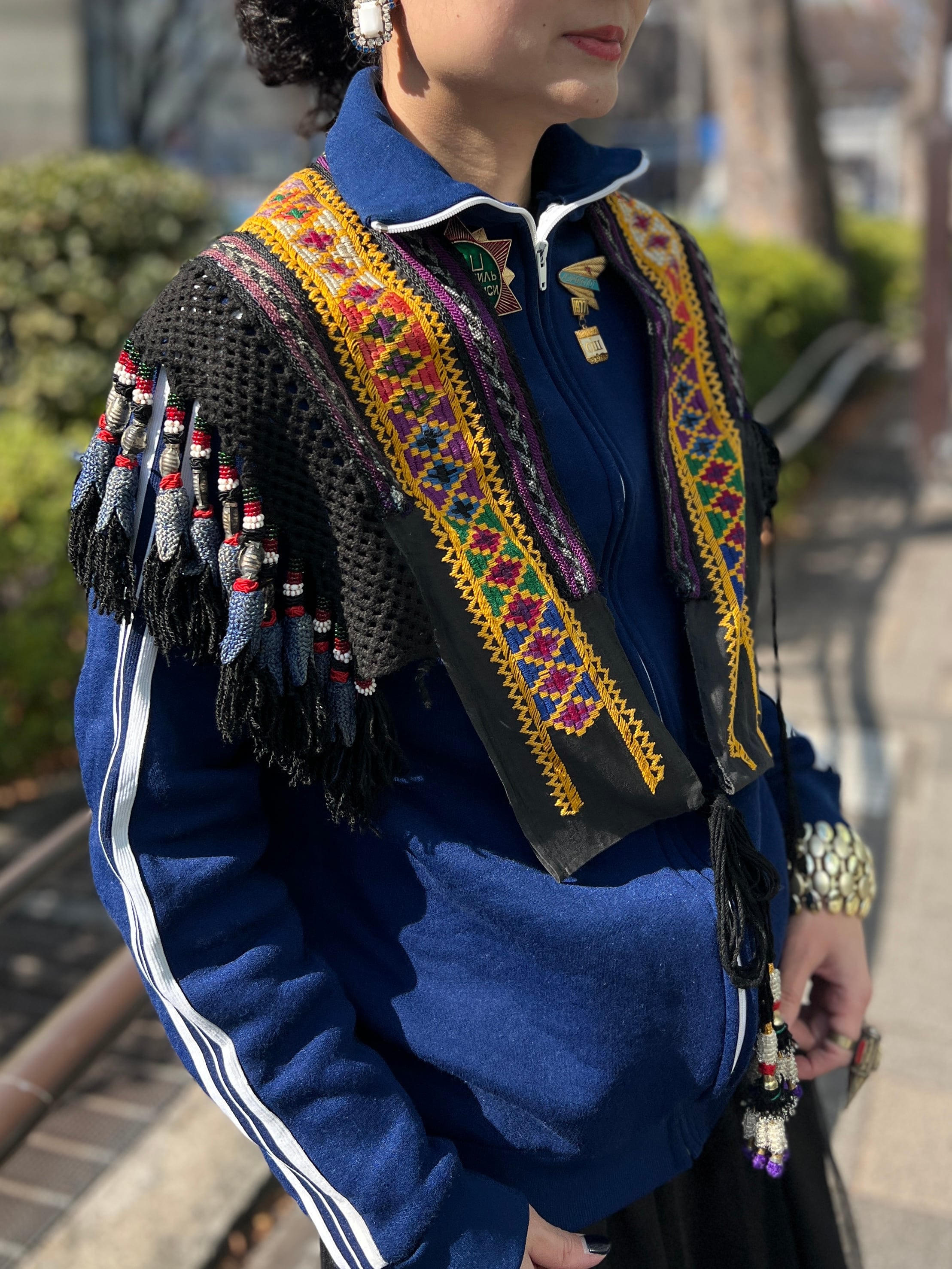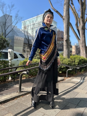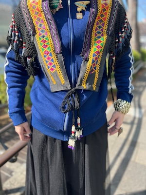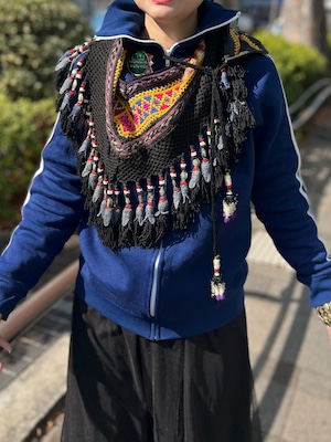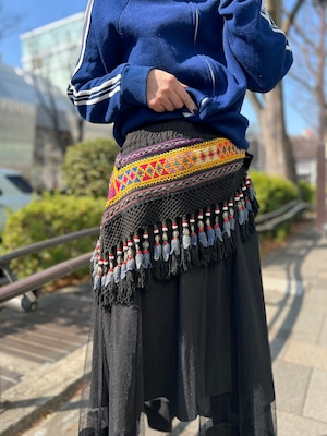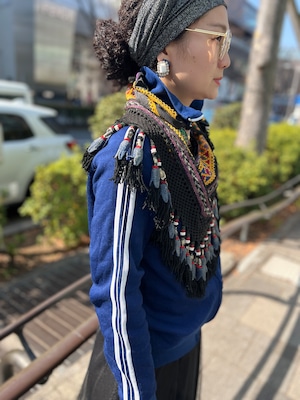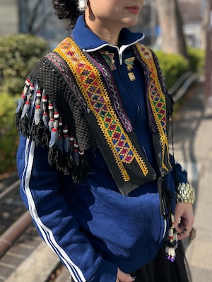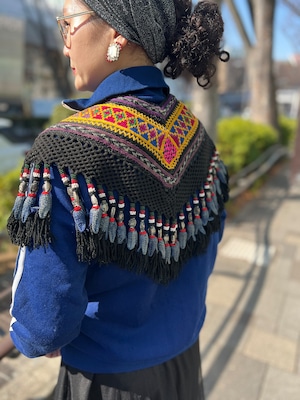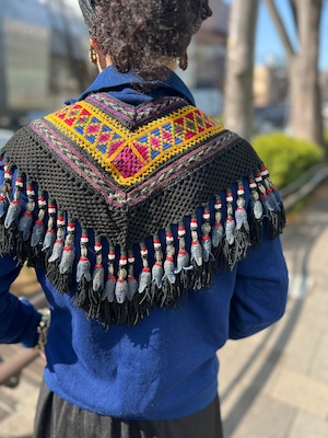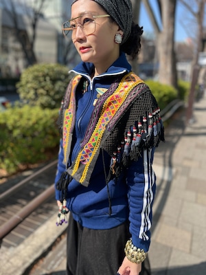 こちらは ジオメトリック の手刺繍と、たっぷり揺れるフリンジ、ビーズやメタル装飾が組み合わさった存在感のある一点。