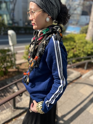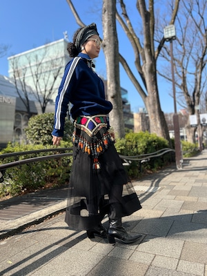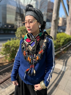 こちらは ブラックコットン生地に花柄の手刺繍刺繍と、たっぷり揺れるフリンジ、ビーズやメタル装飾が組み合わさった存在感のある一点。