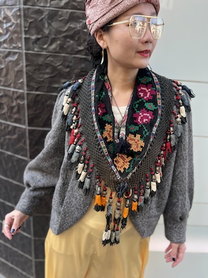 こちらは 花柄刺繍と、たっぷり揺れるフリンジ、ビーズやメタル装飾が組み合わさった存在感のある一点。