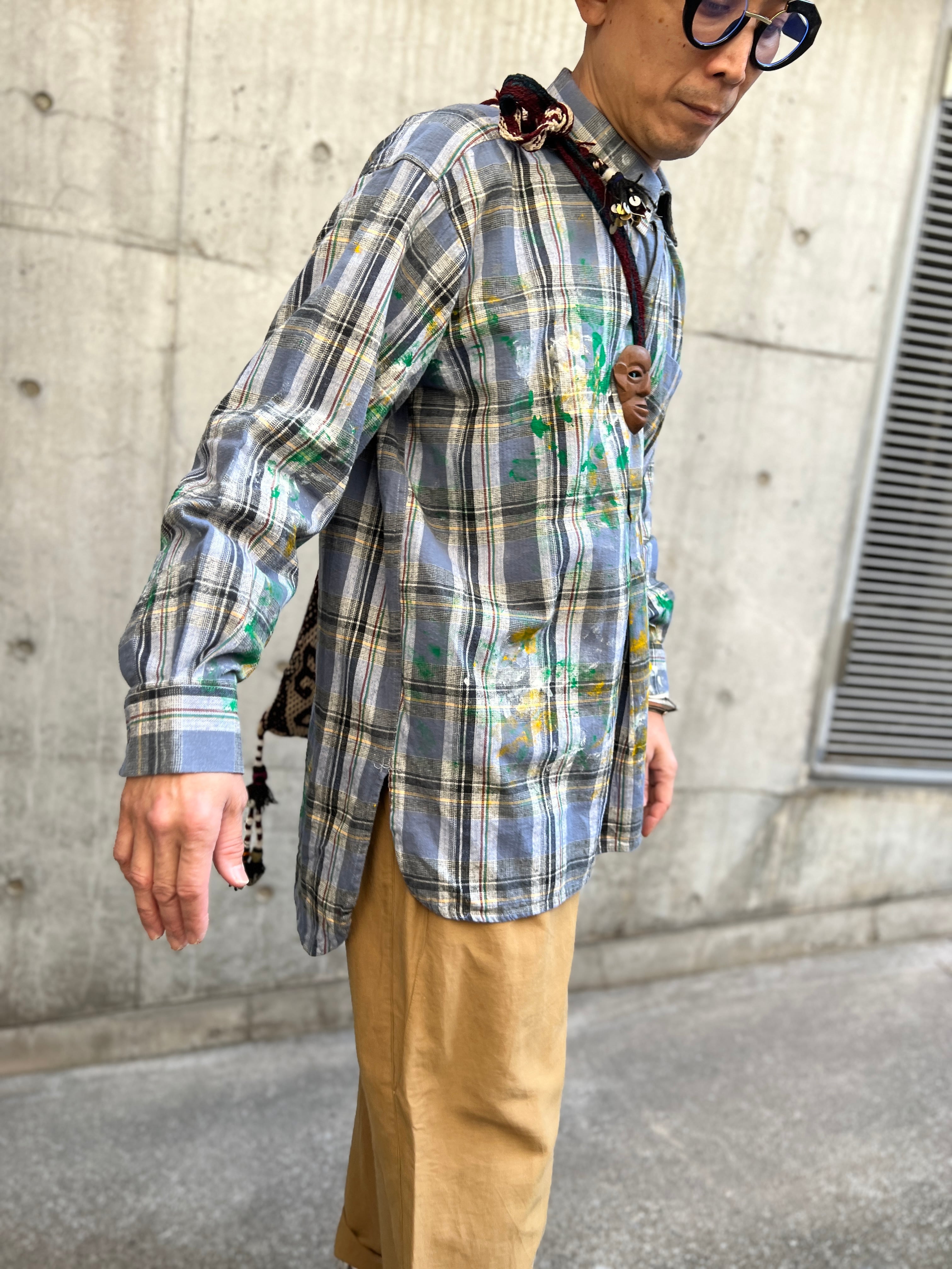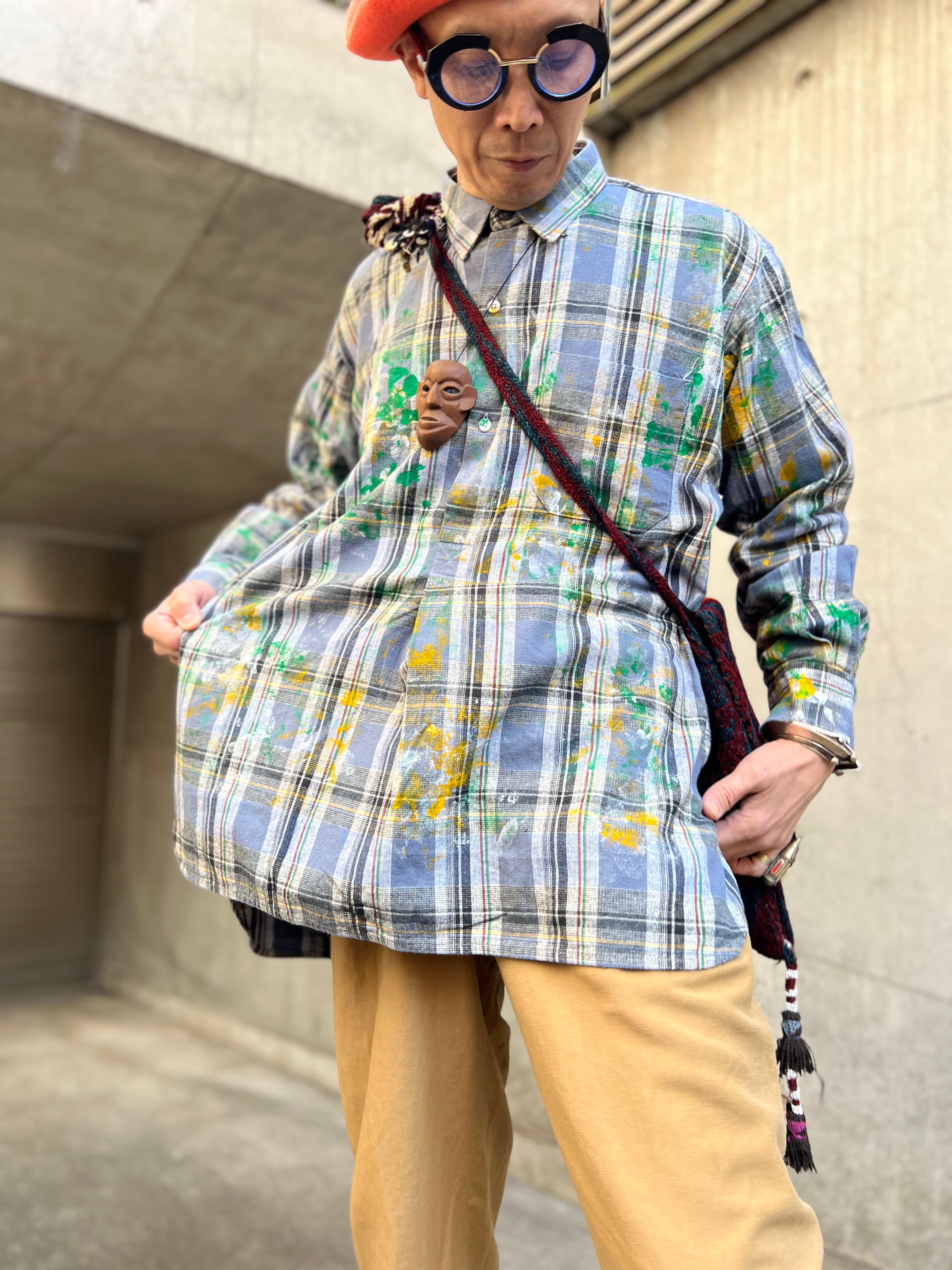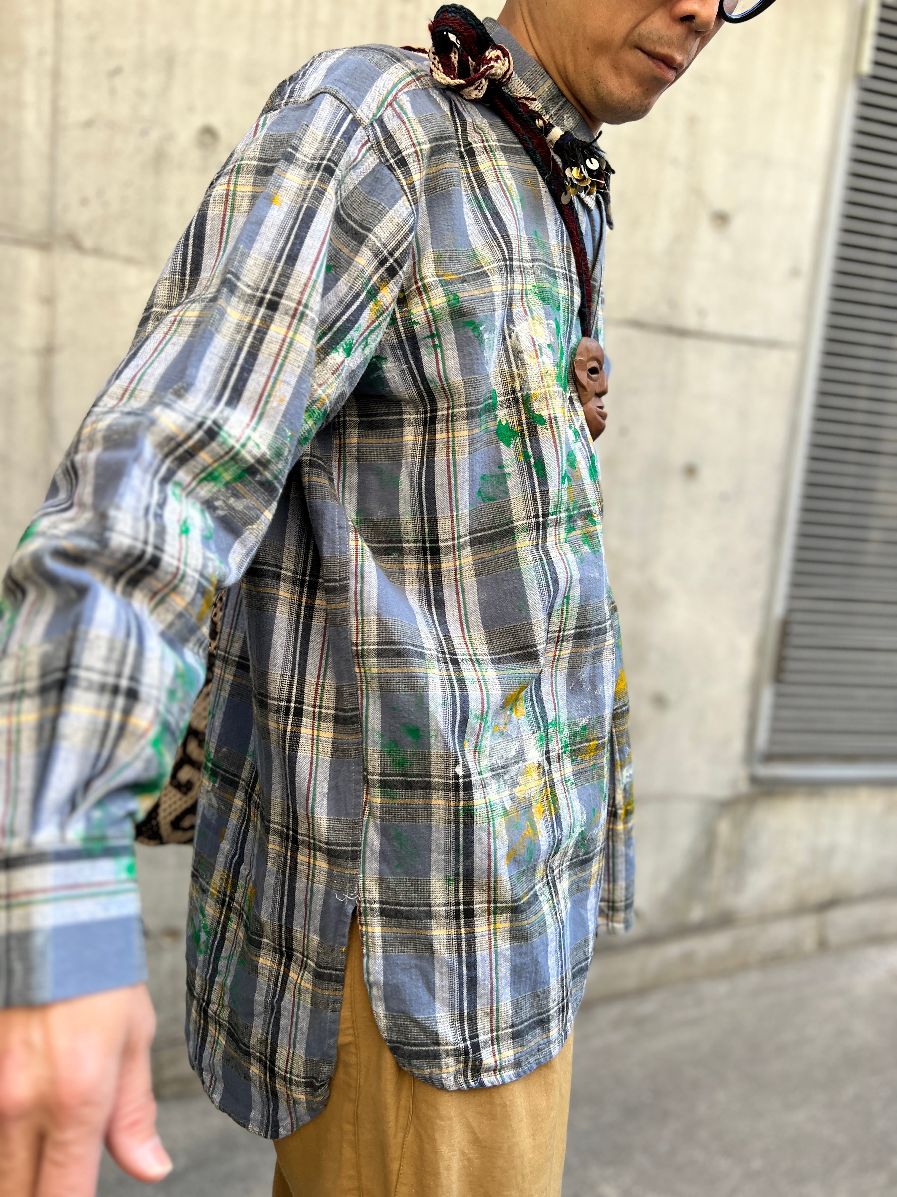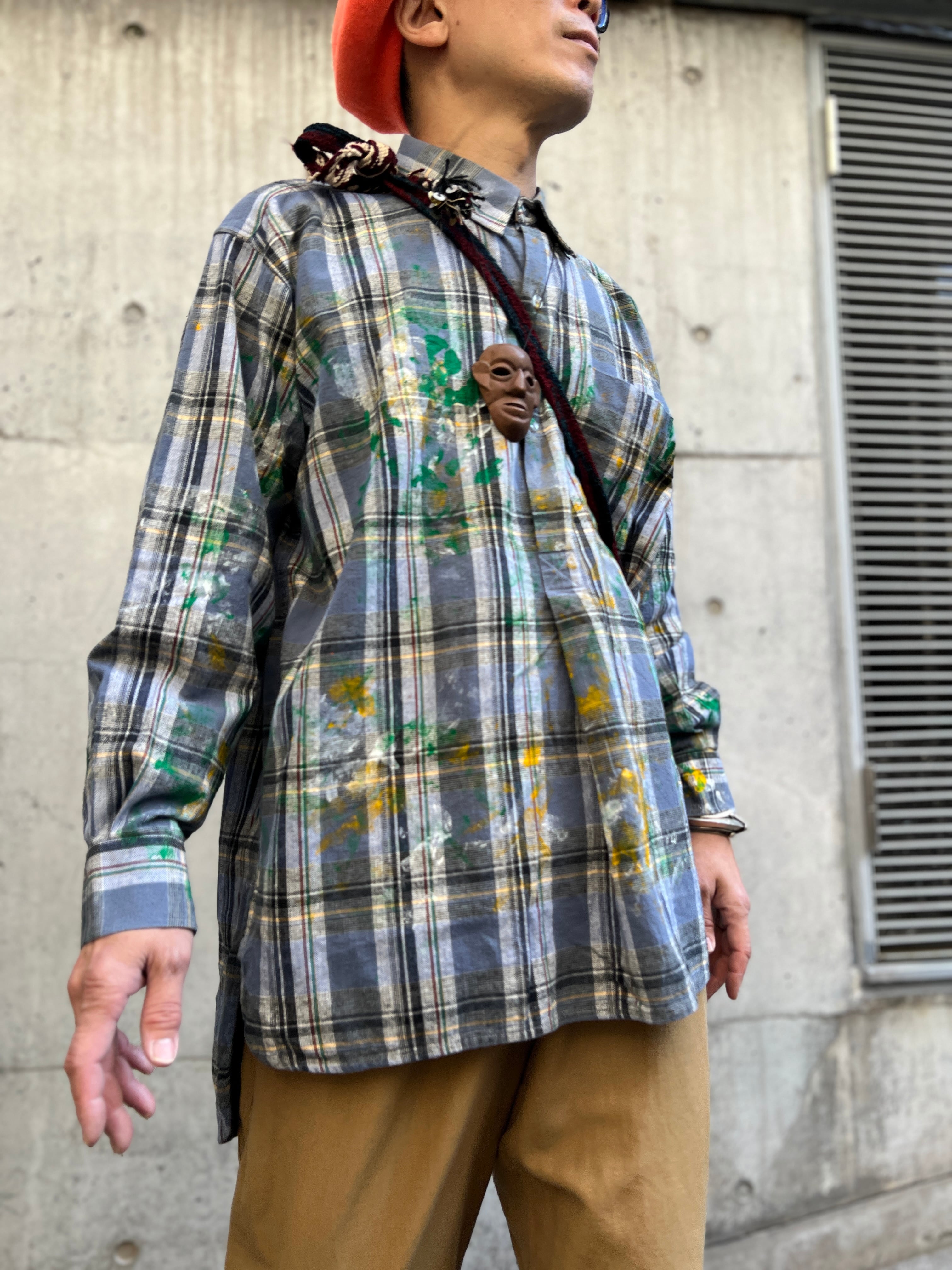 ヴィンテージのプルオーバーグランパコットンシャツのグッドボディーに、1点1点その個体に合わせて施された