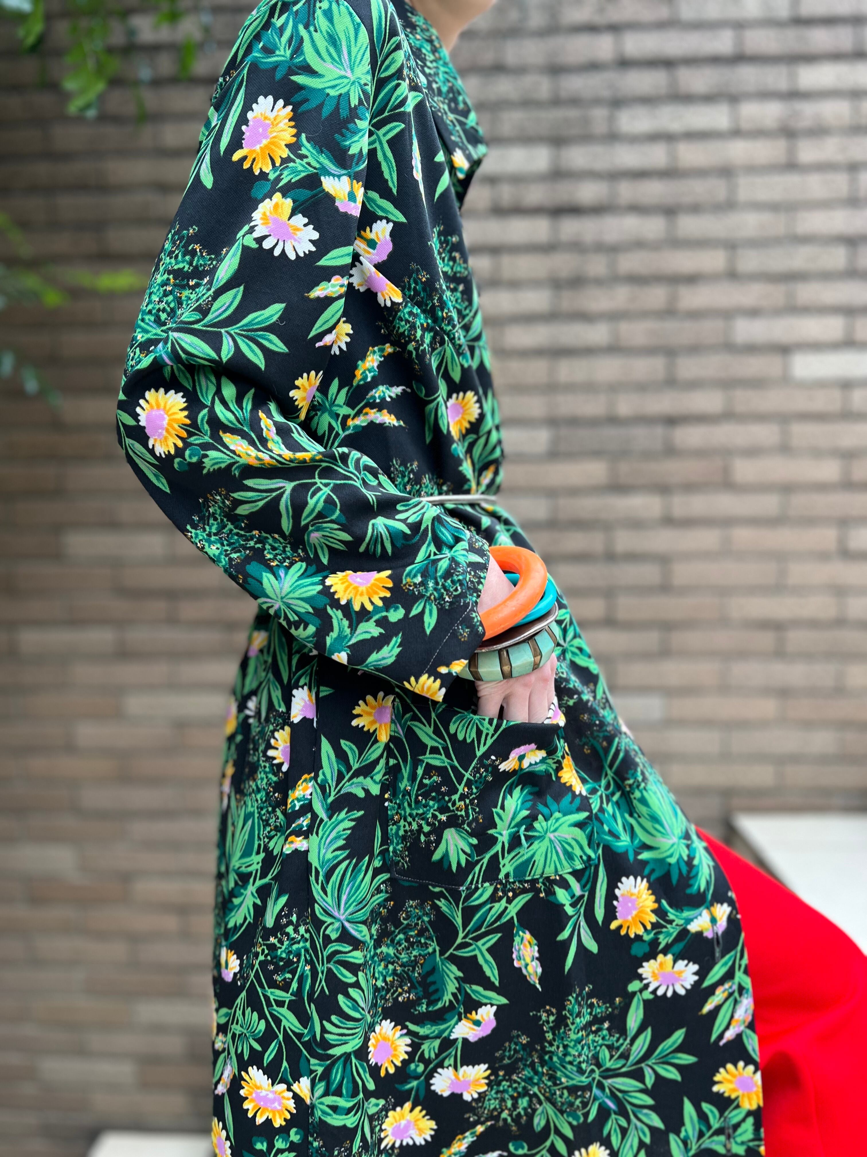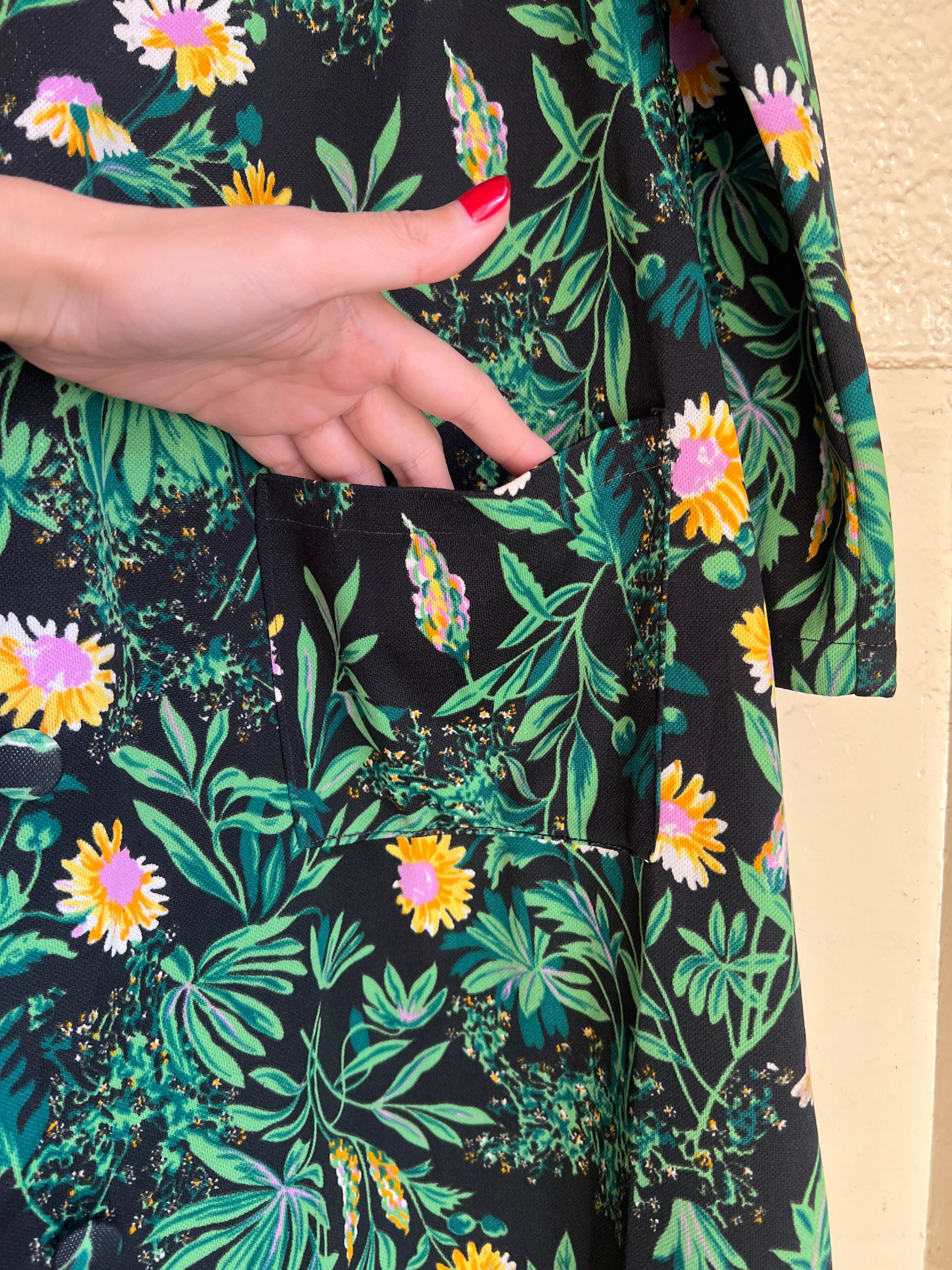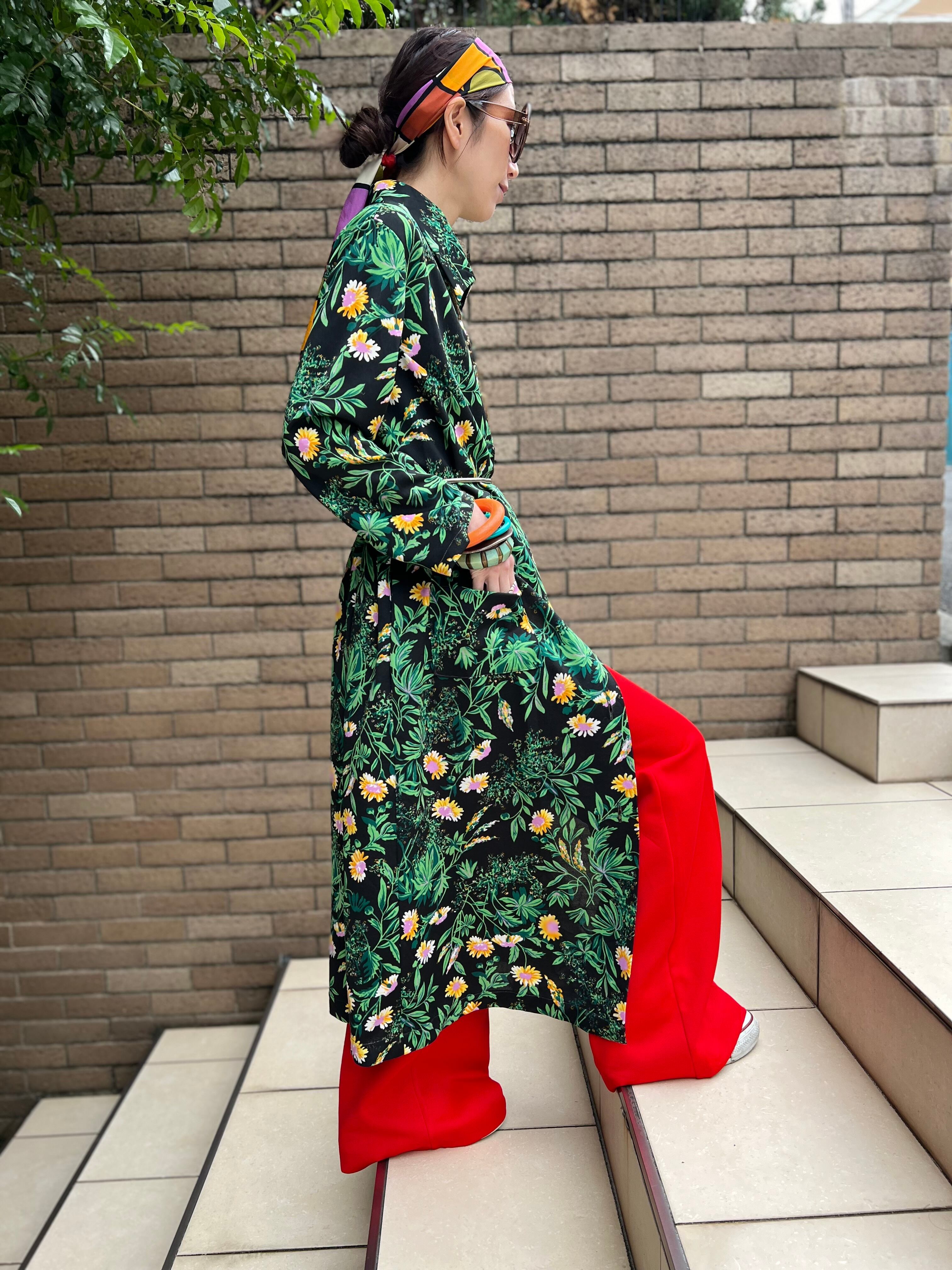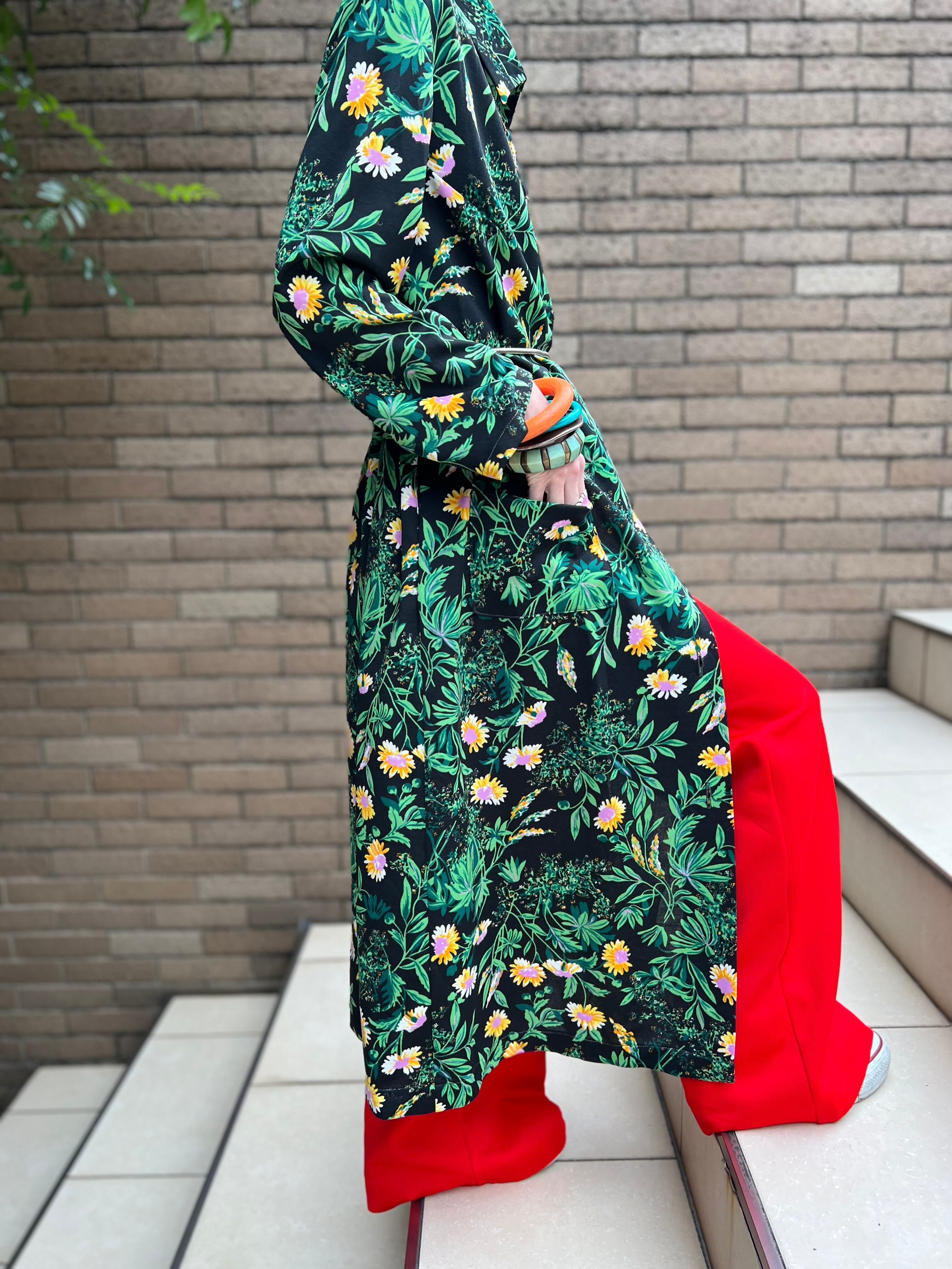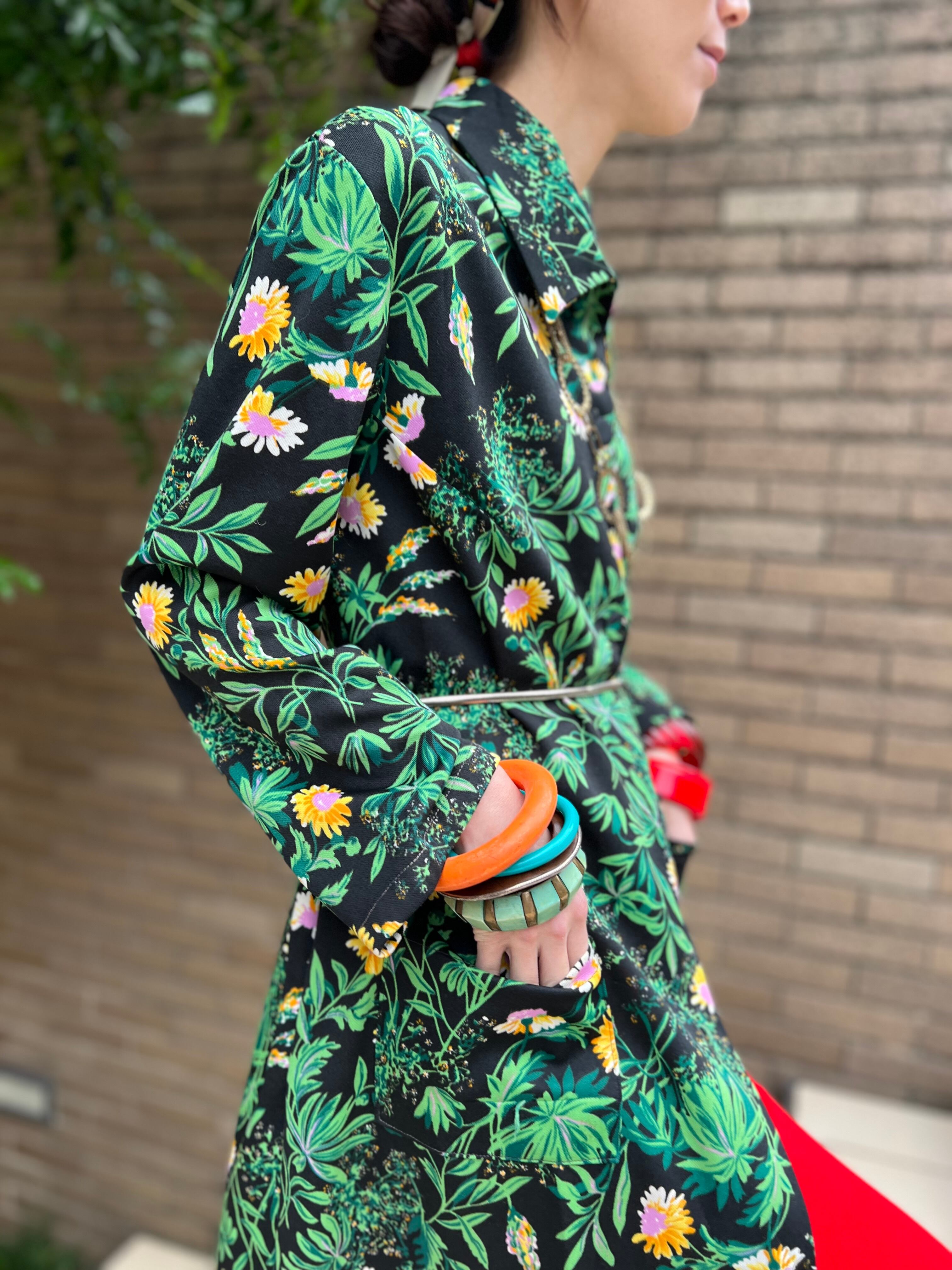 70年代 ブラック × グリーン 花柄 ポリ 羽織りワンピースになります。