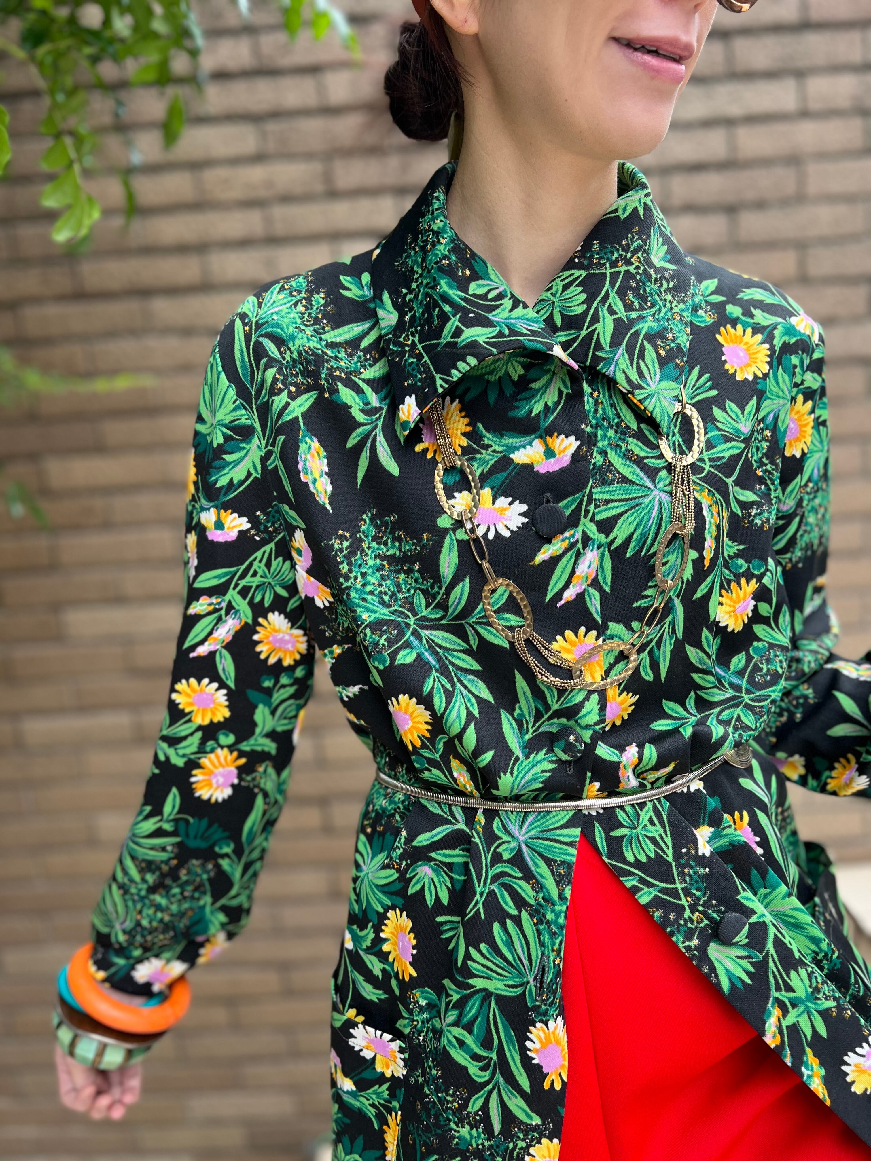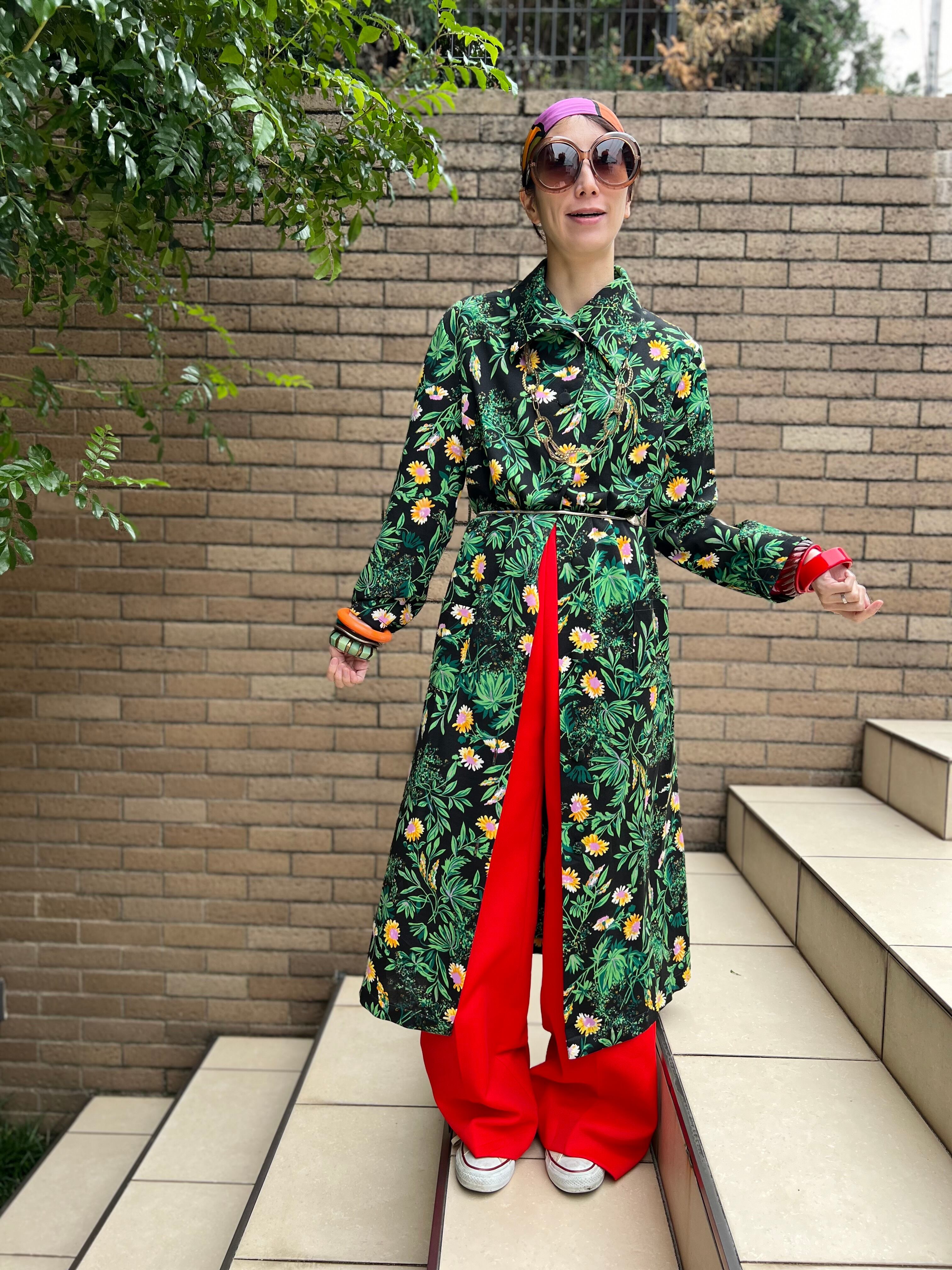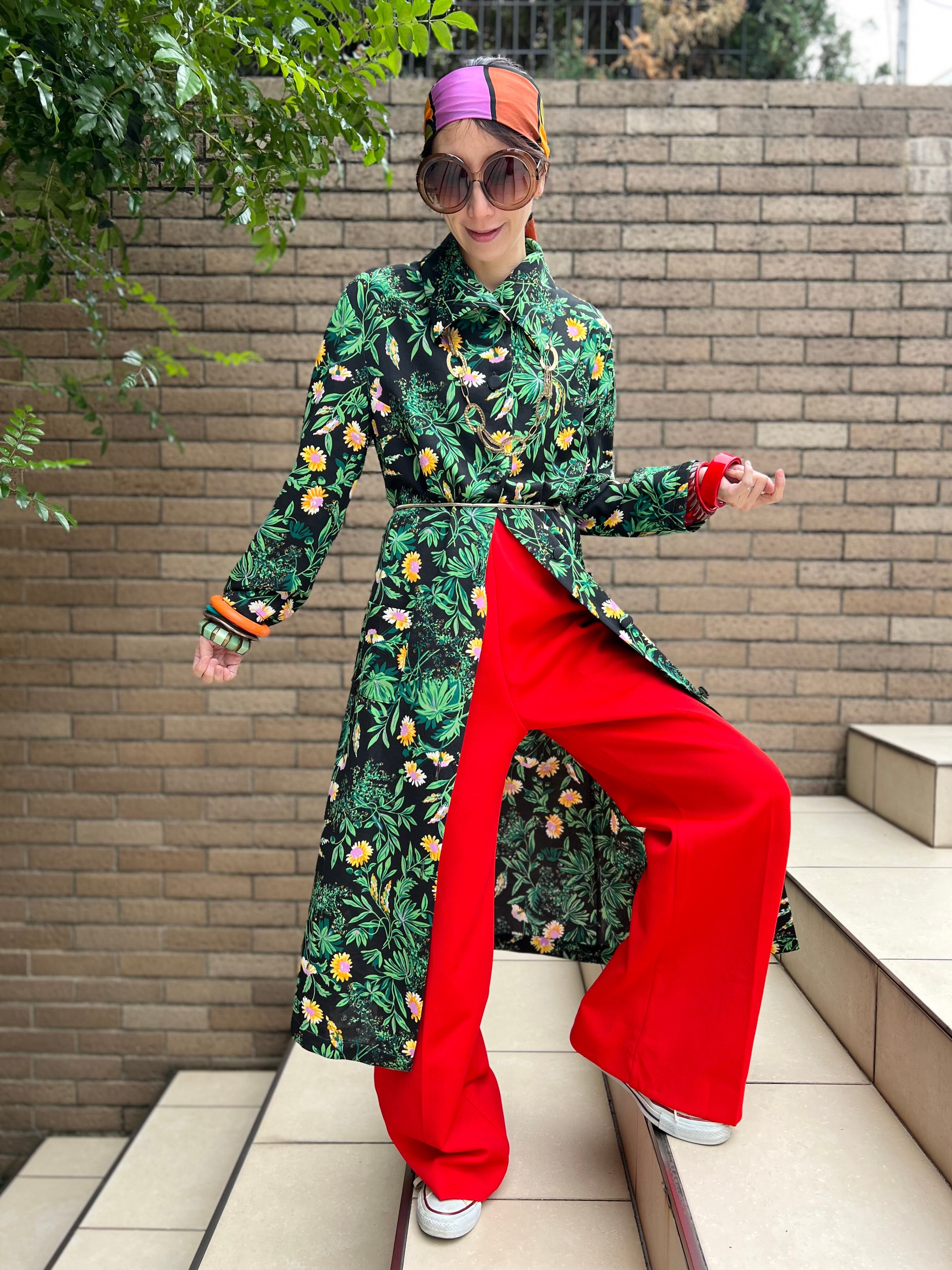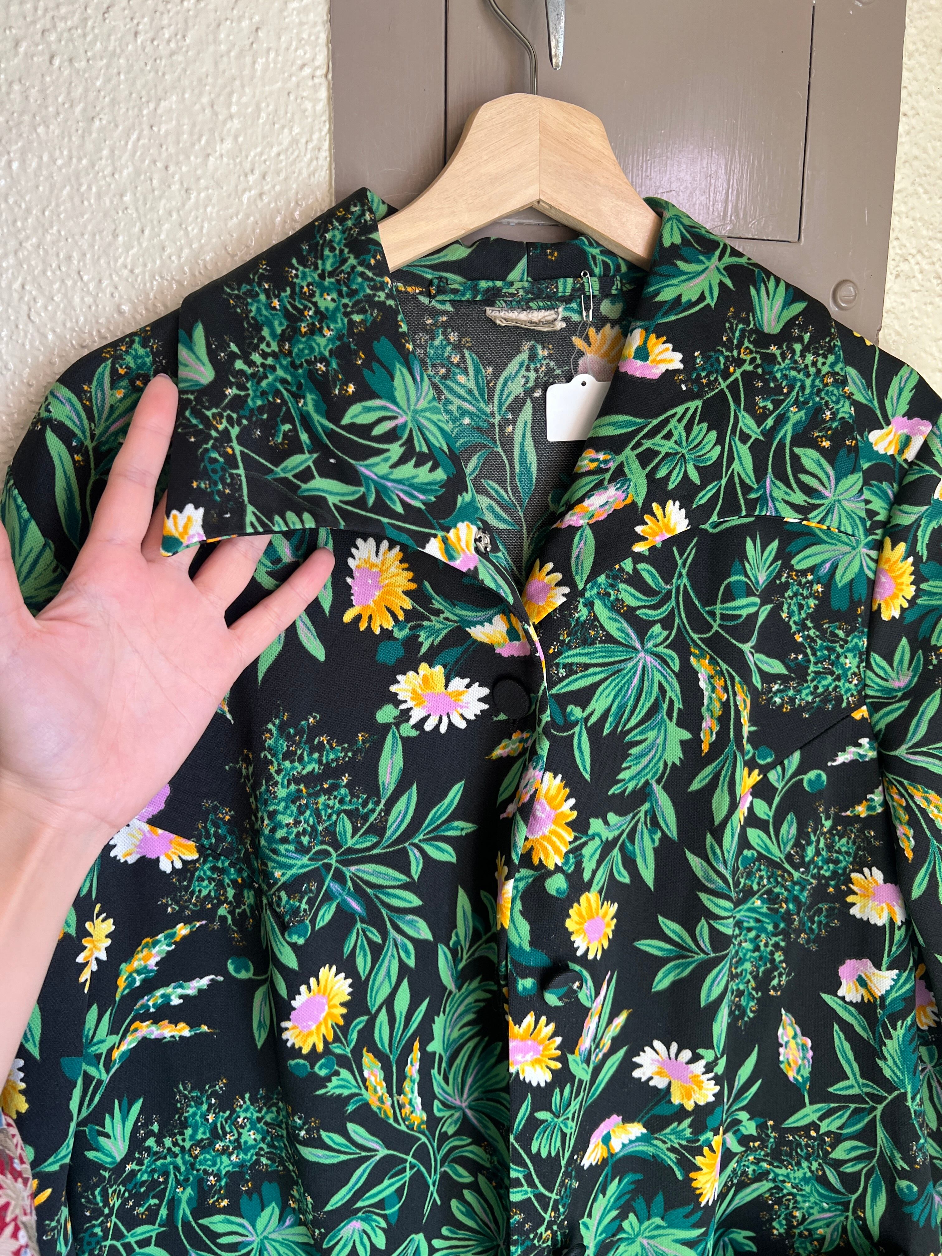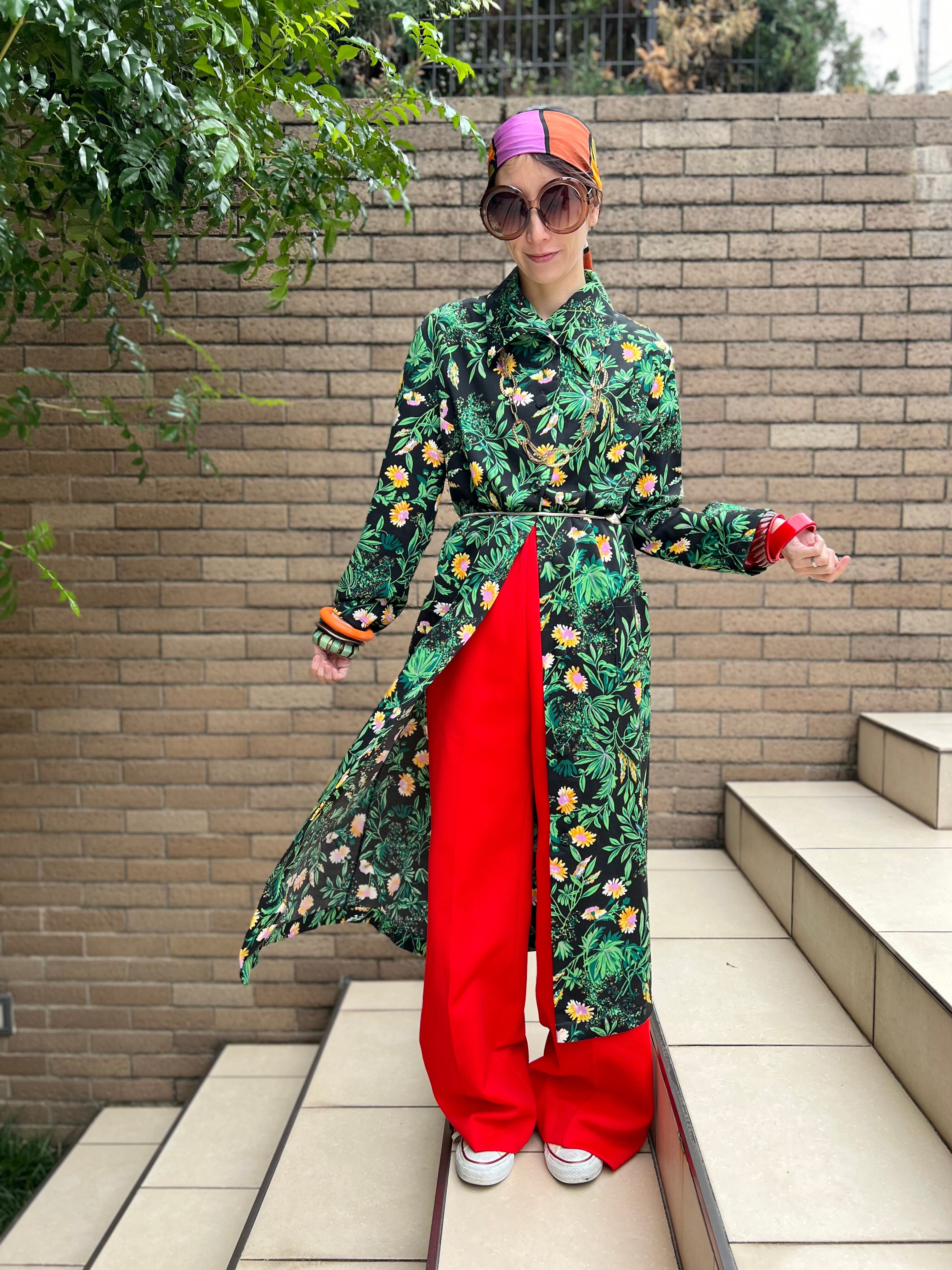 70年代 ブラック × グリーン 花柄 ポリ 羽織りワンピースになります。