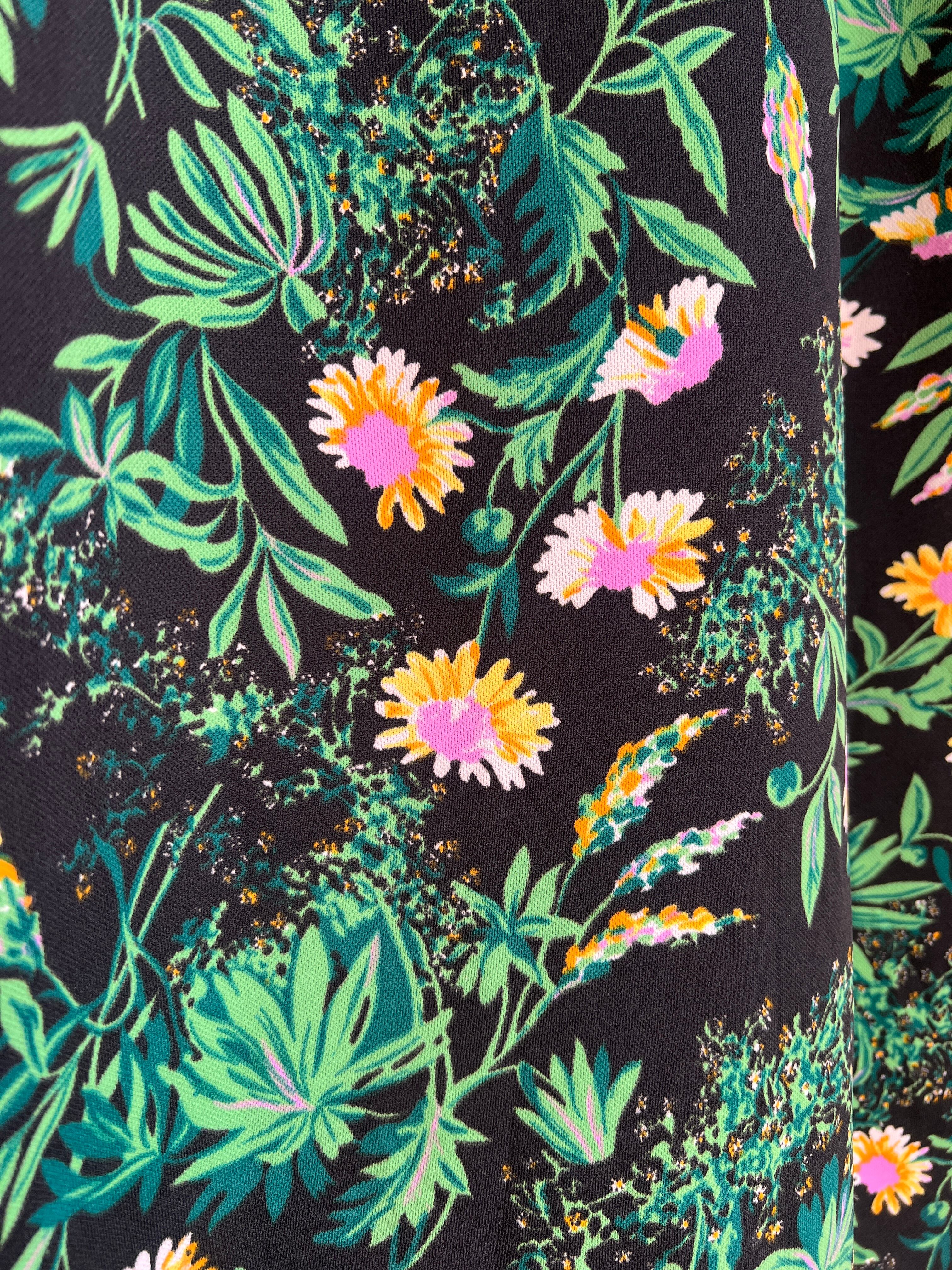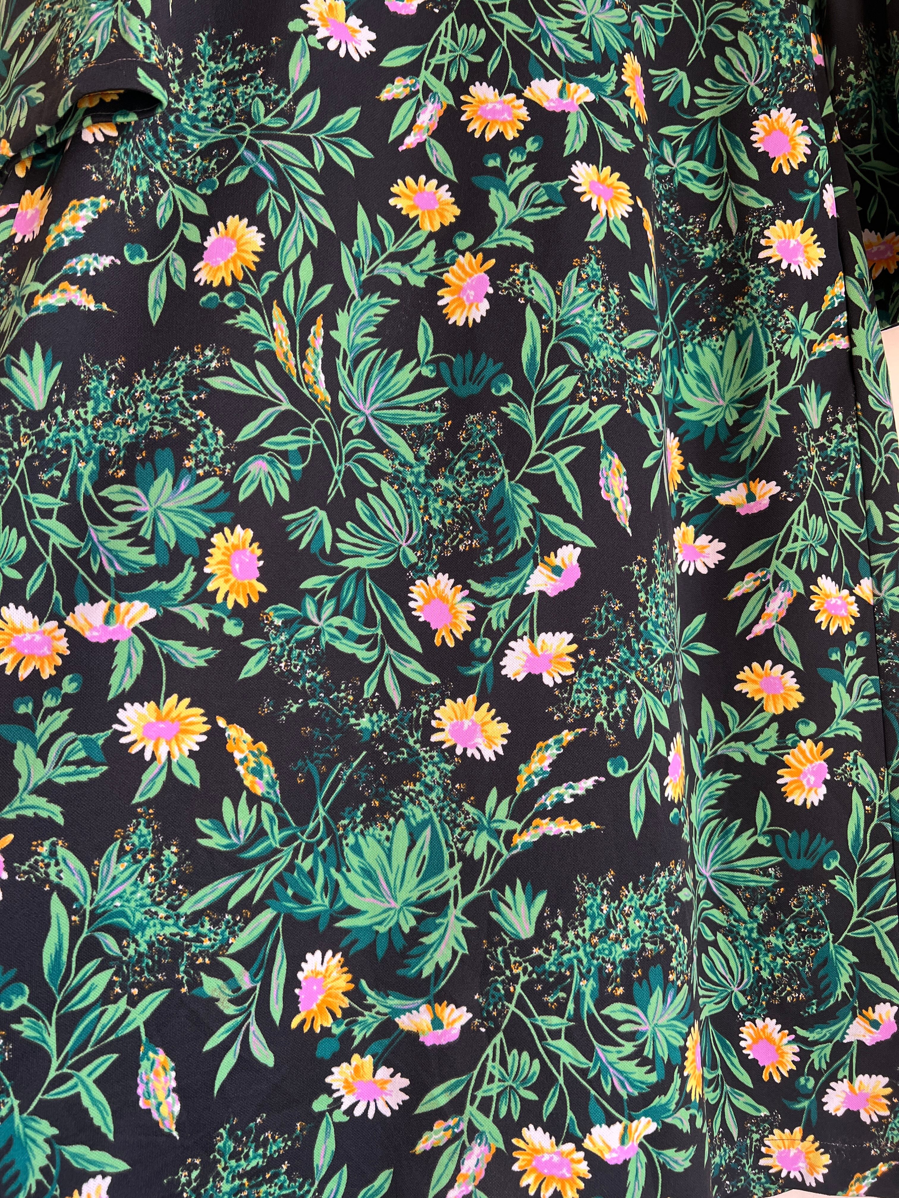 ブラックベースに、グリーン、イエロー、ラベンダー、ホワイトの配色のよい花柄のテキスタイルのよいしっかりとした薄手めの生地感。