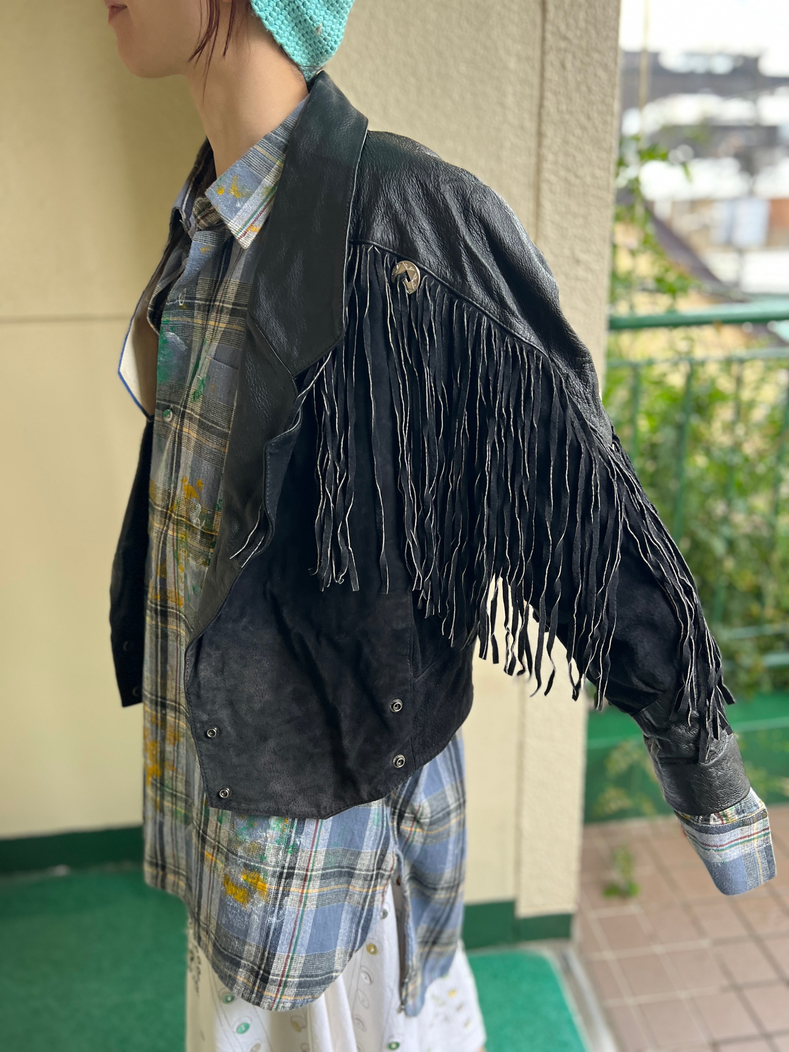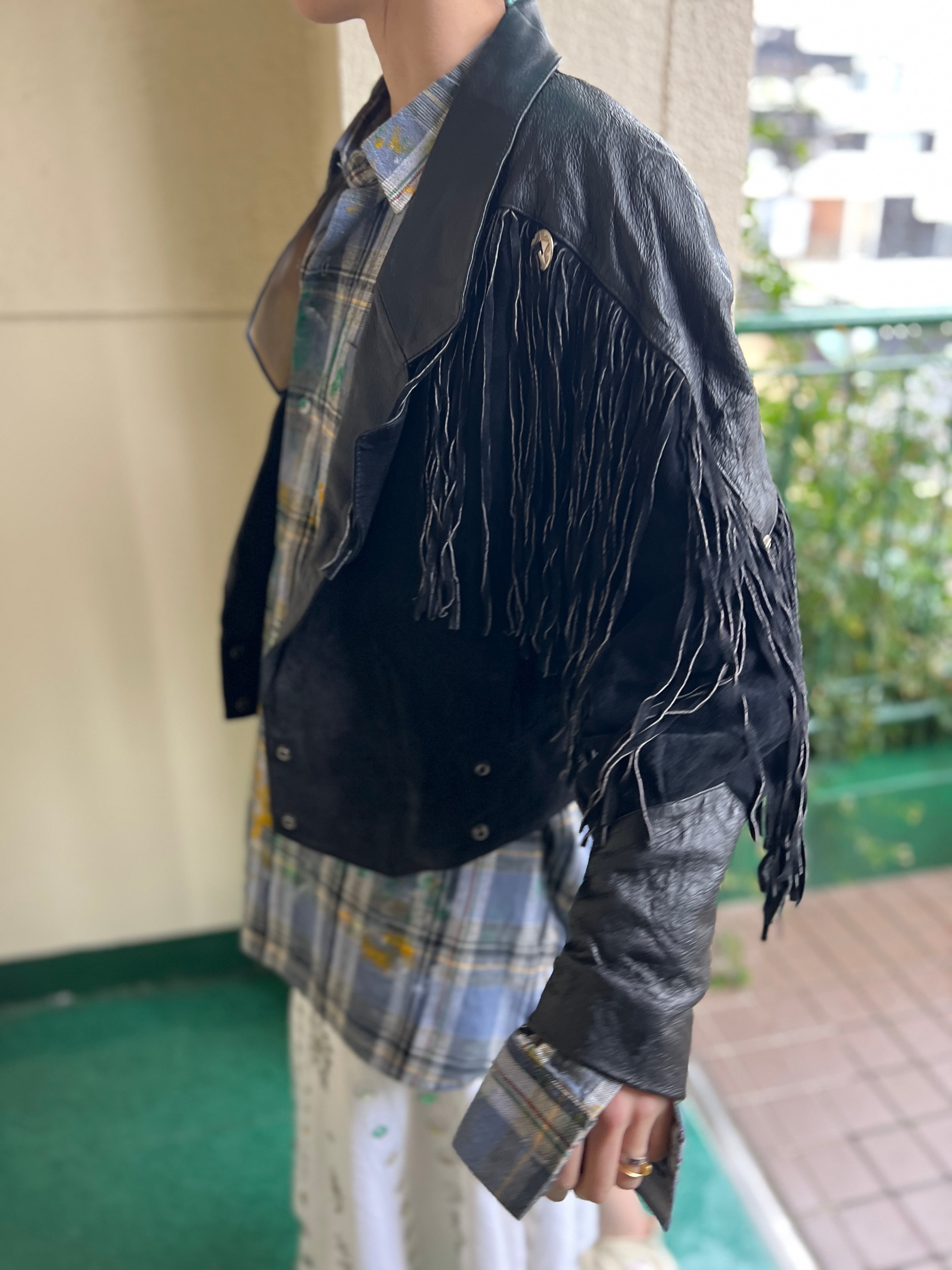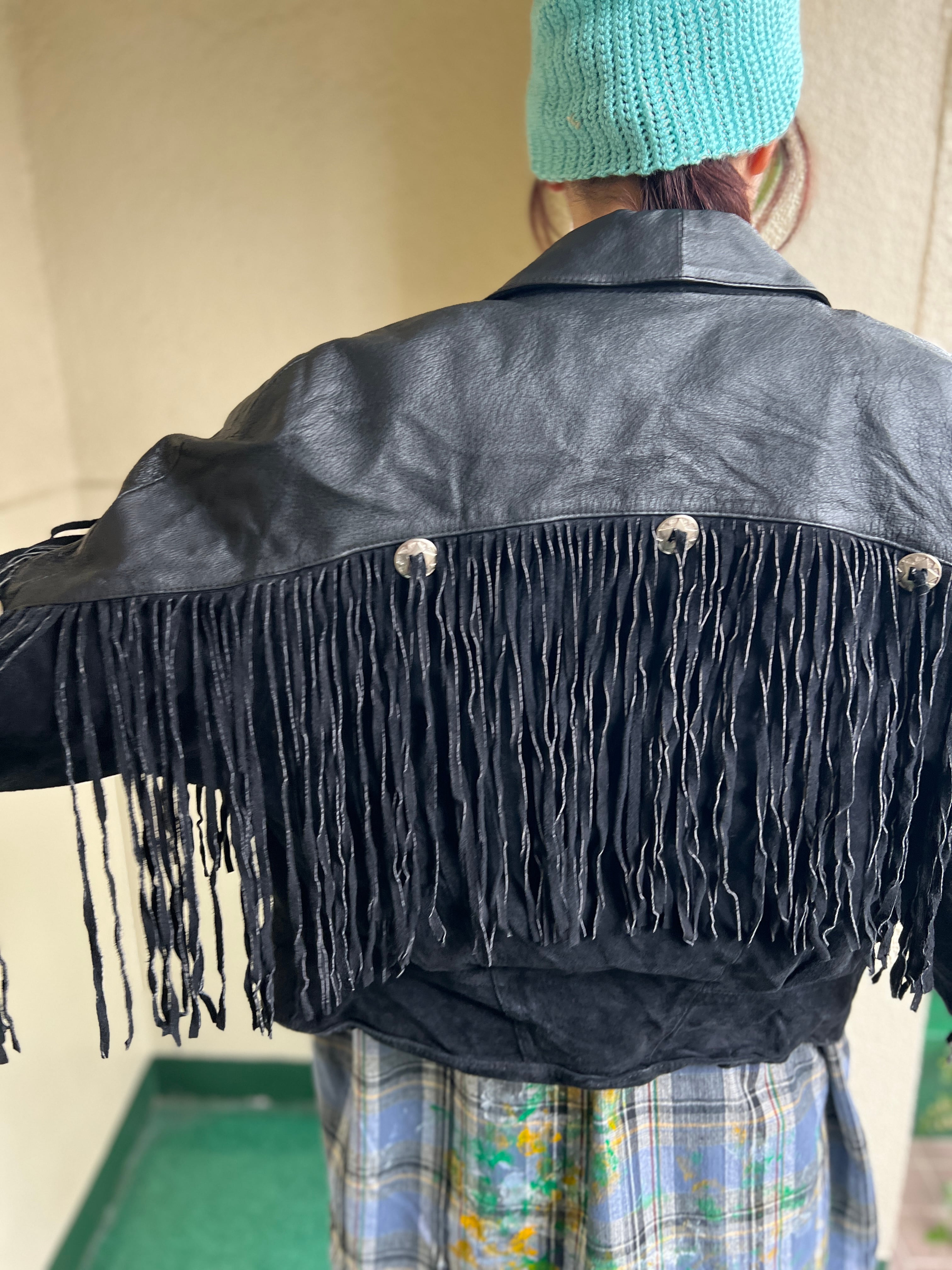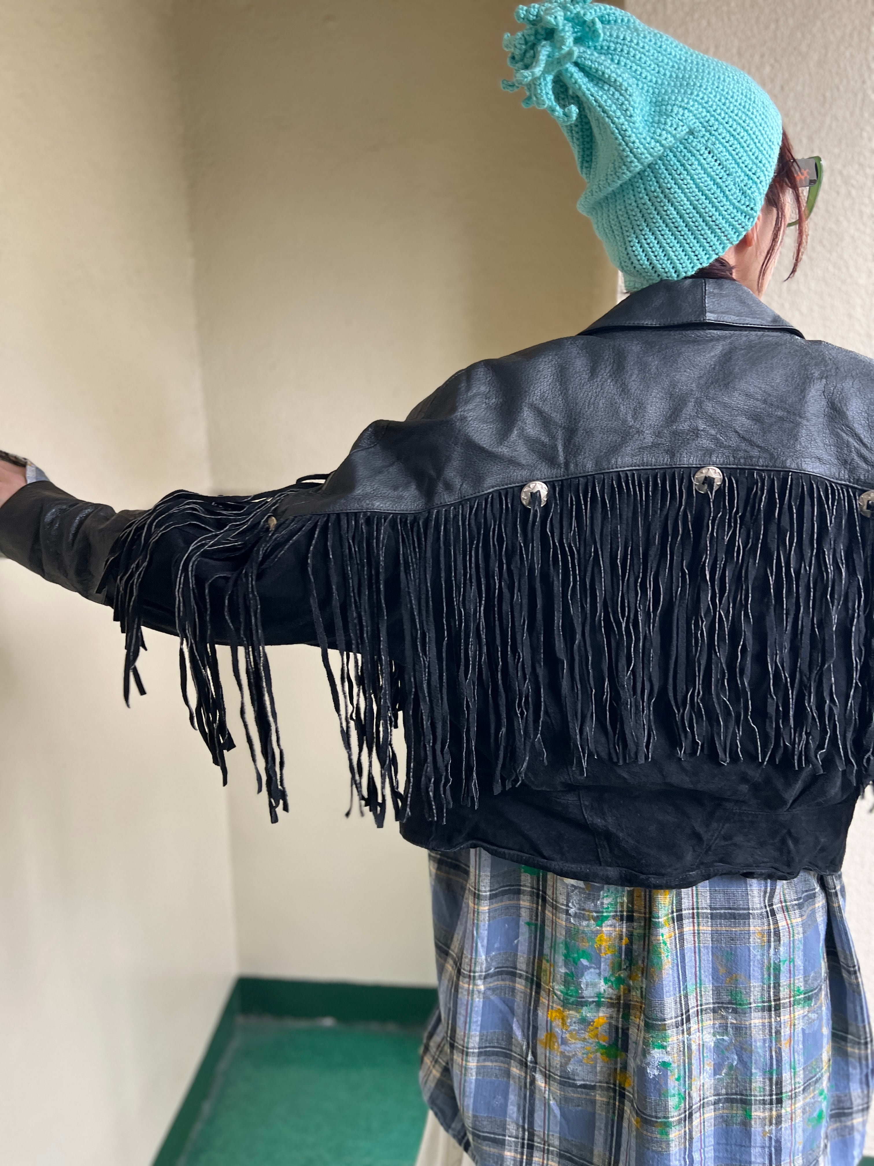 80s black leather fringe jacket