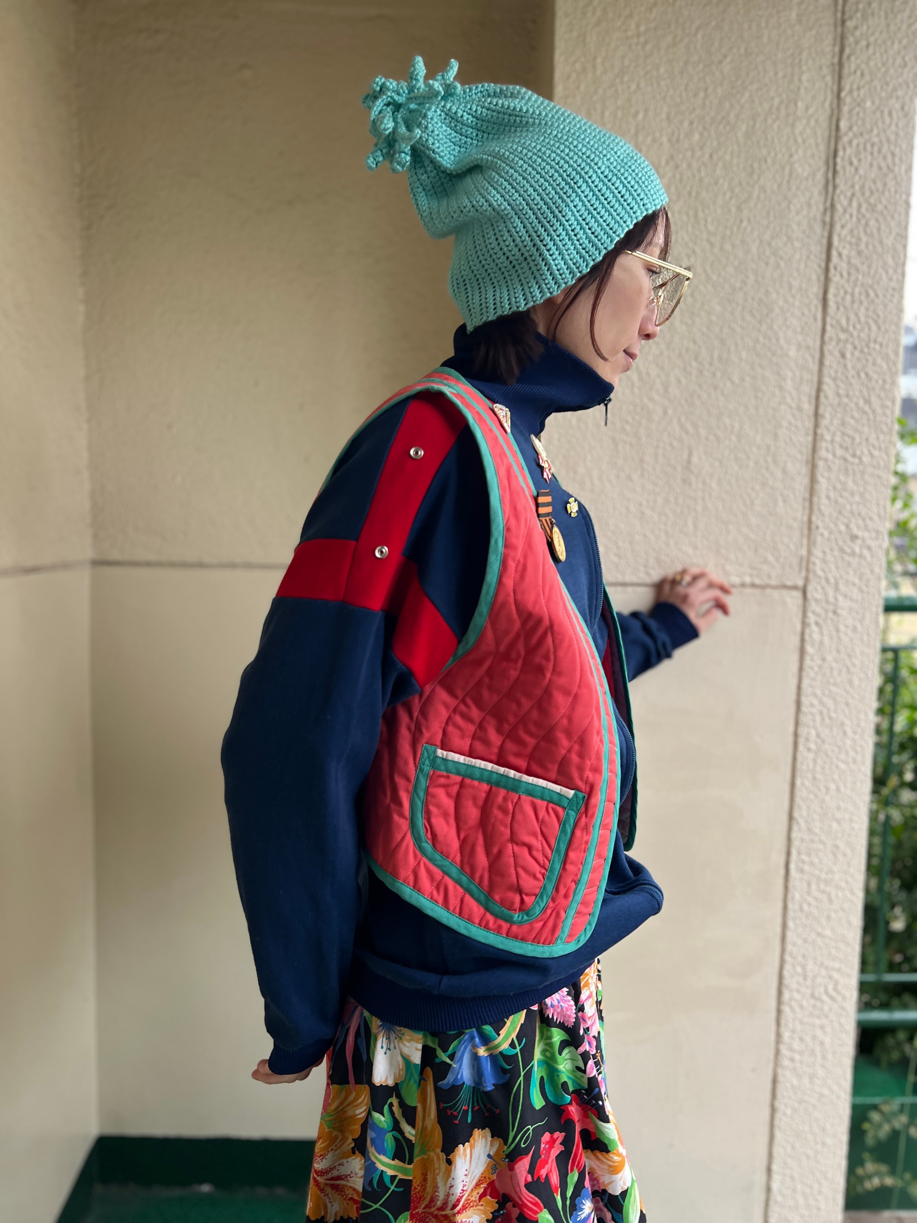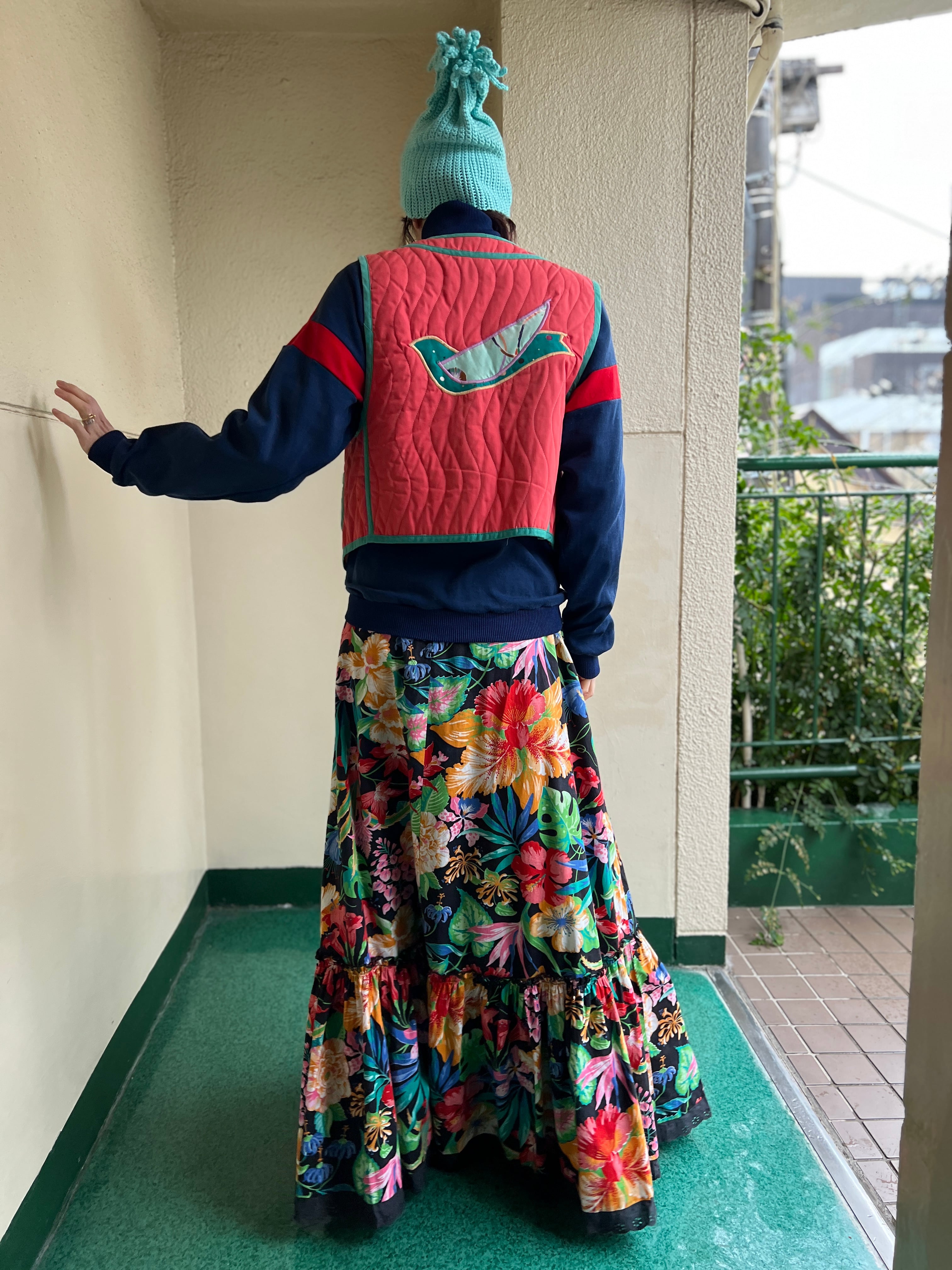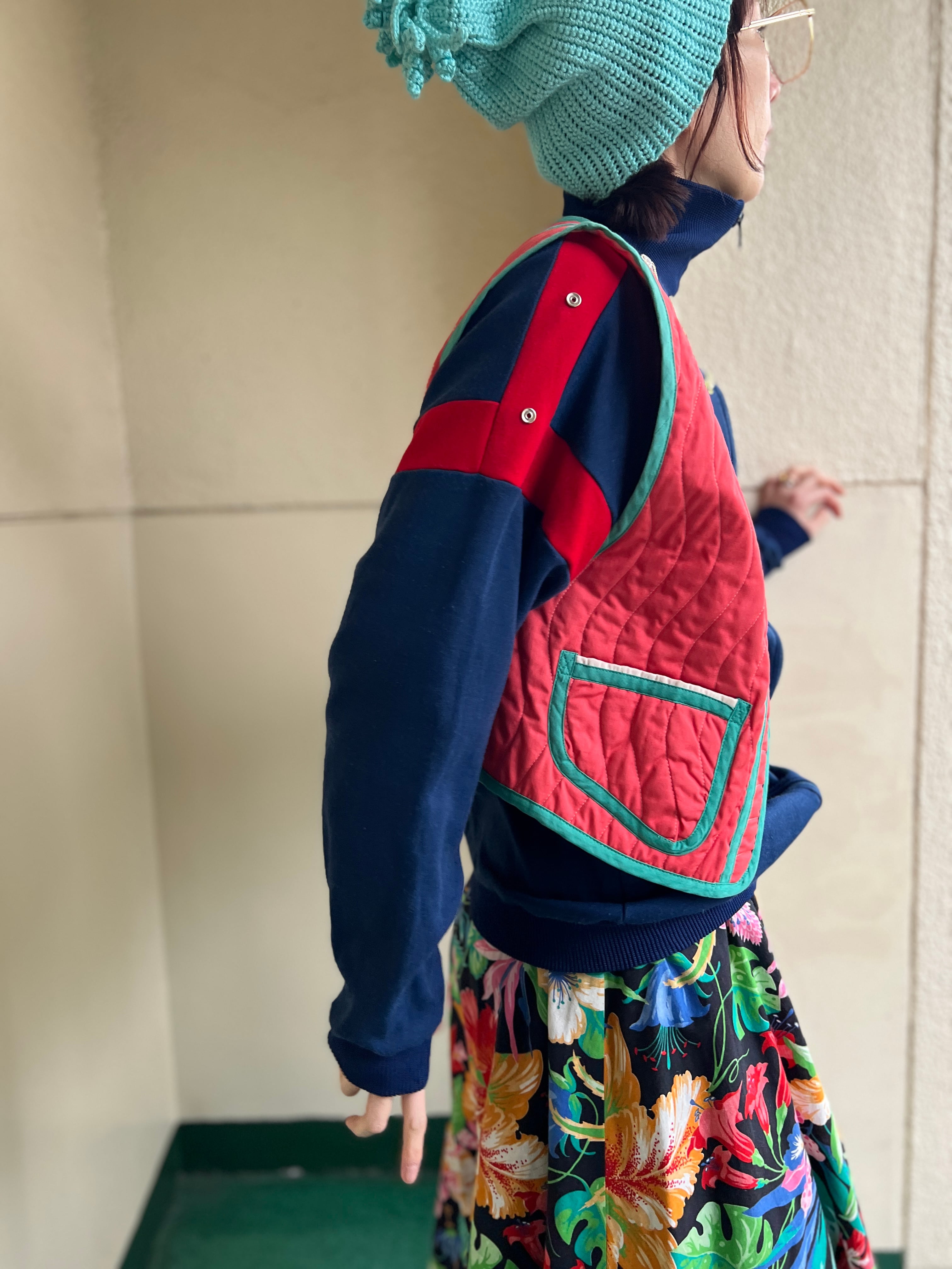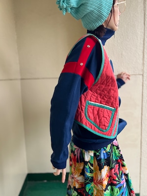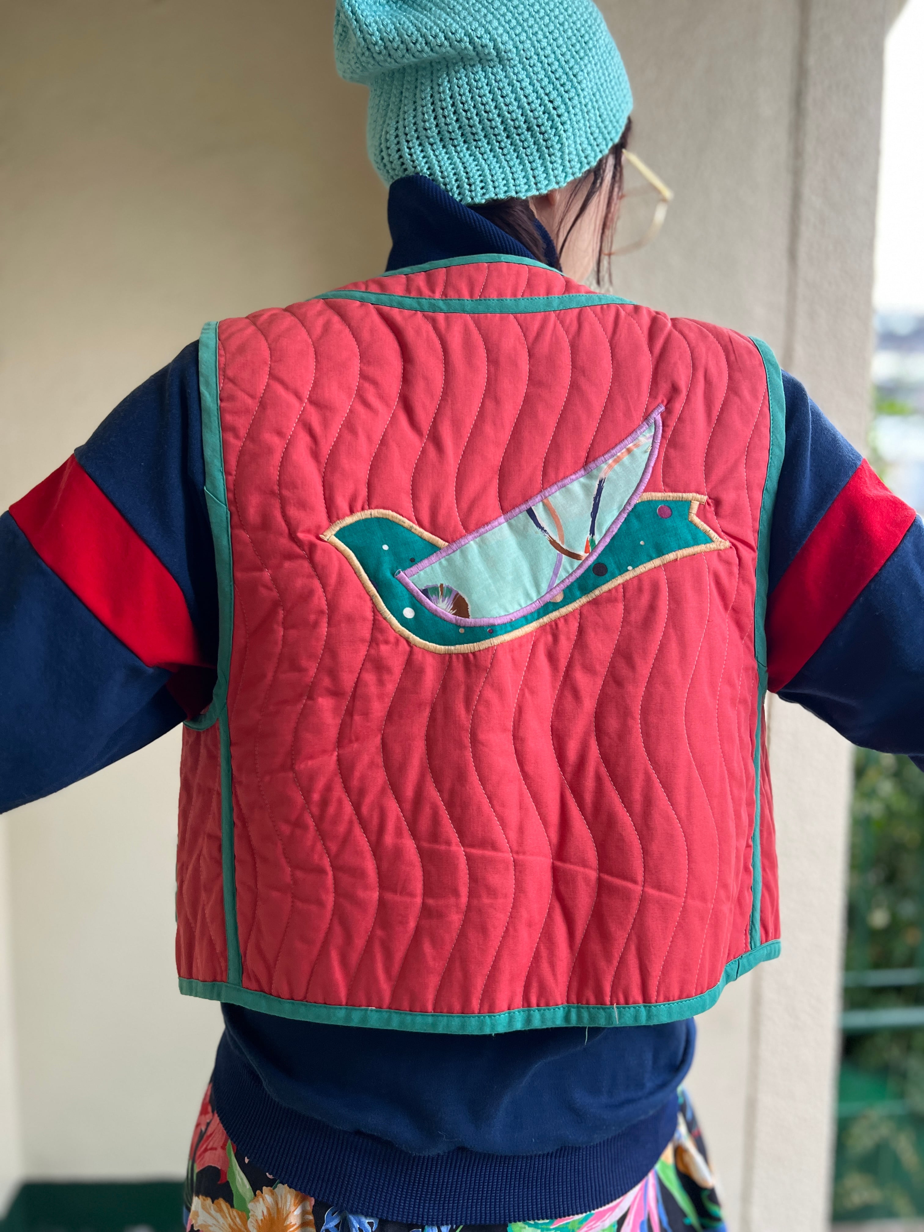 Jeanne Marc bird appliqué orange × moss green vest ( ジェーンマーク 鳥 アップリケ オレンジ × モスグリーン ベスト