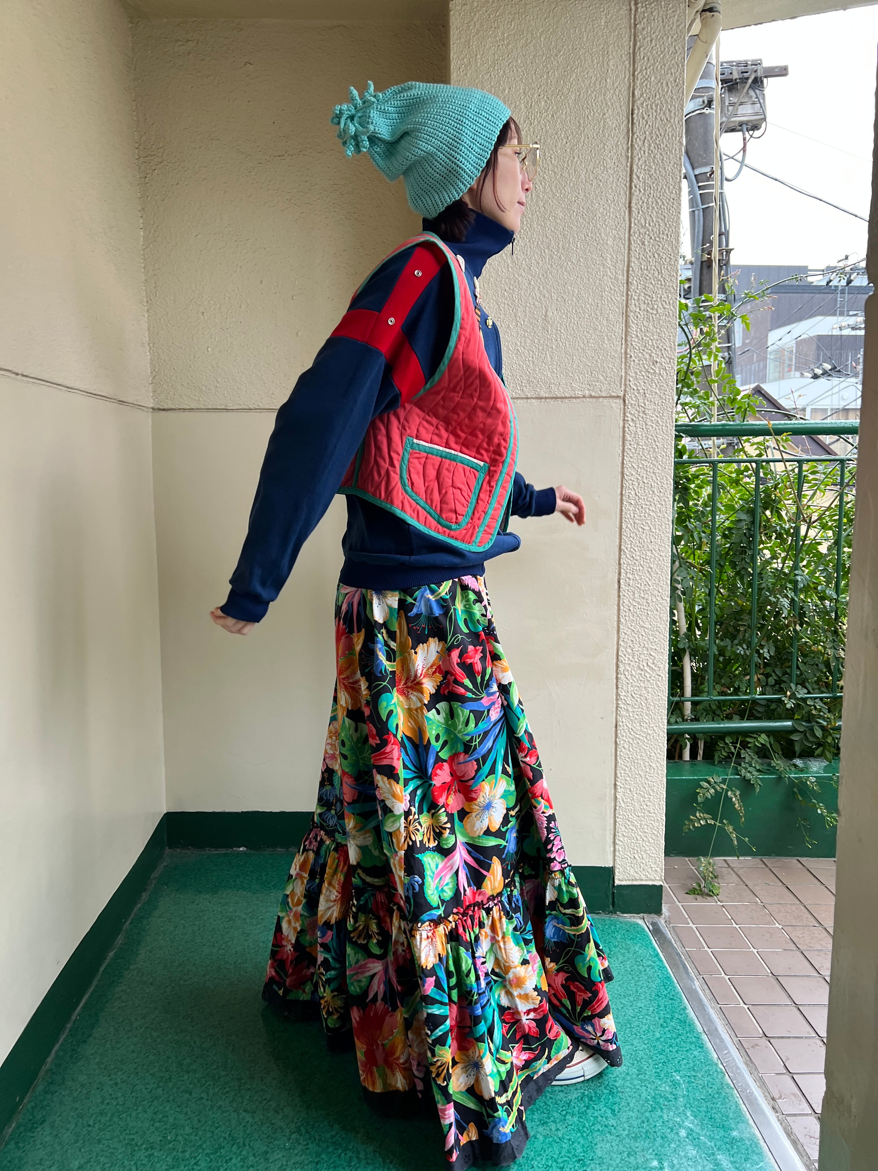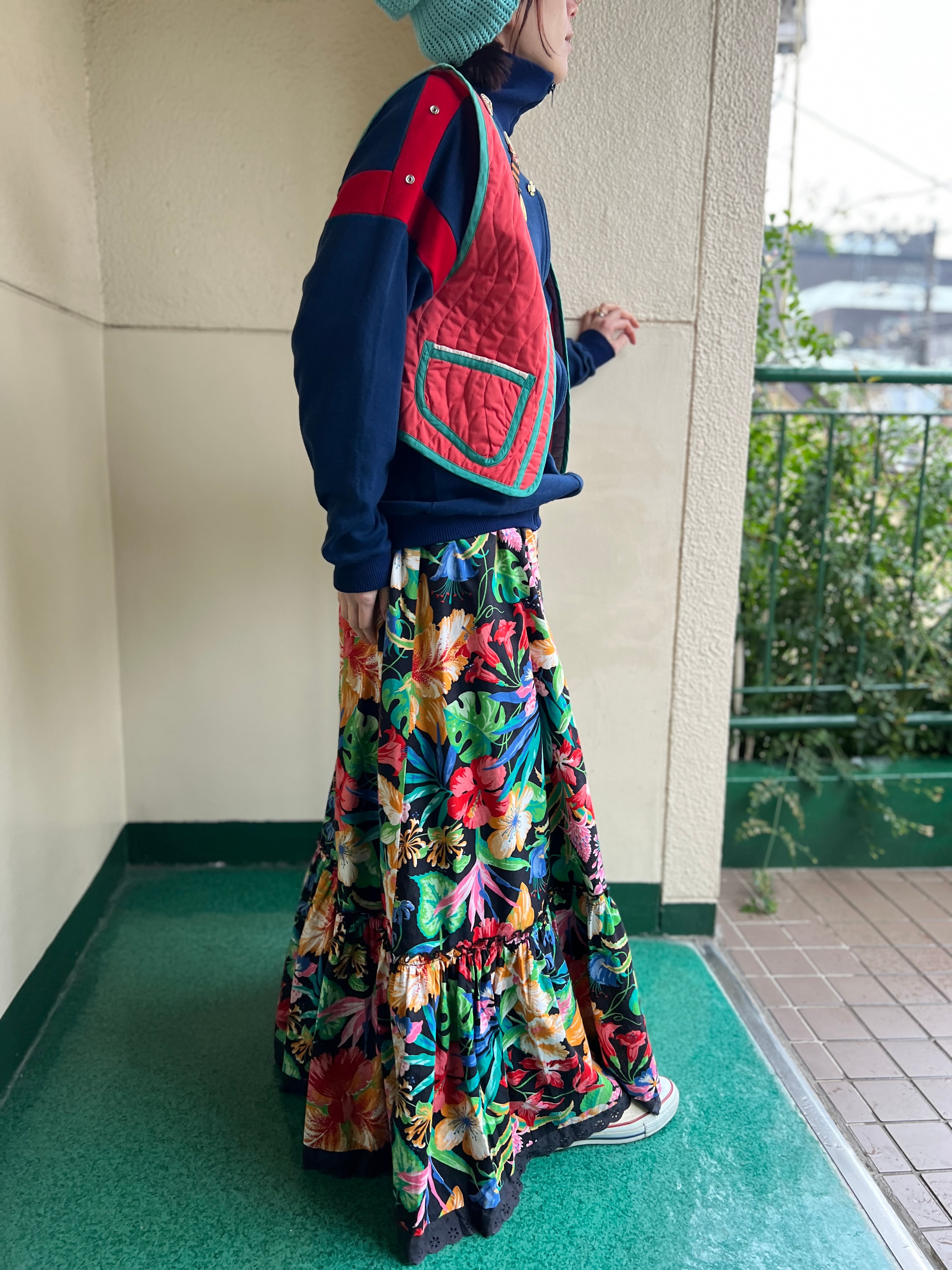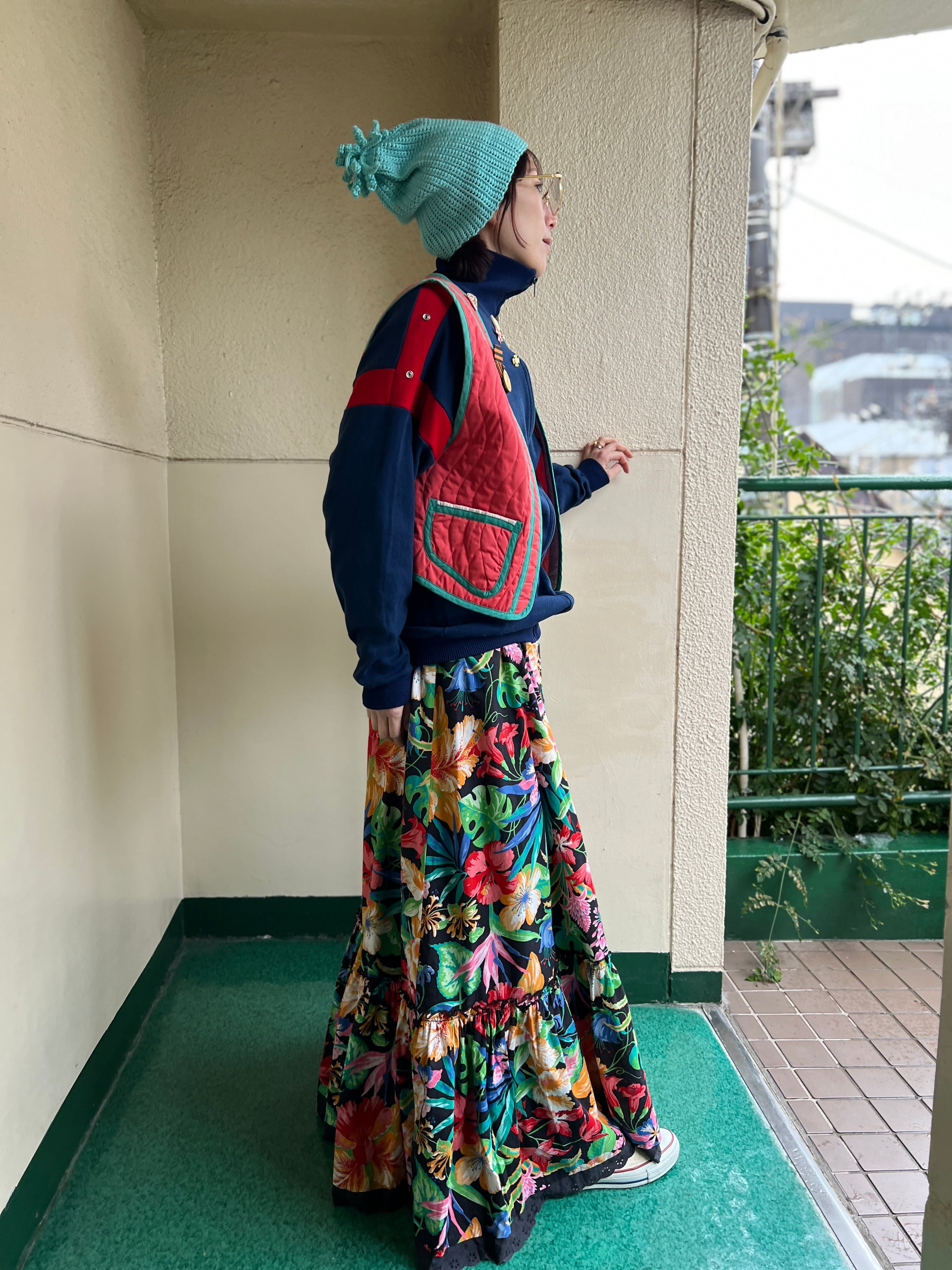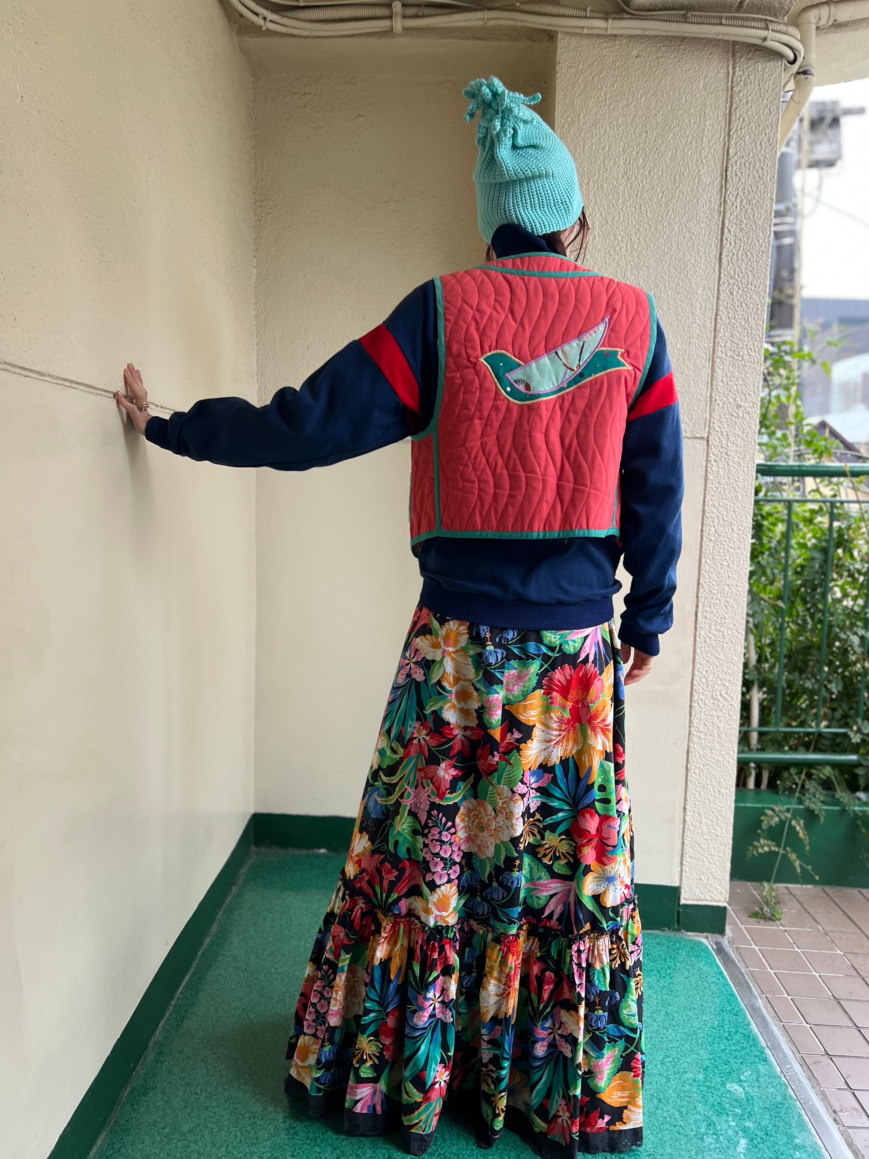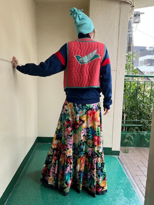 Jeanne Marc bird appliqué orange × moss green vest ( ジェーンマーク 鳥 アップリケ オレンジ × モスグリーン ベスト