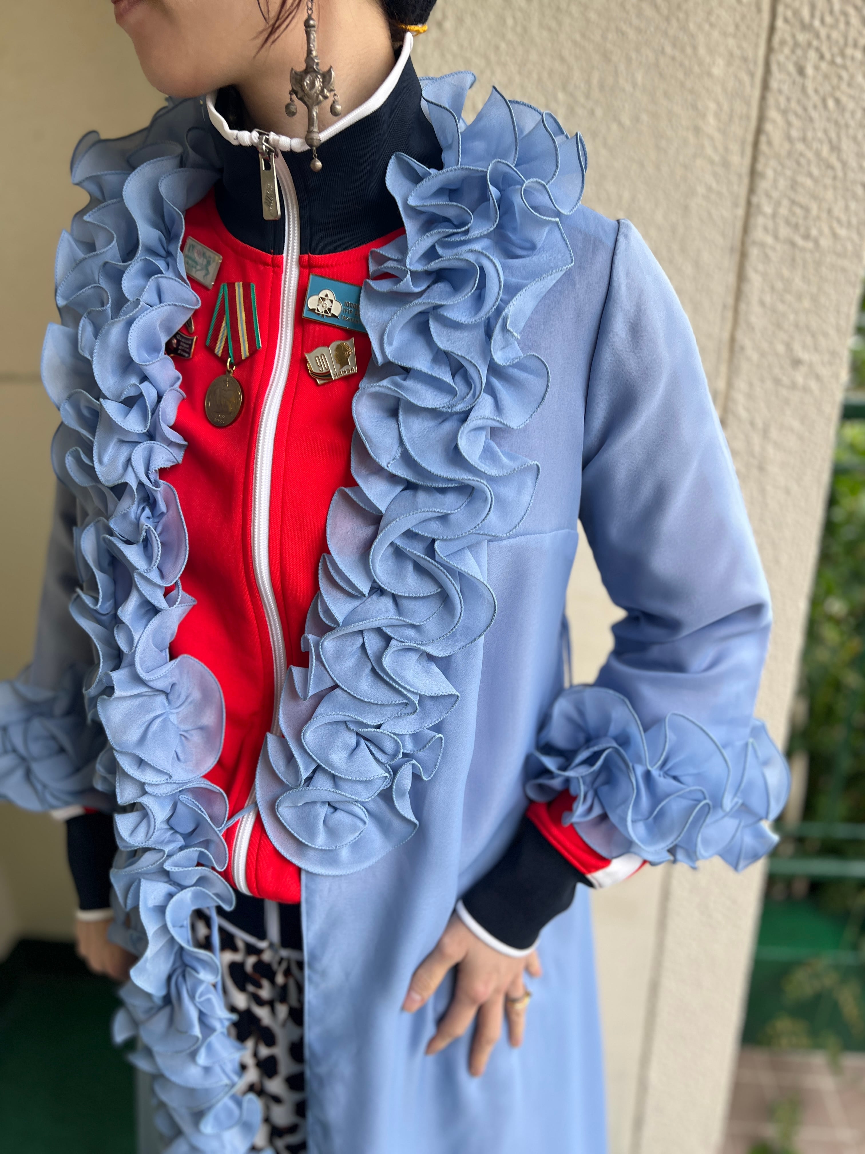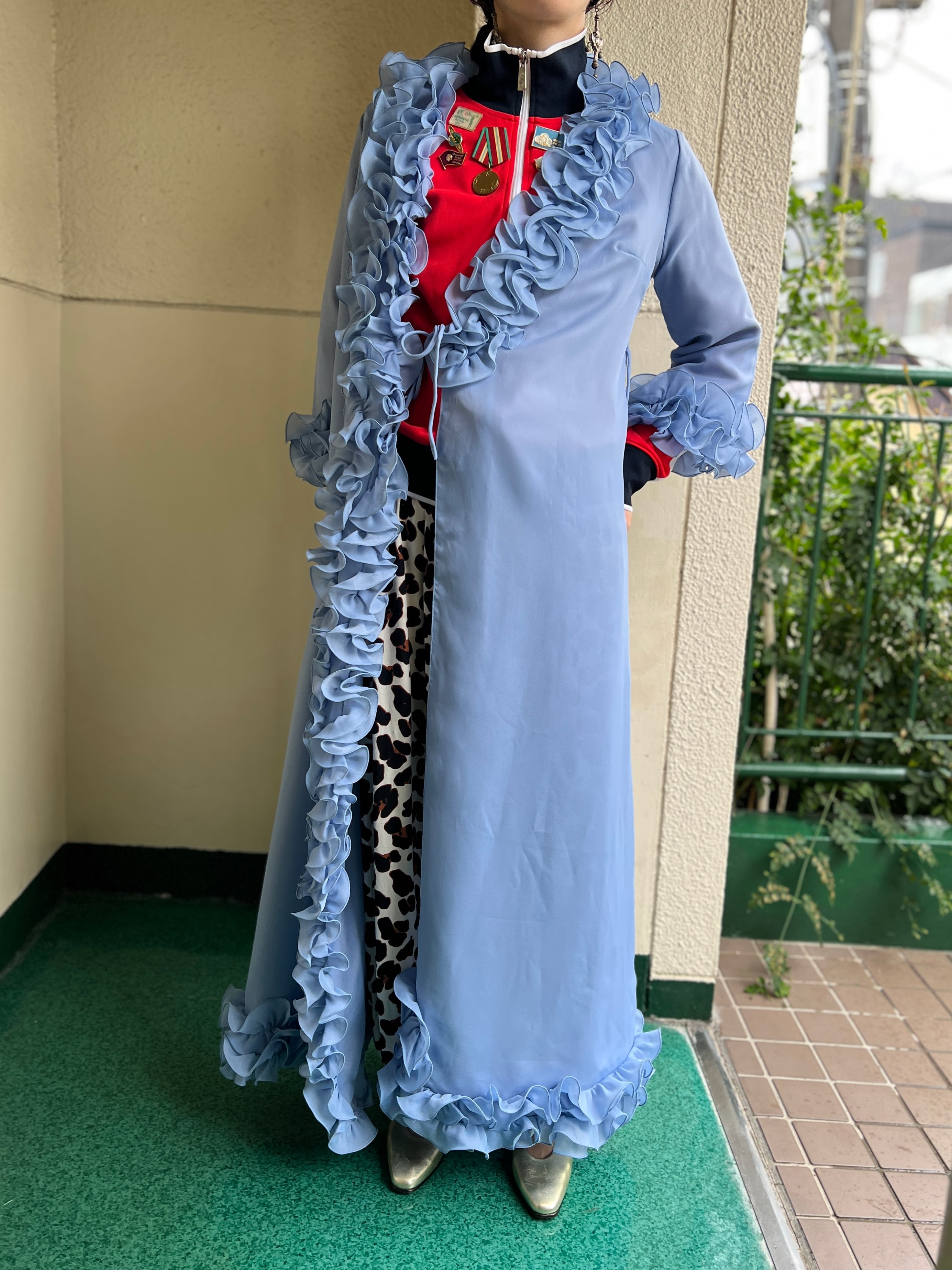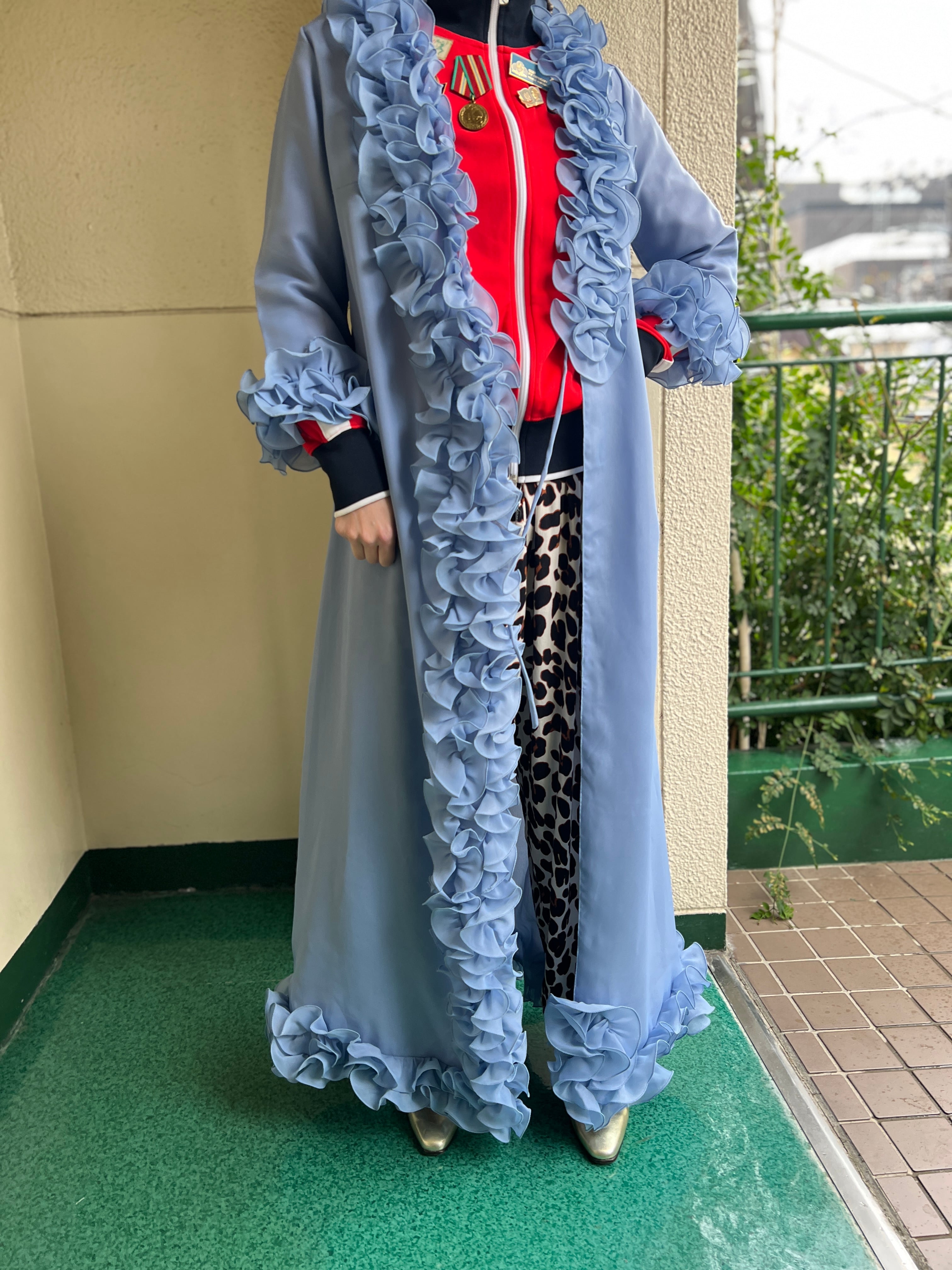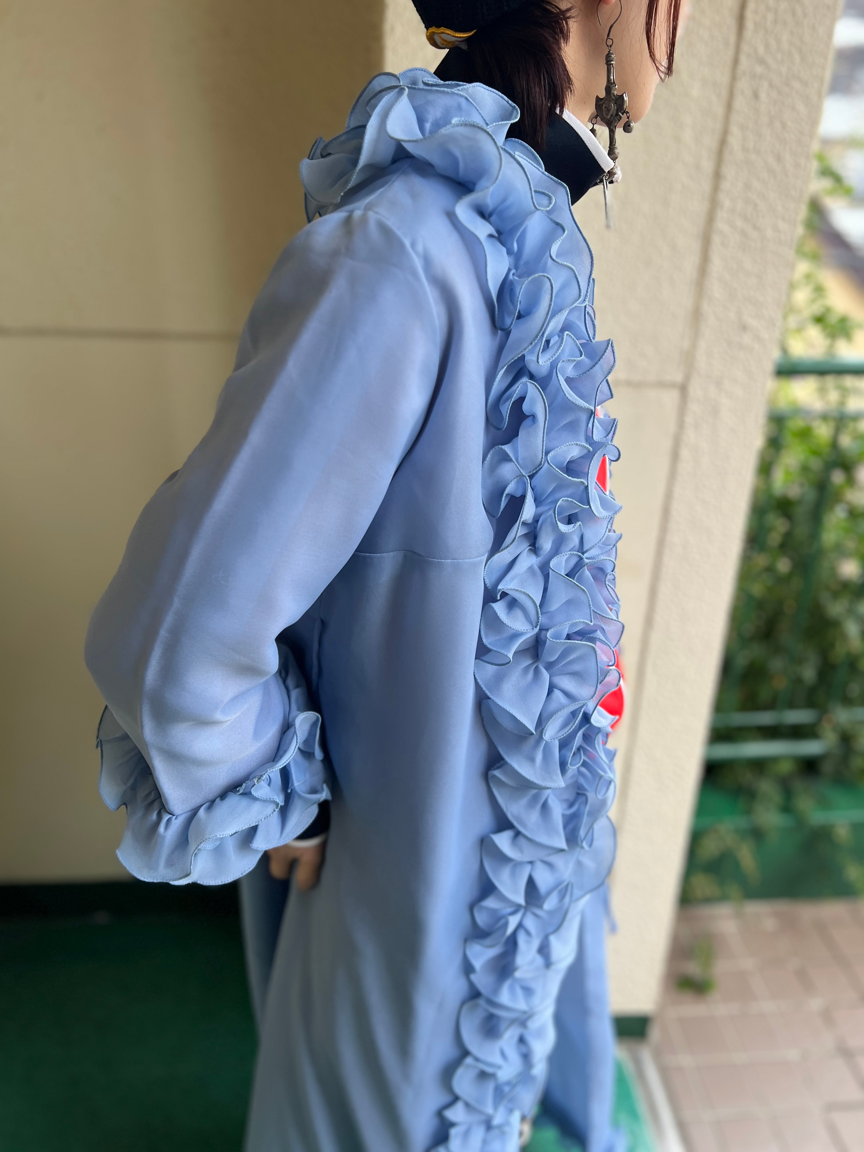 フロントから裾、袖口にかけて贅沢にあしらわれたフリルが