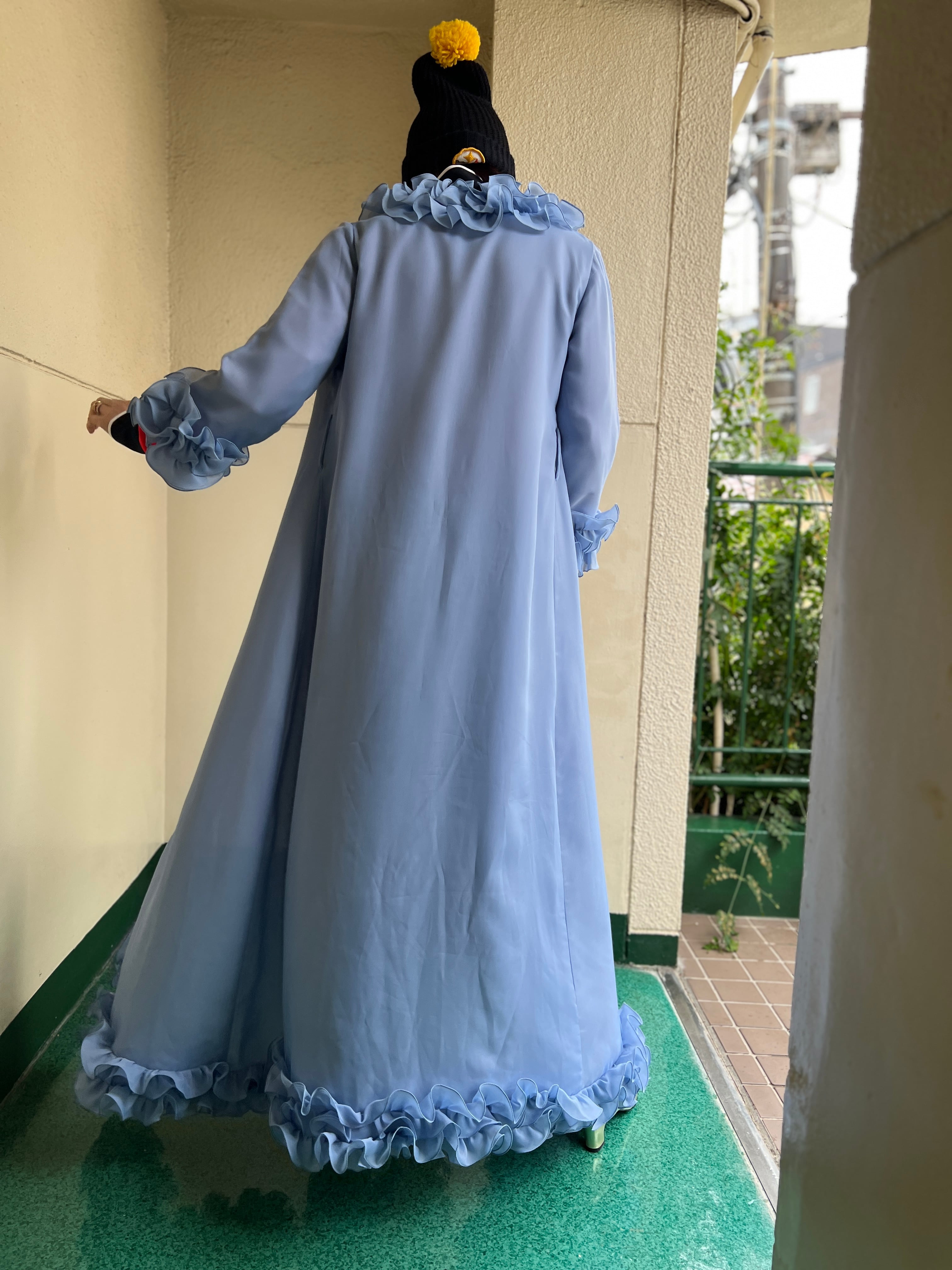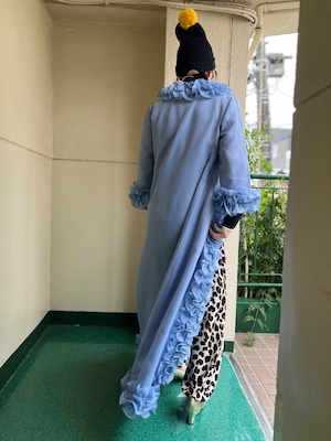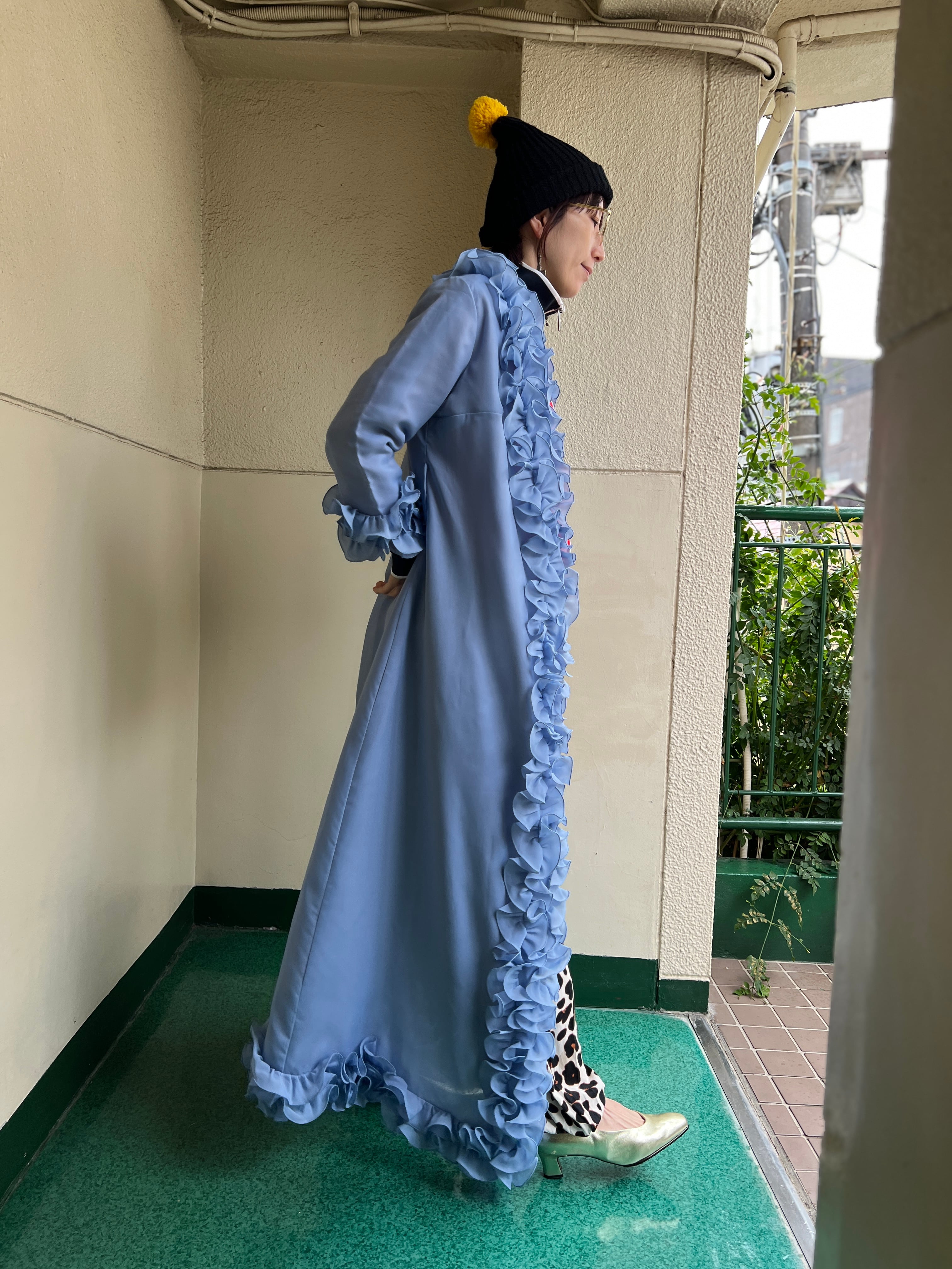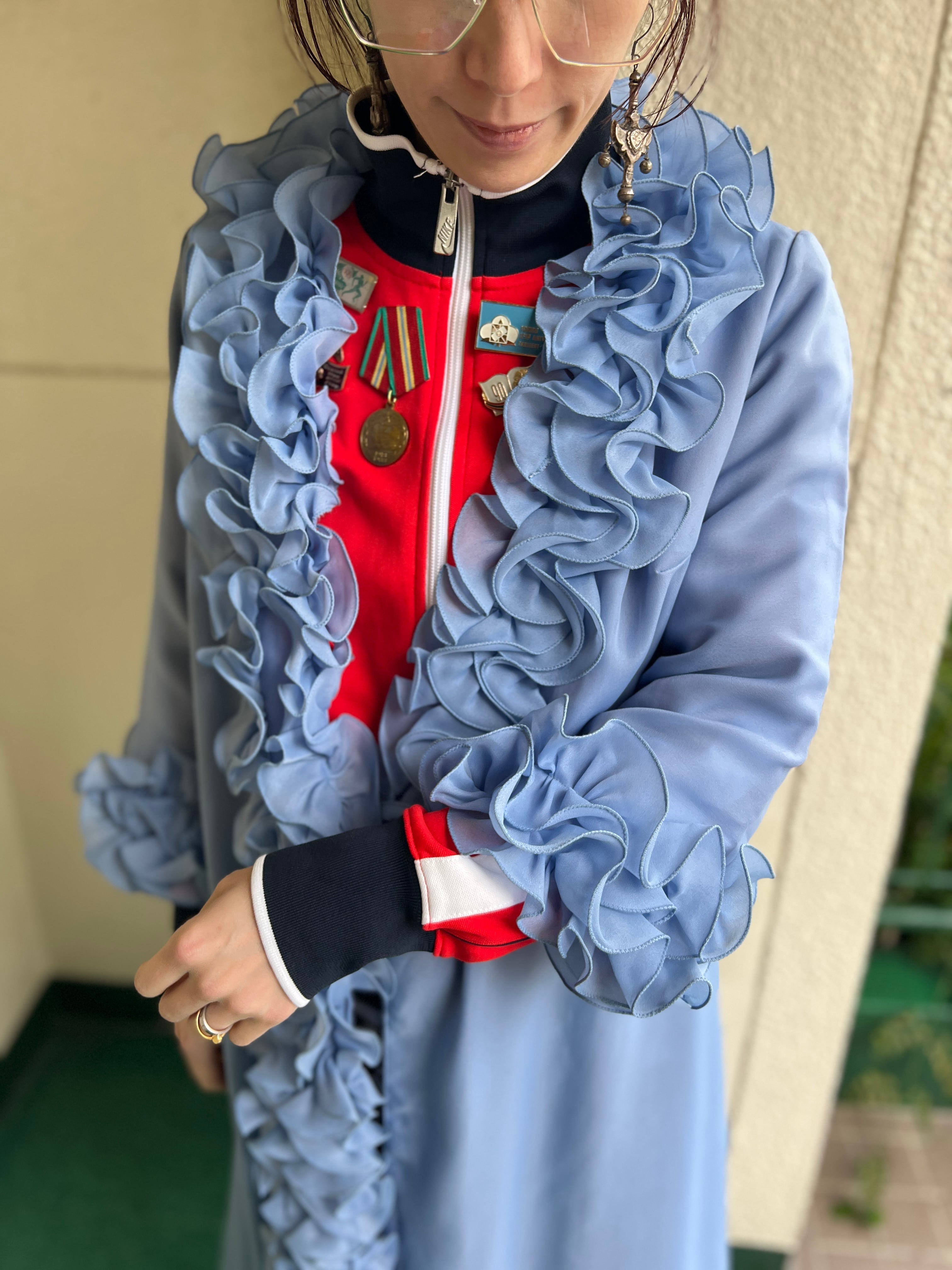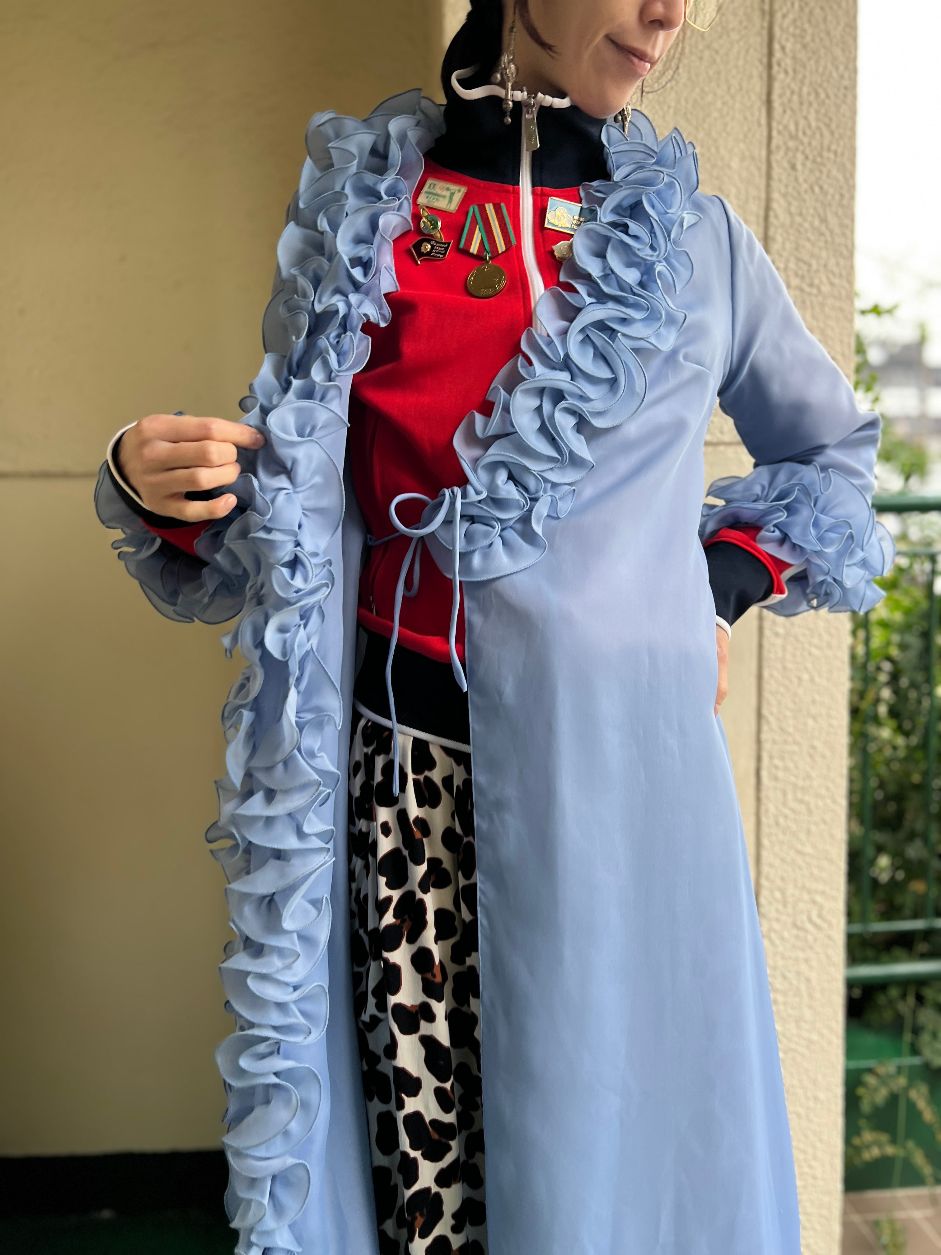 フロントから裾、袖口にかけて贅沢にあしらわれたフリルが