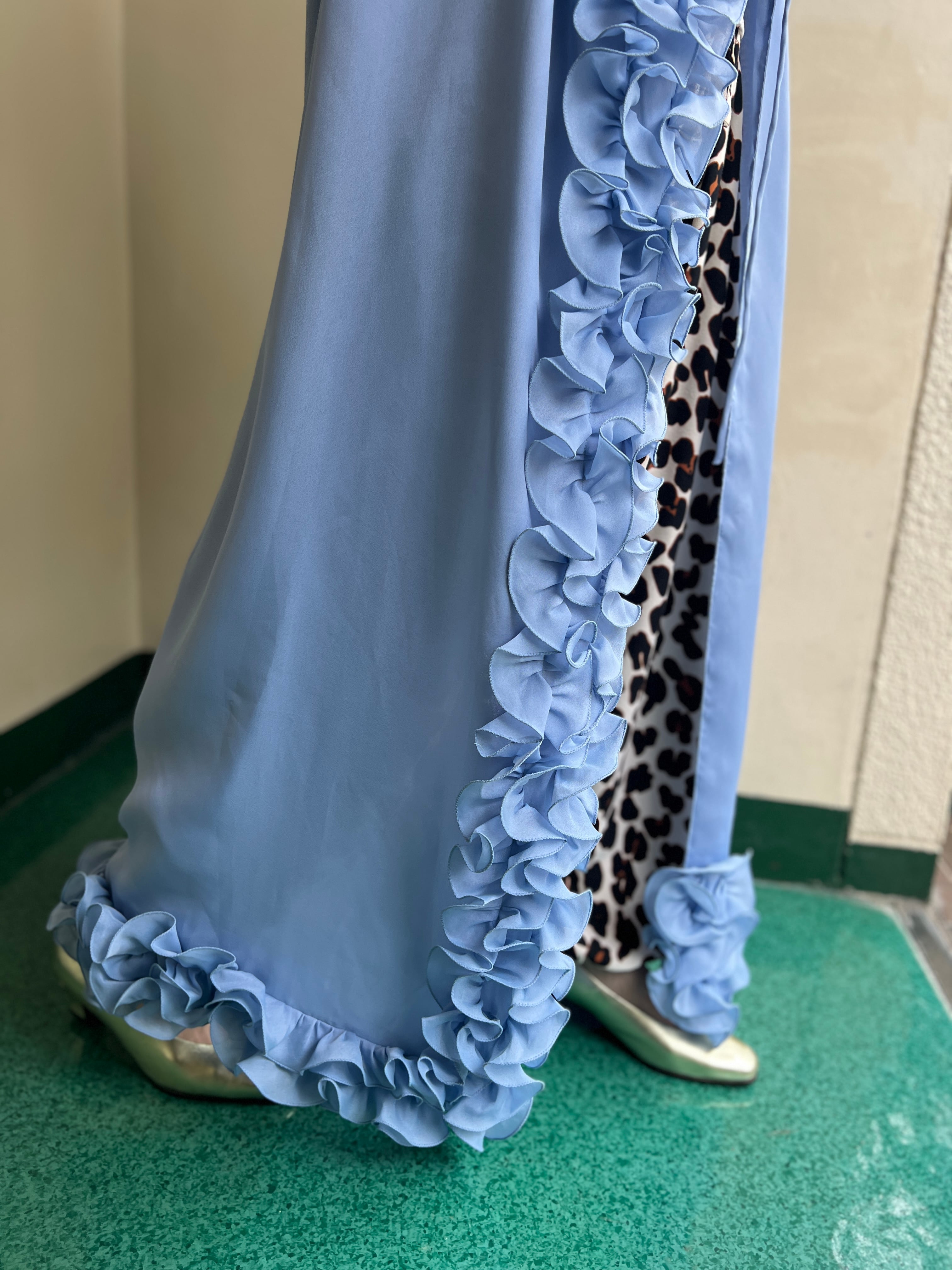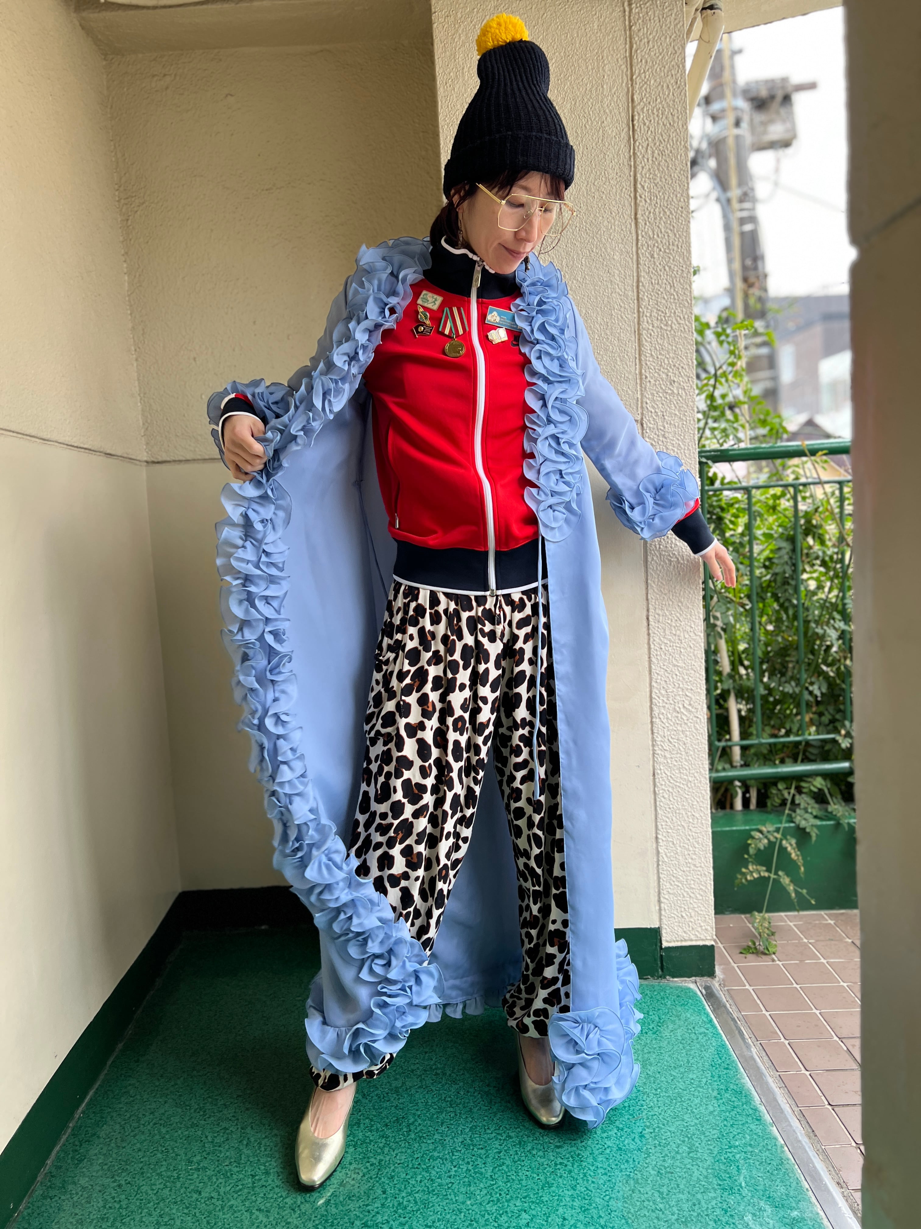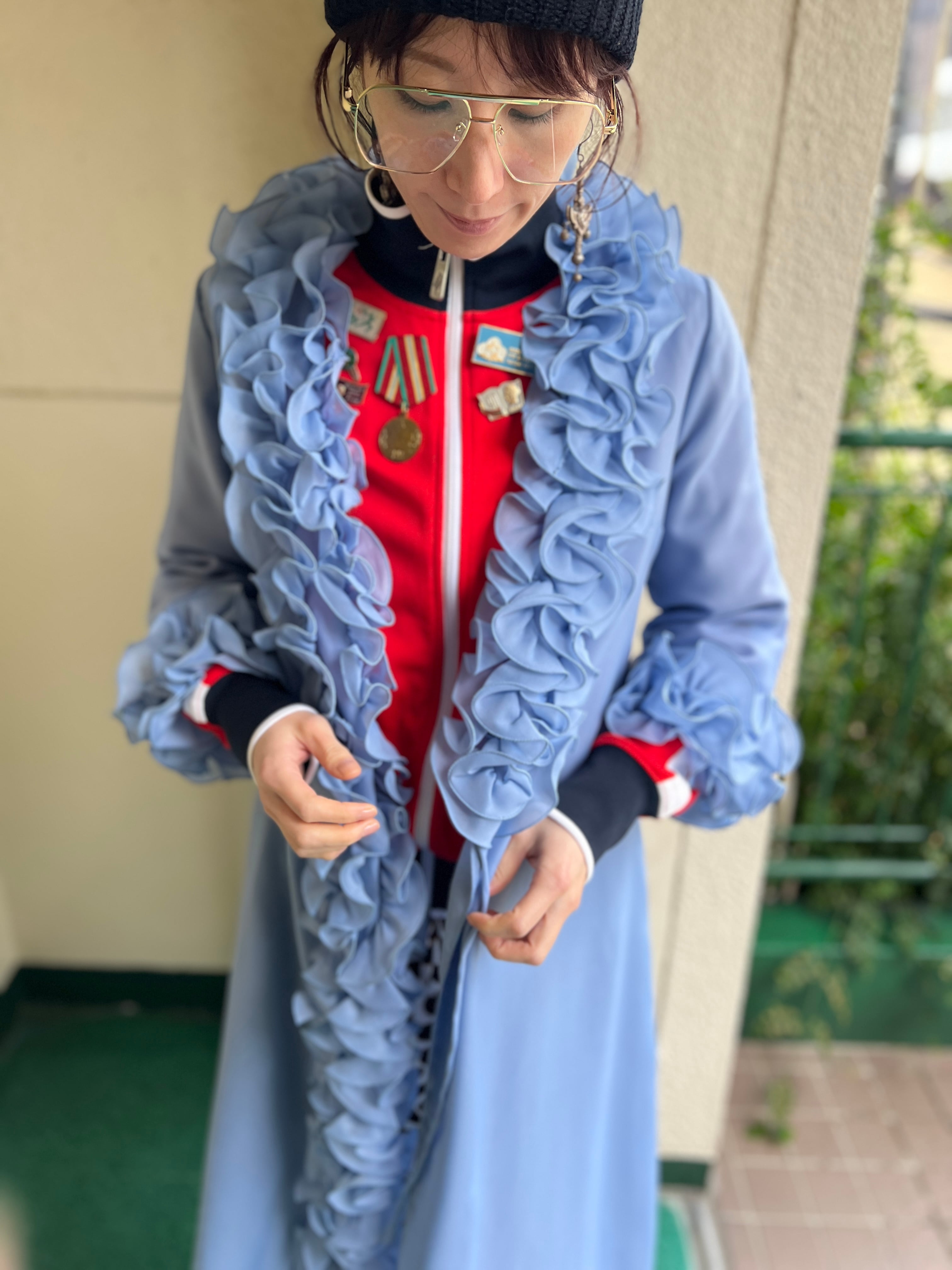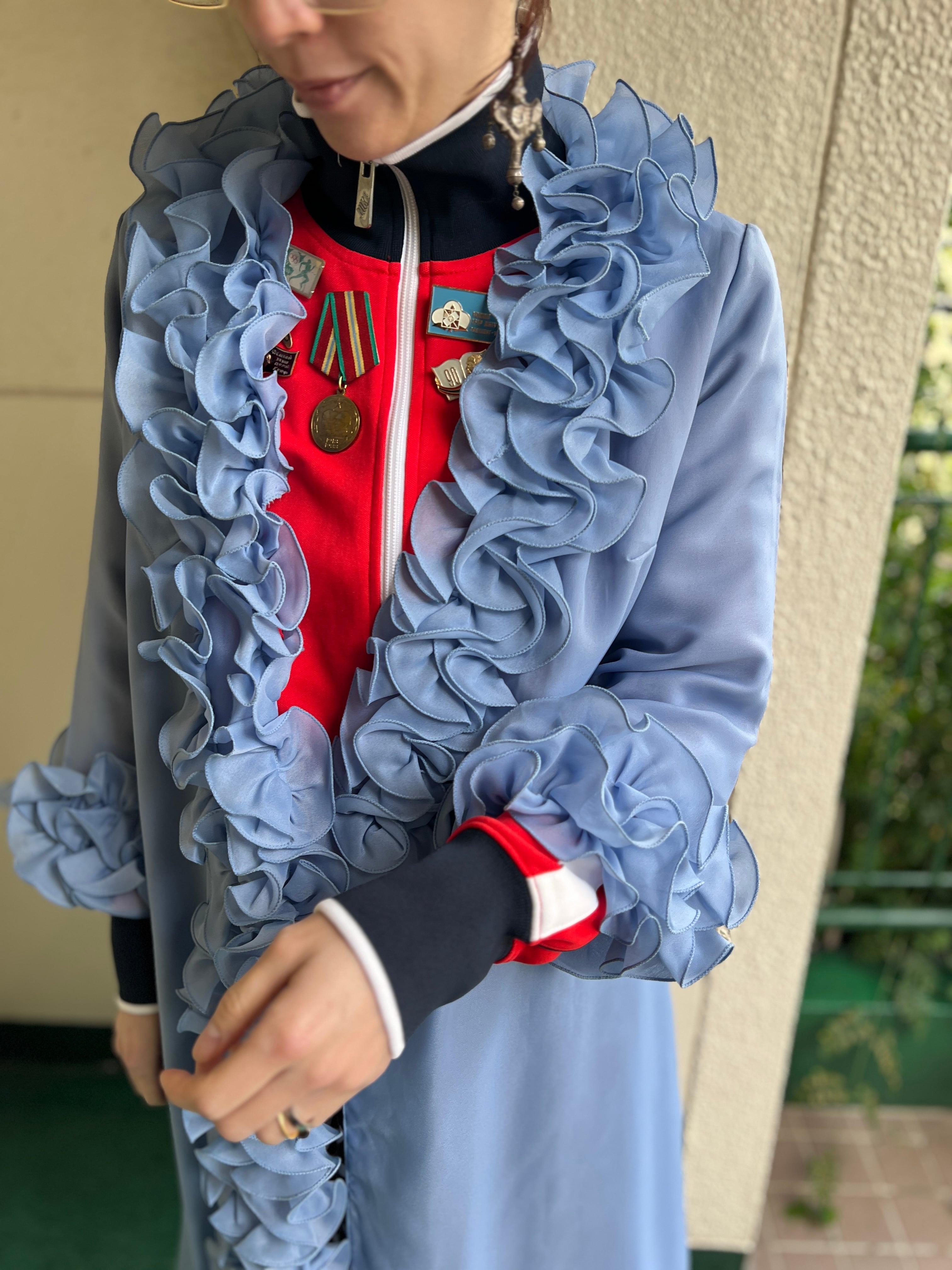 フロントから裾、袖口にかけて贅沢にあしらわれたフリルが