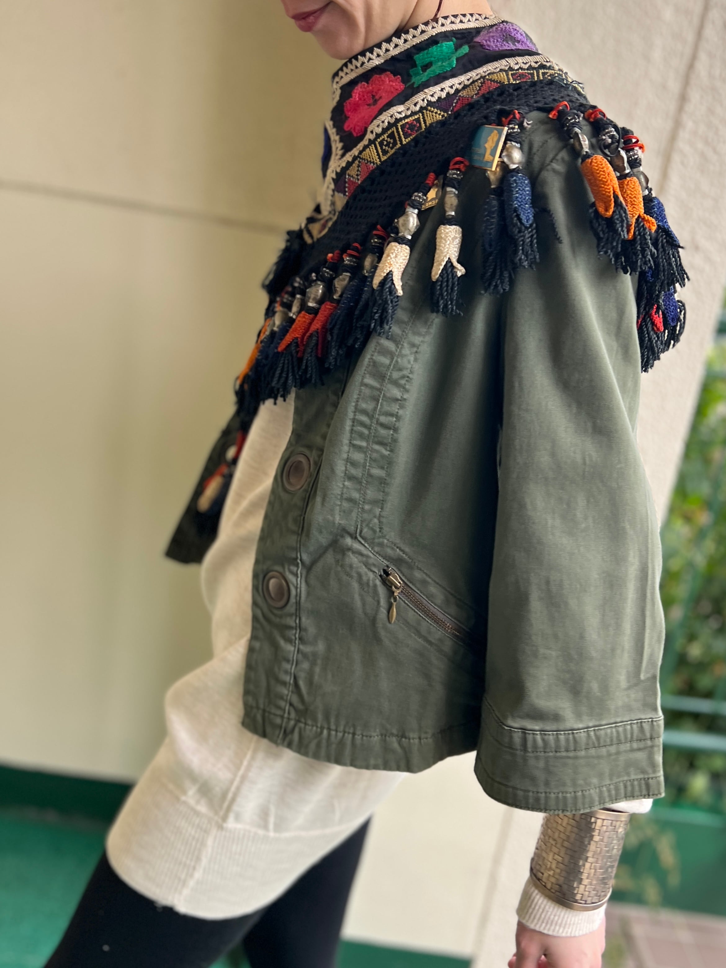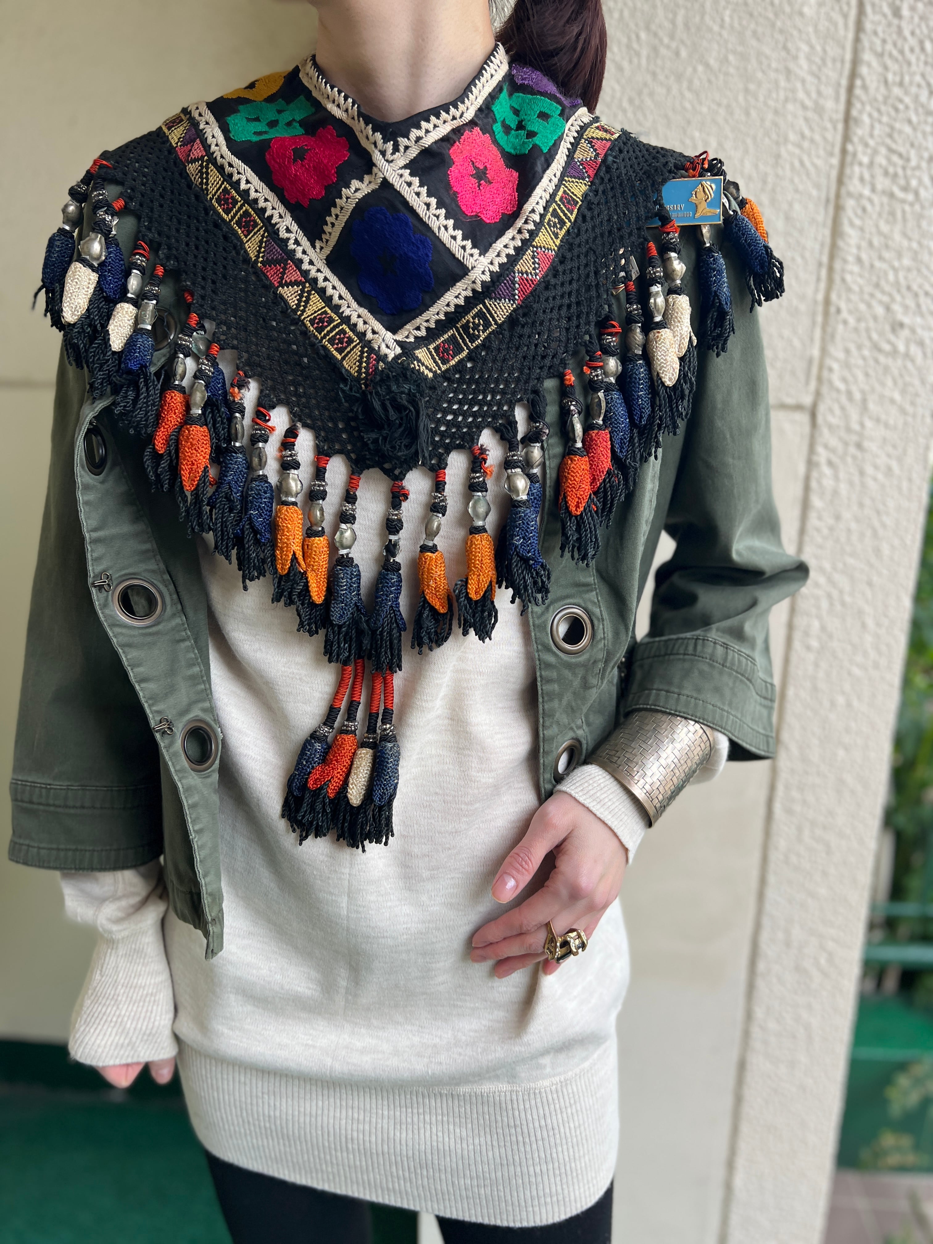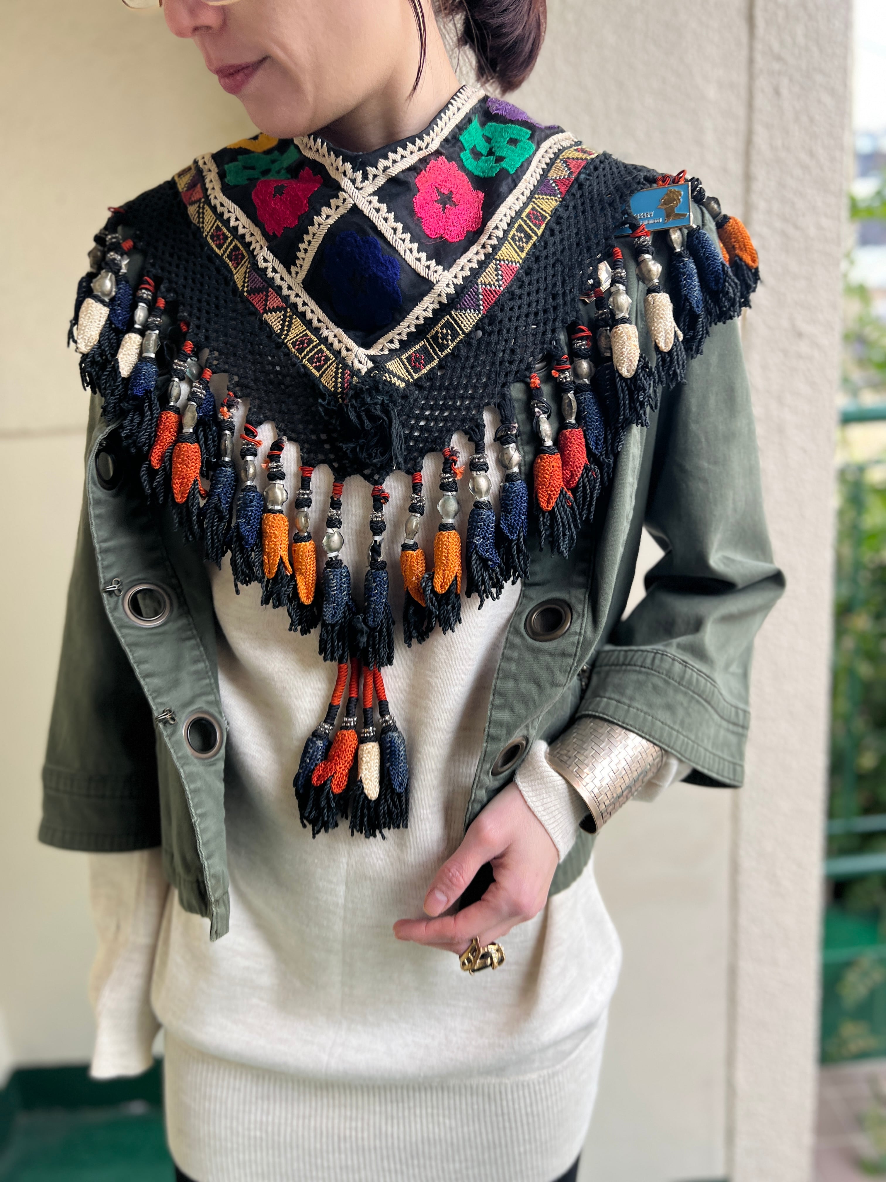 こちらは ブラックコットン生地に花柄の手刺繍刺繍と、たっぷり揺れるフリンジ、ビーズやメタル装飾が組み合わさった存在感のある一点。