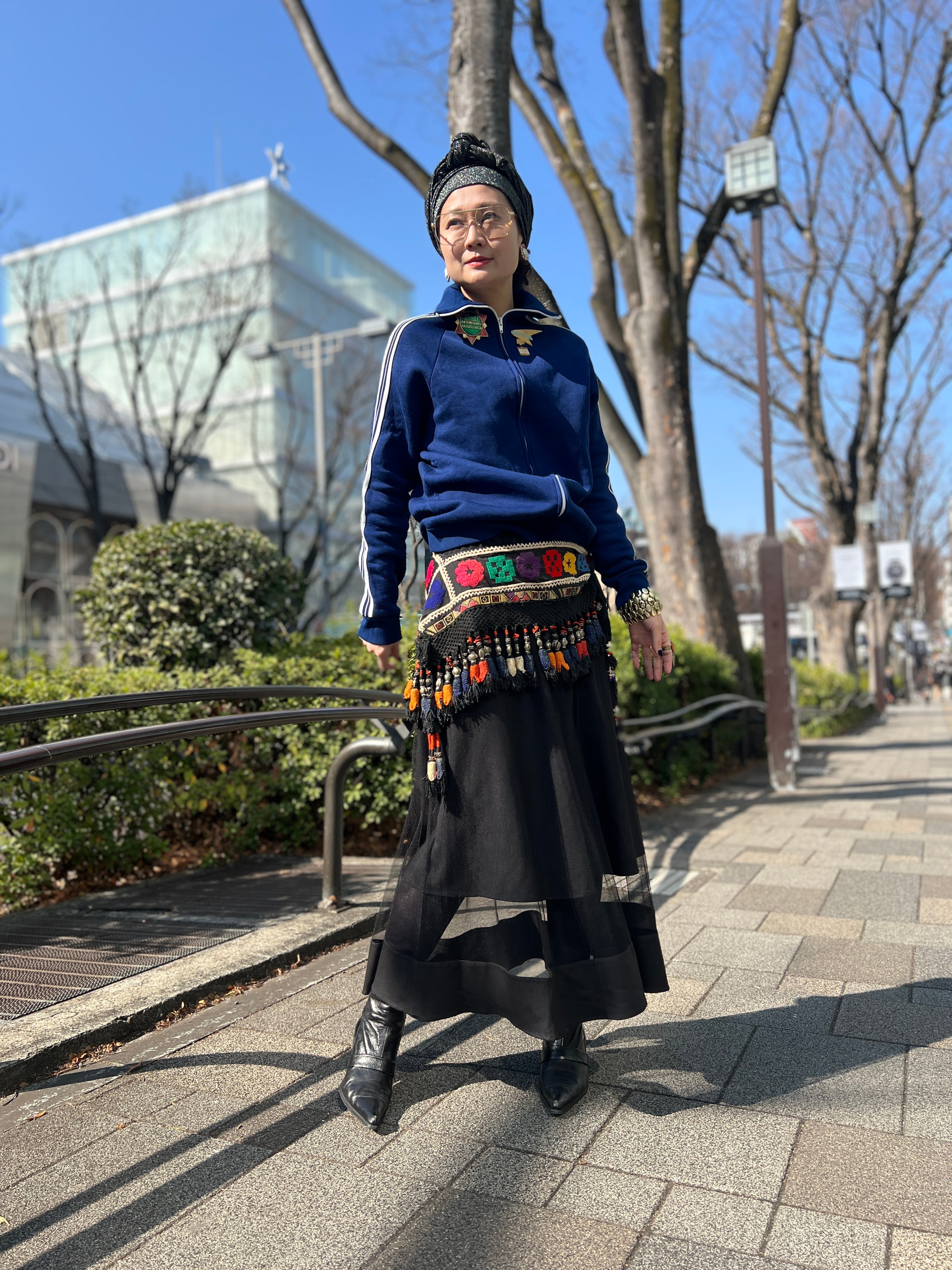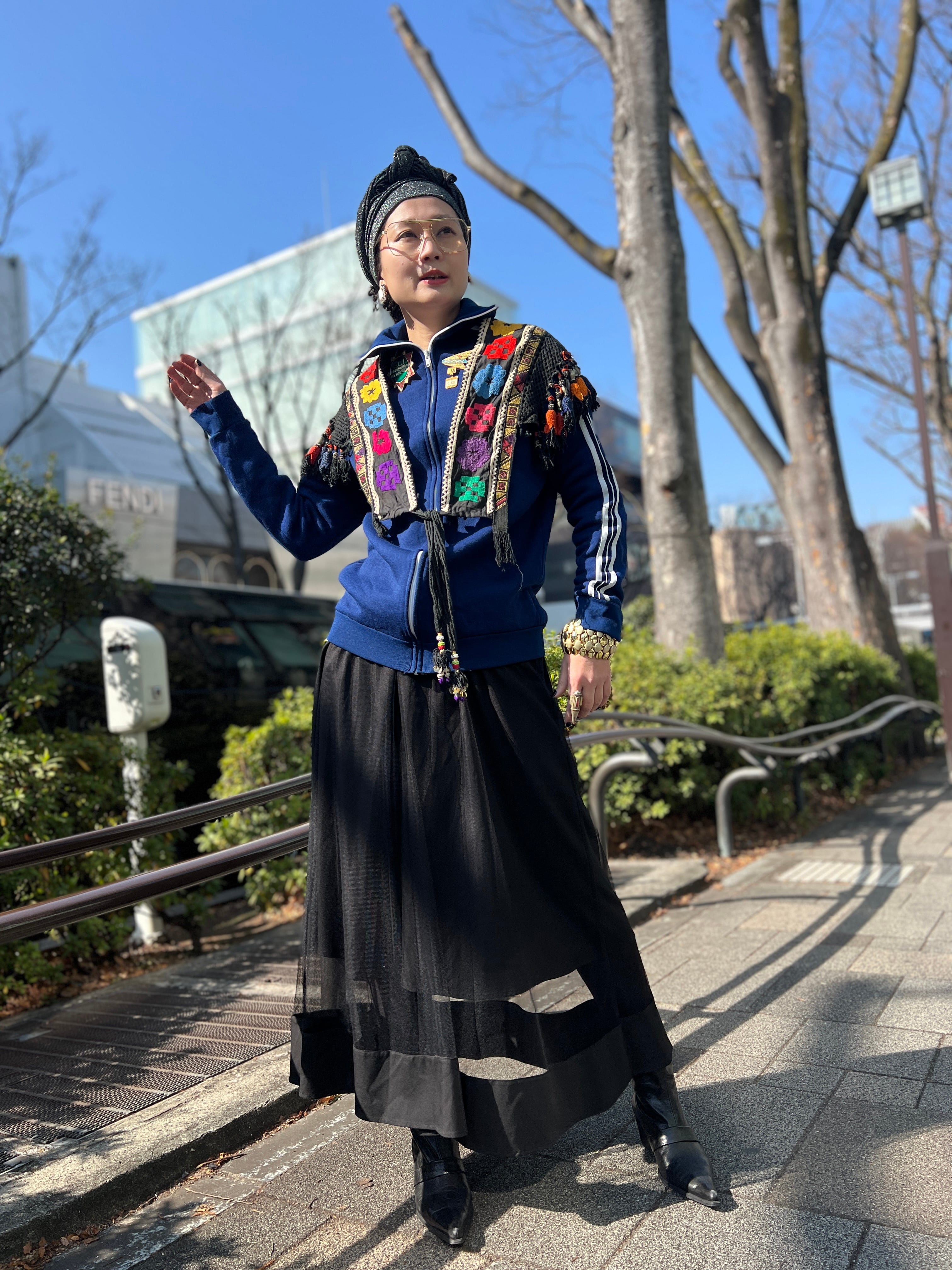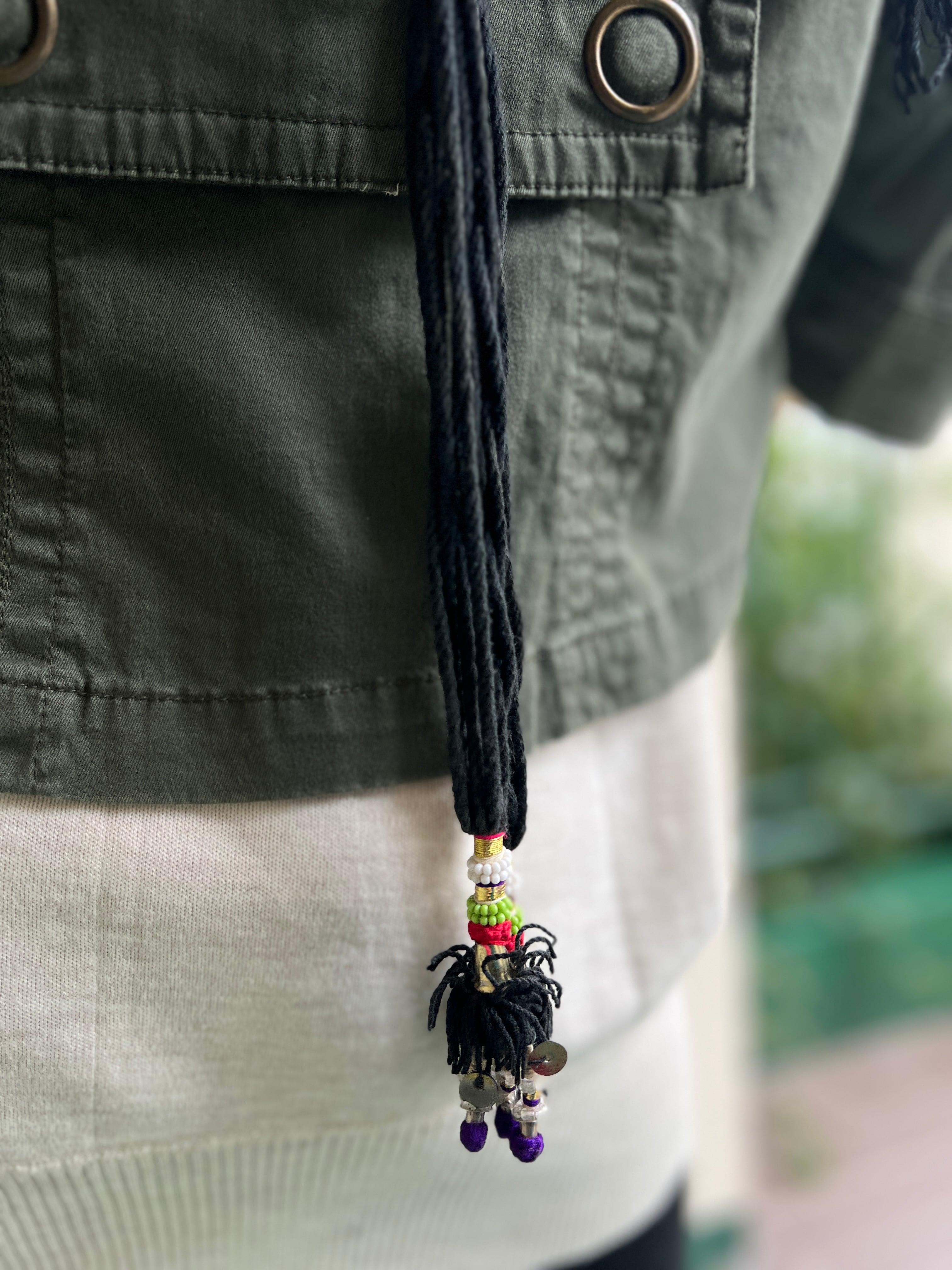 こちらは ブラックコットン生地に花柄の手刺繍刺繍と、たっぷり揺れるフリンジ、ビーズやメタル装飾が組み合わさった存在感のある一点。
