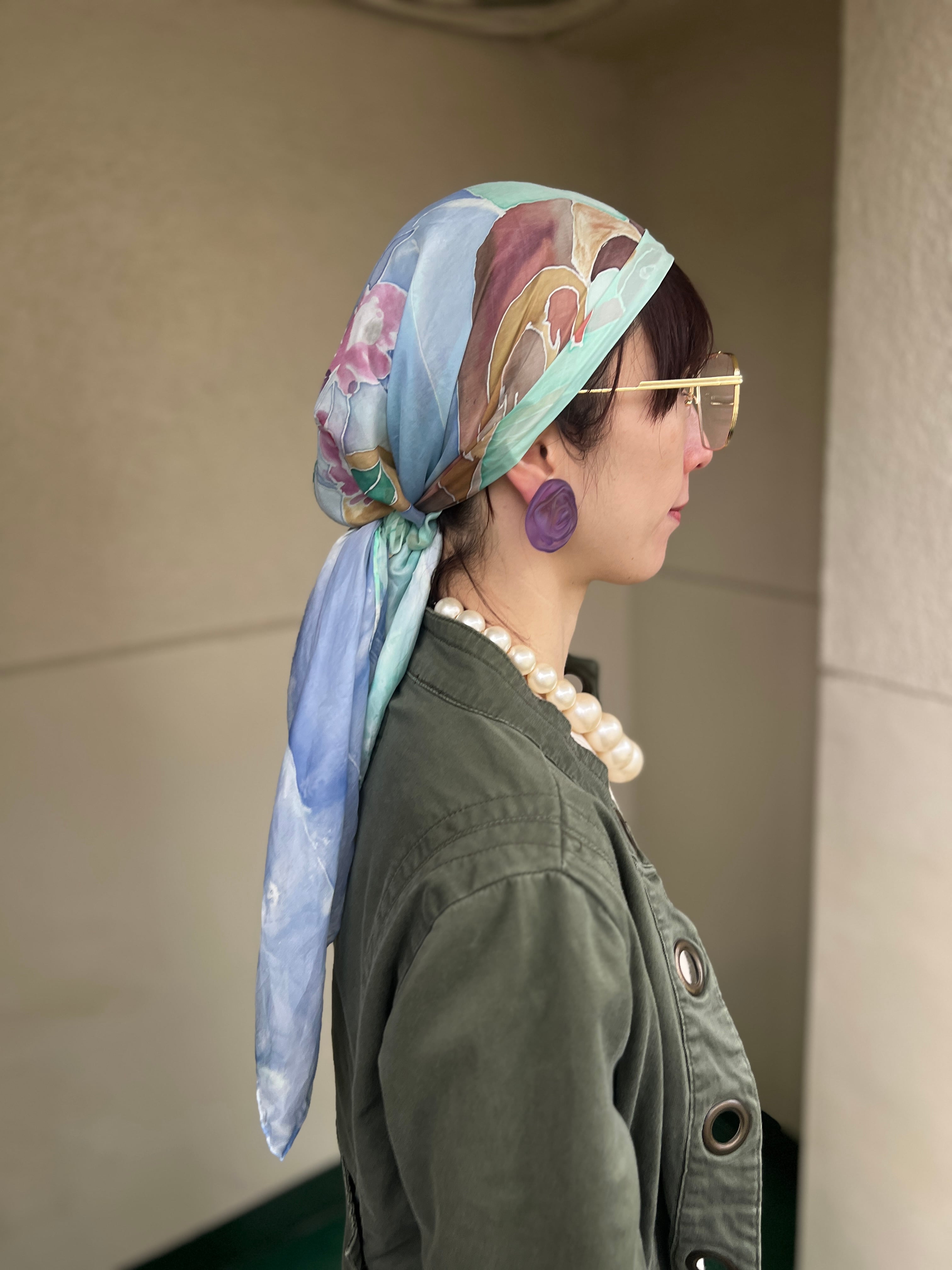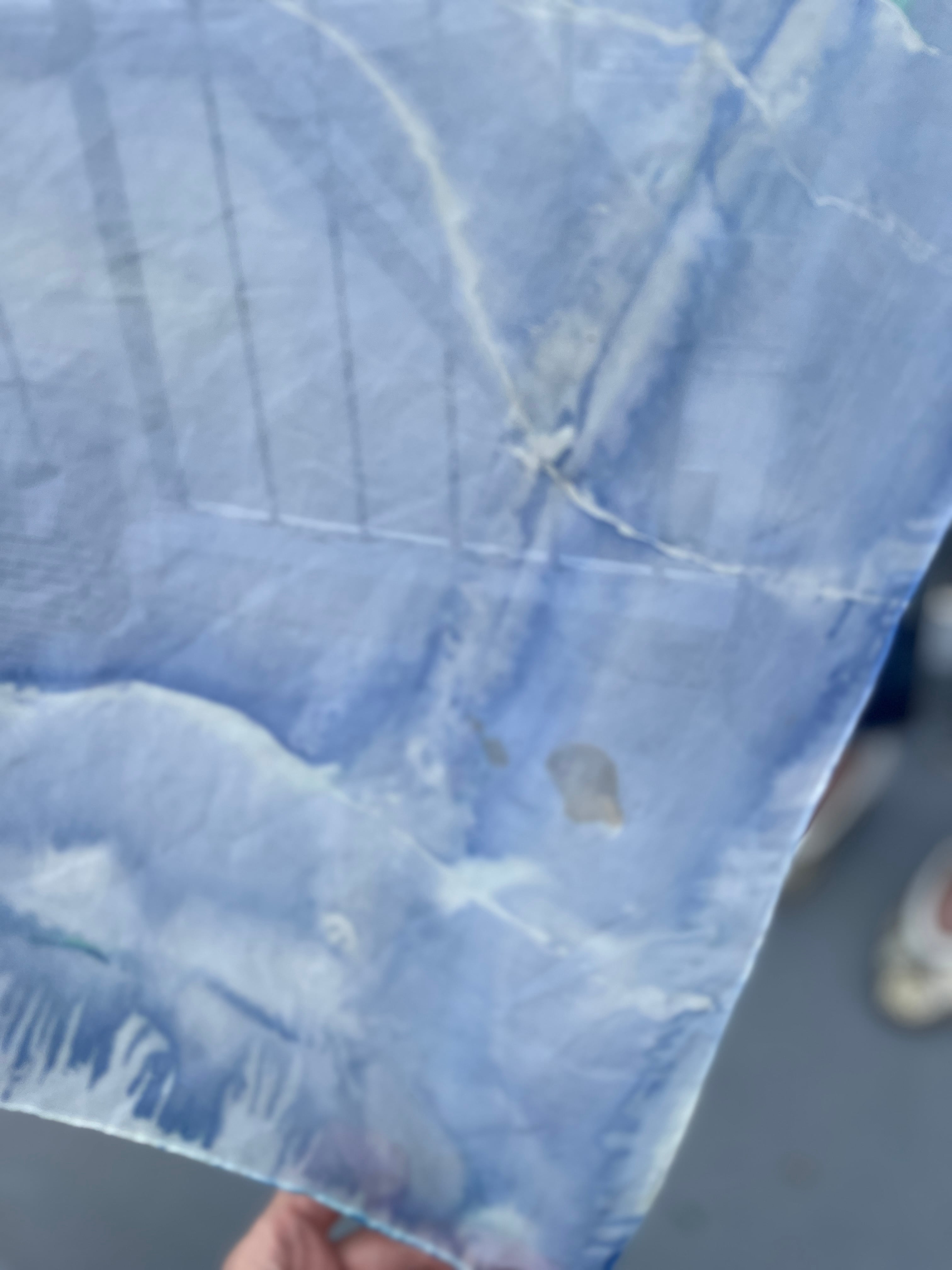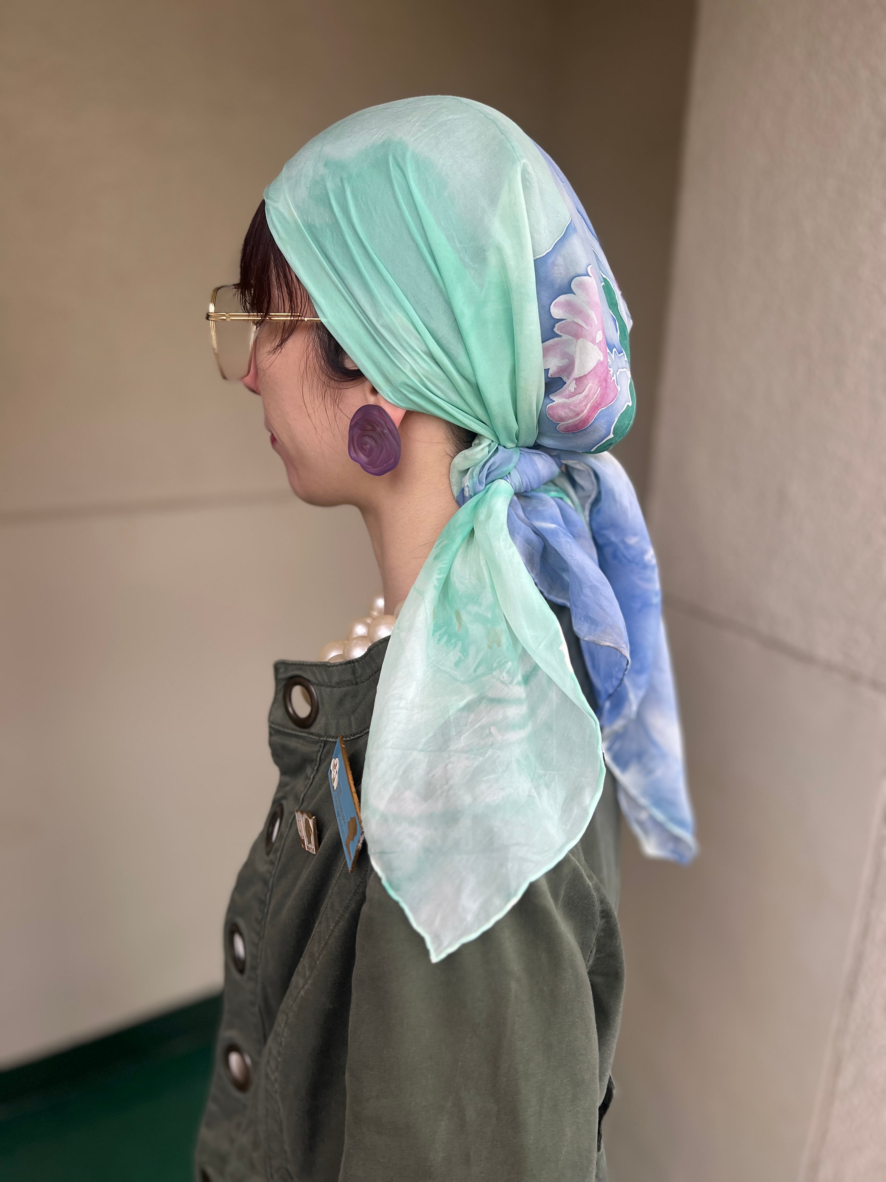所々にカモの茶色いインクが飛んでいます。スカーフの端が一部切れています。