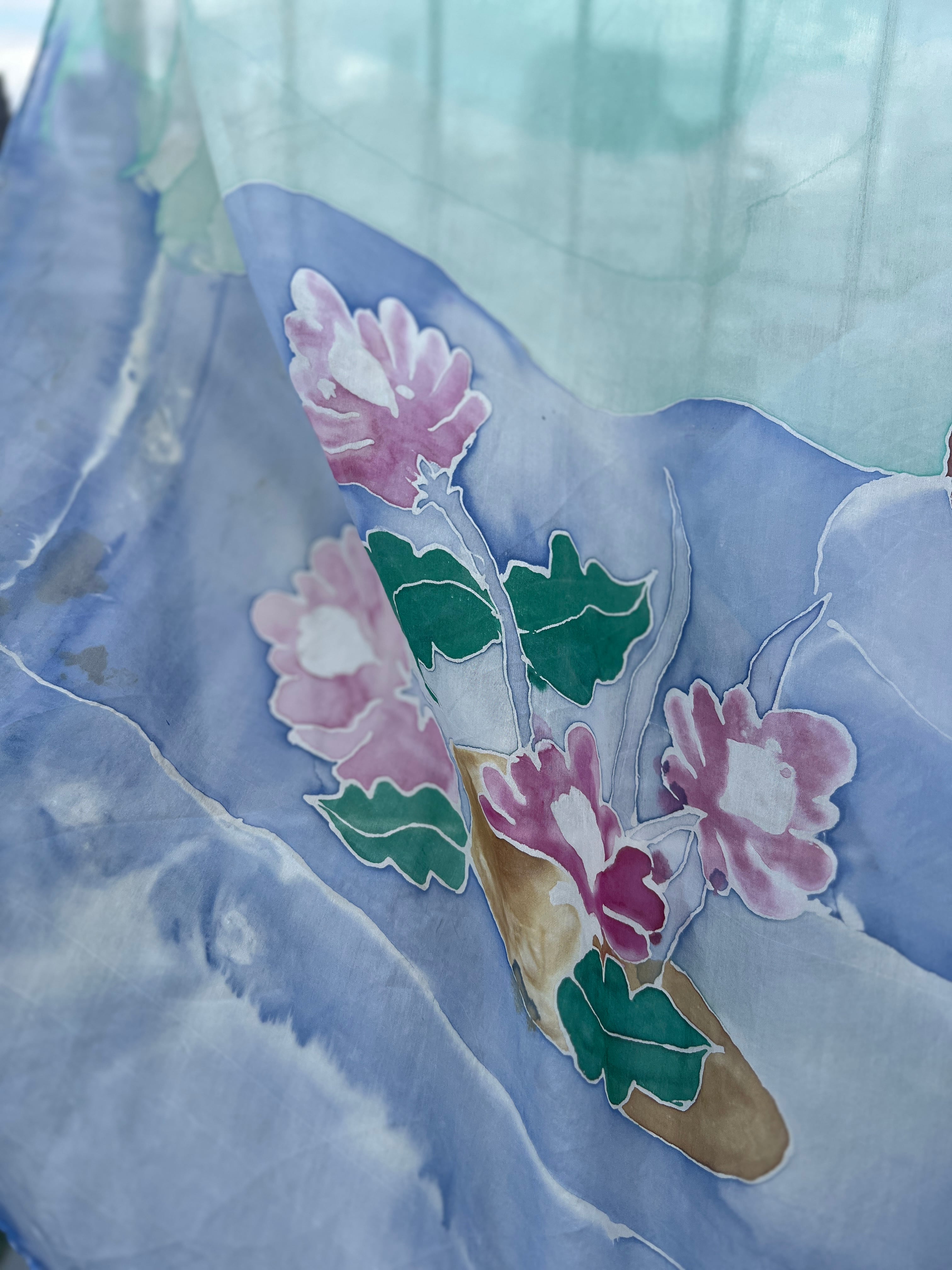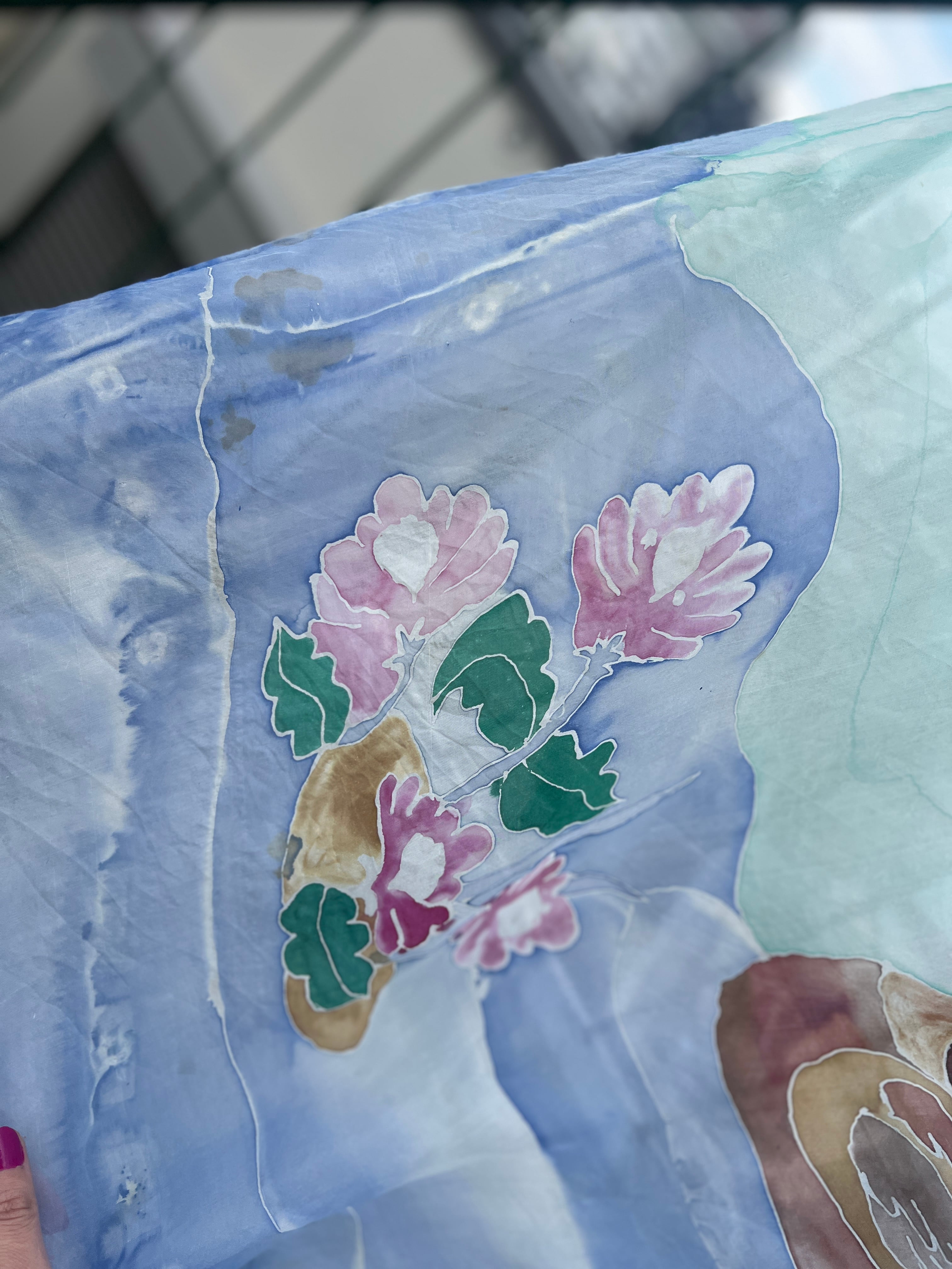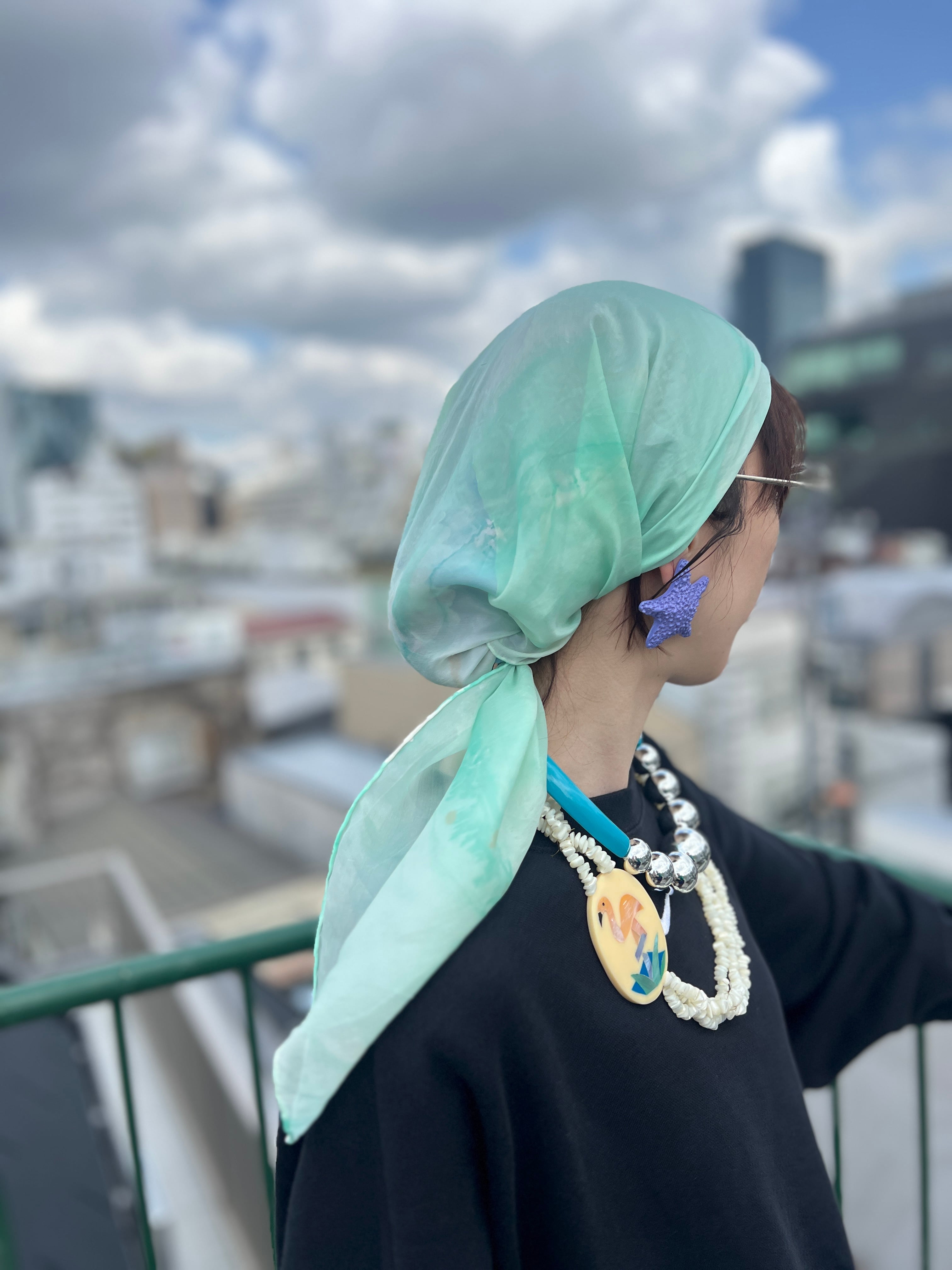 所々にカモの茶色いインクが飛んでいます。スカーフの端が一部切れています。