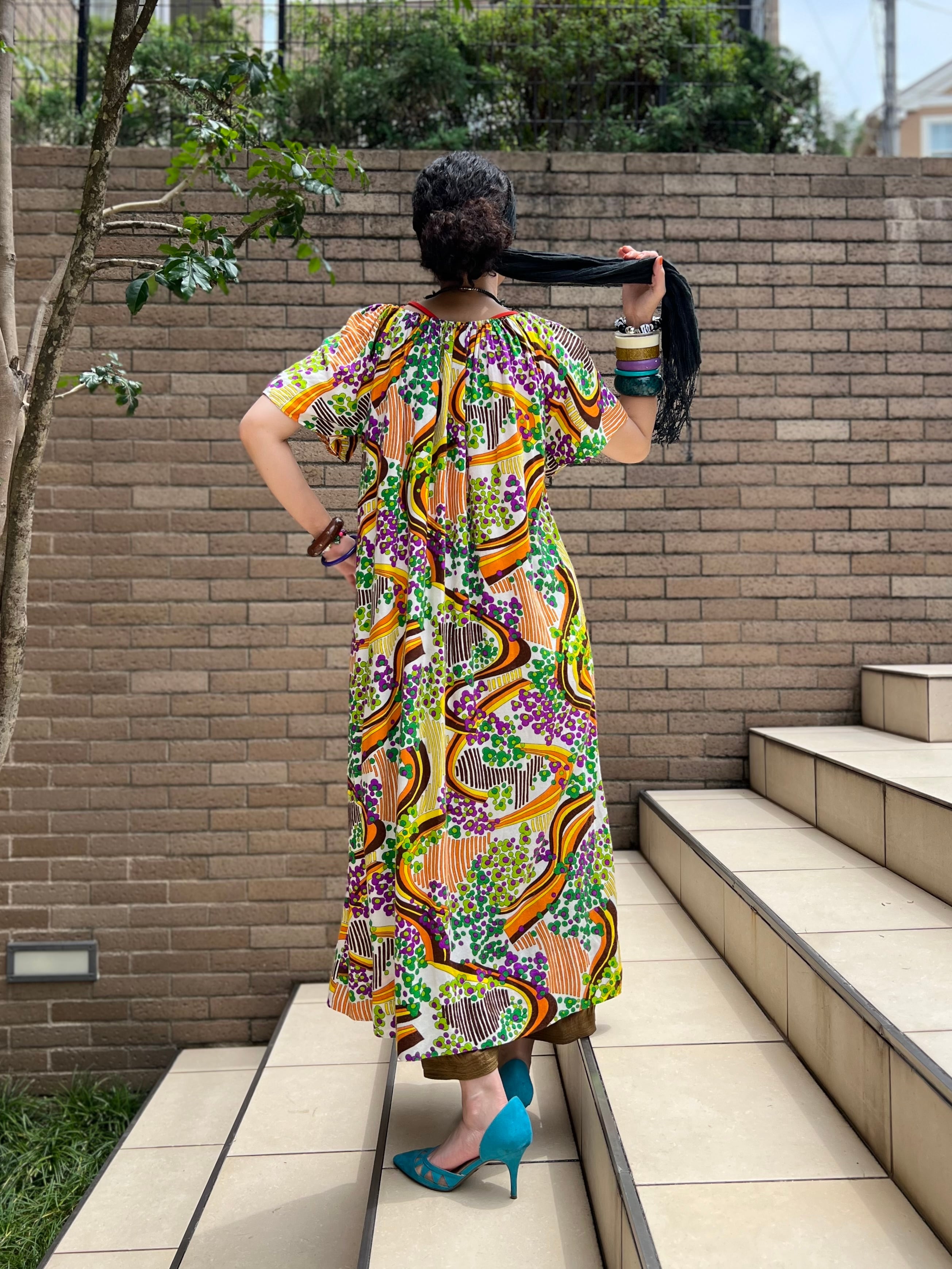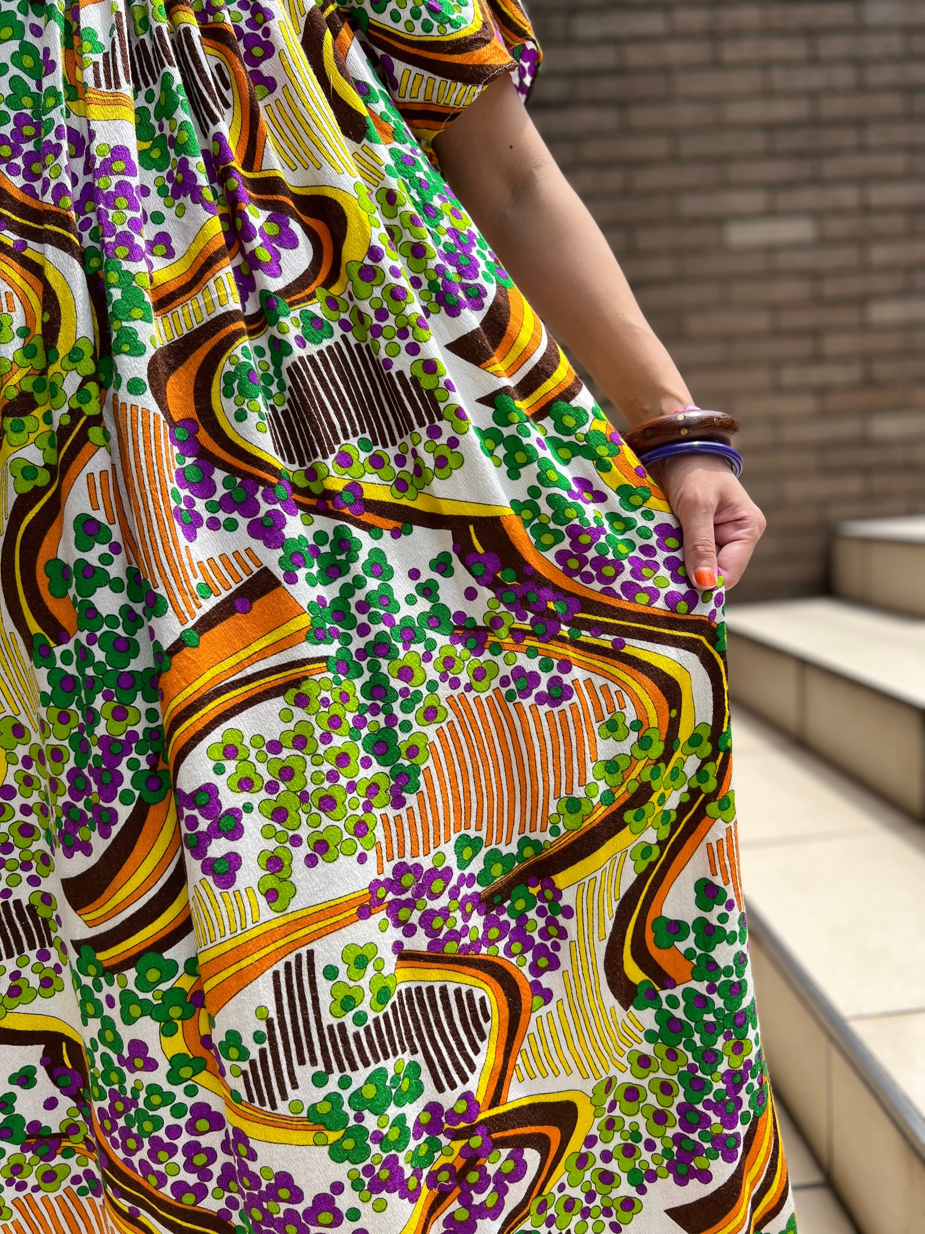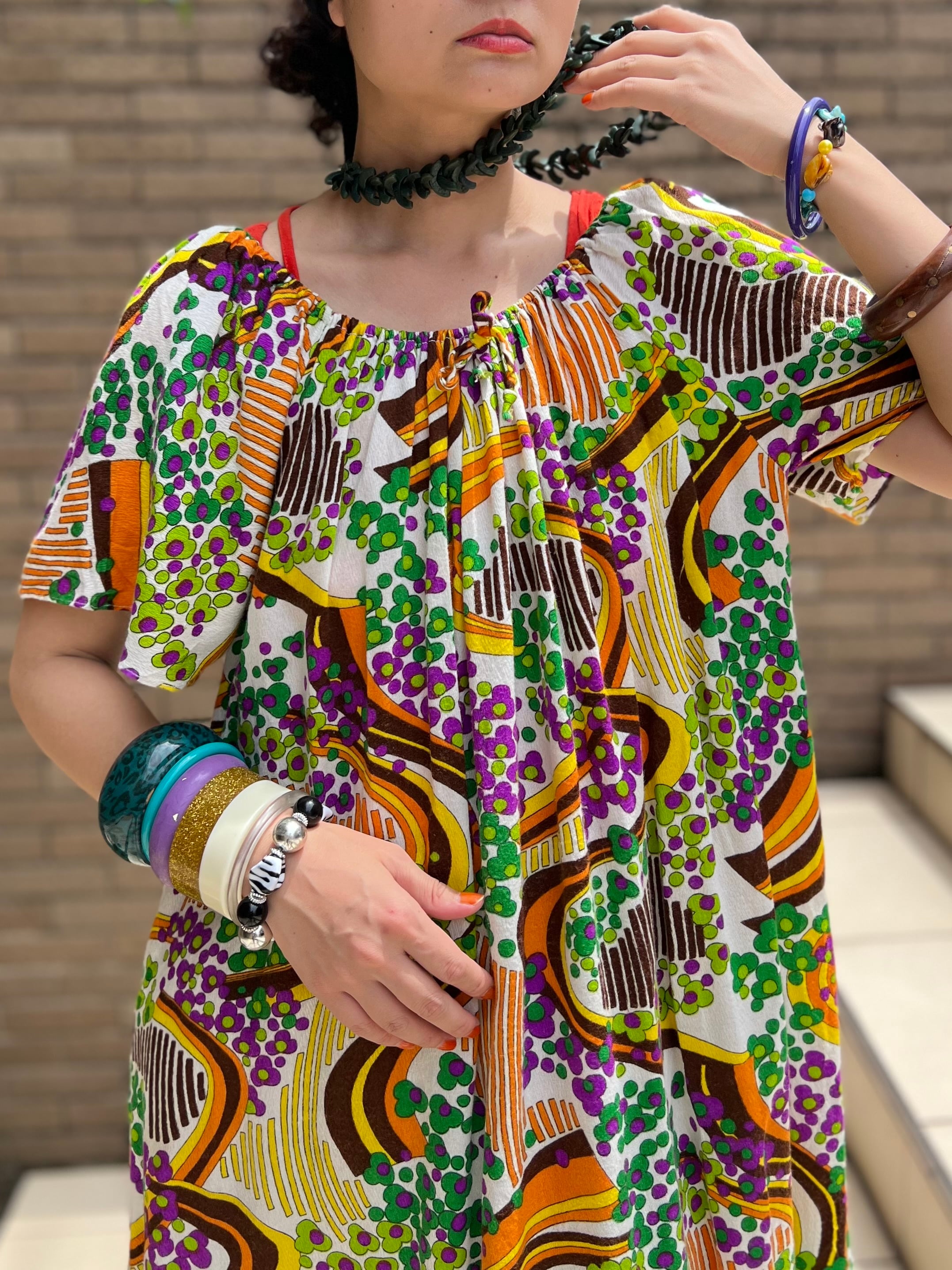 60年代 〜70年代ハワイアン ハンドメイド ホワイト× マルチカラー 花柄コットンワンピースになります。
