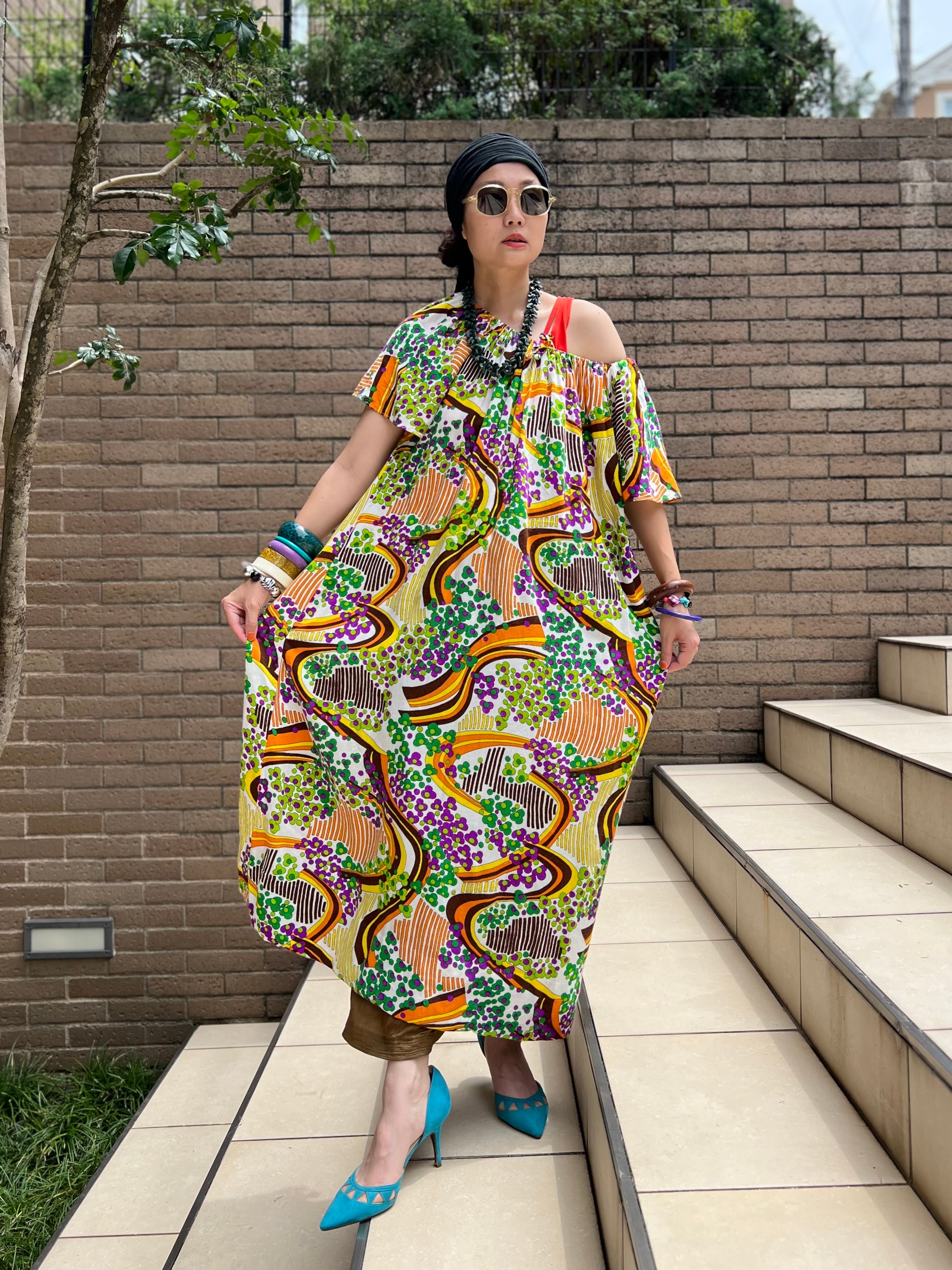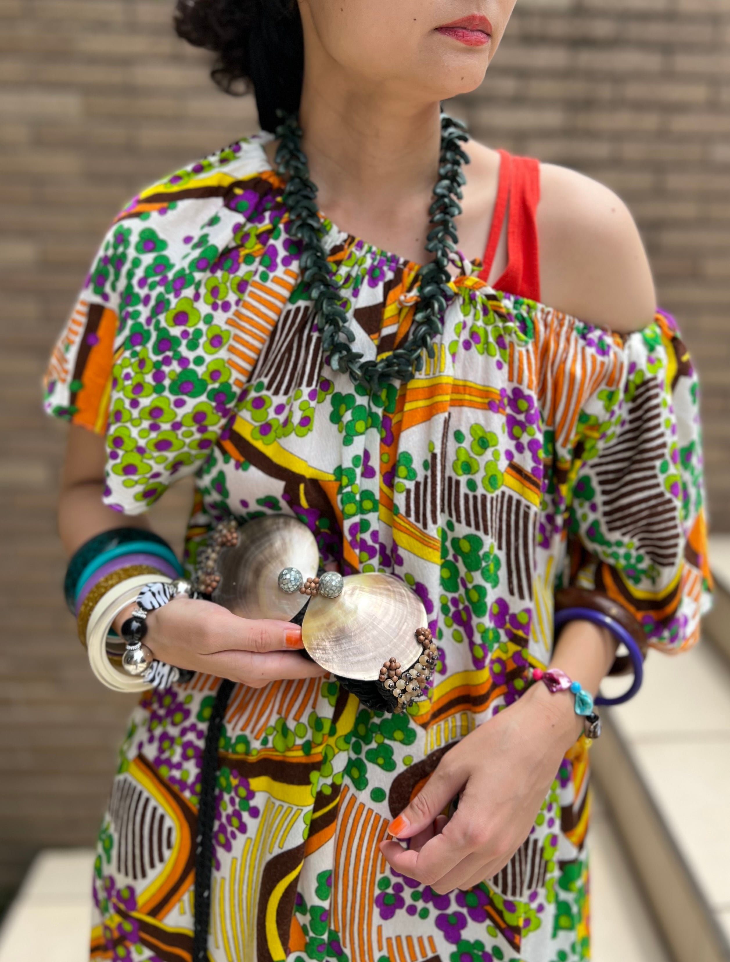 モダンなラインがミックスした ヴィンテージ好きの心擽るハワイアンファブリックが魅力の一枚です。