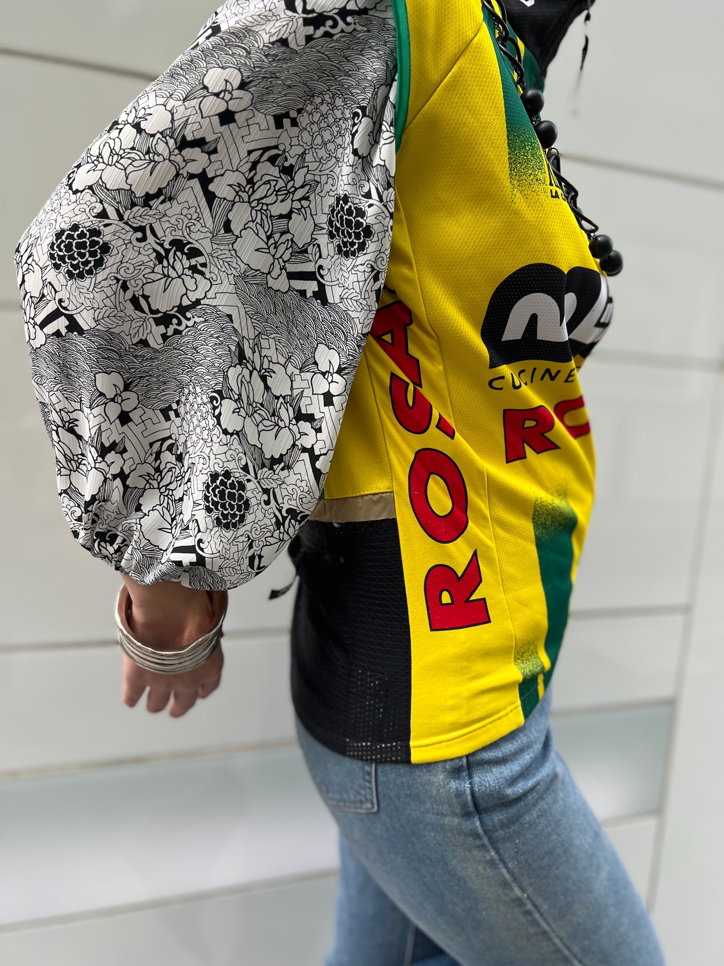 ロゴやグラフィックが大胆に配置された、存在感のある一着です。