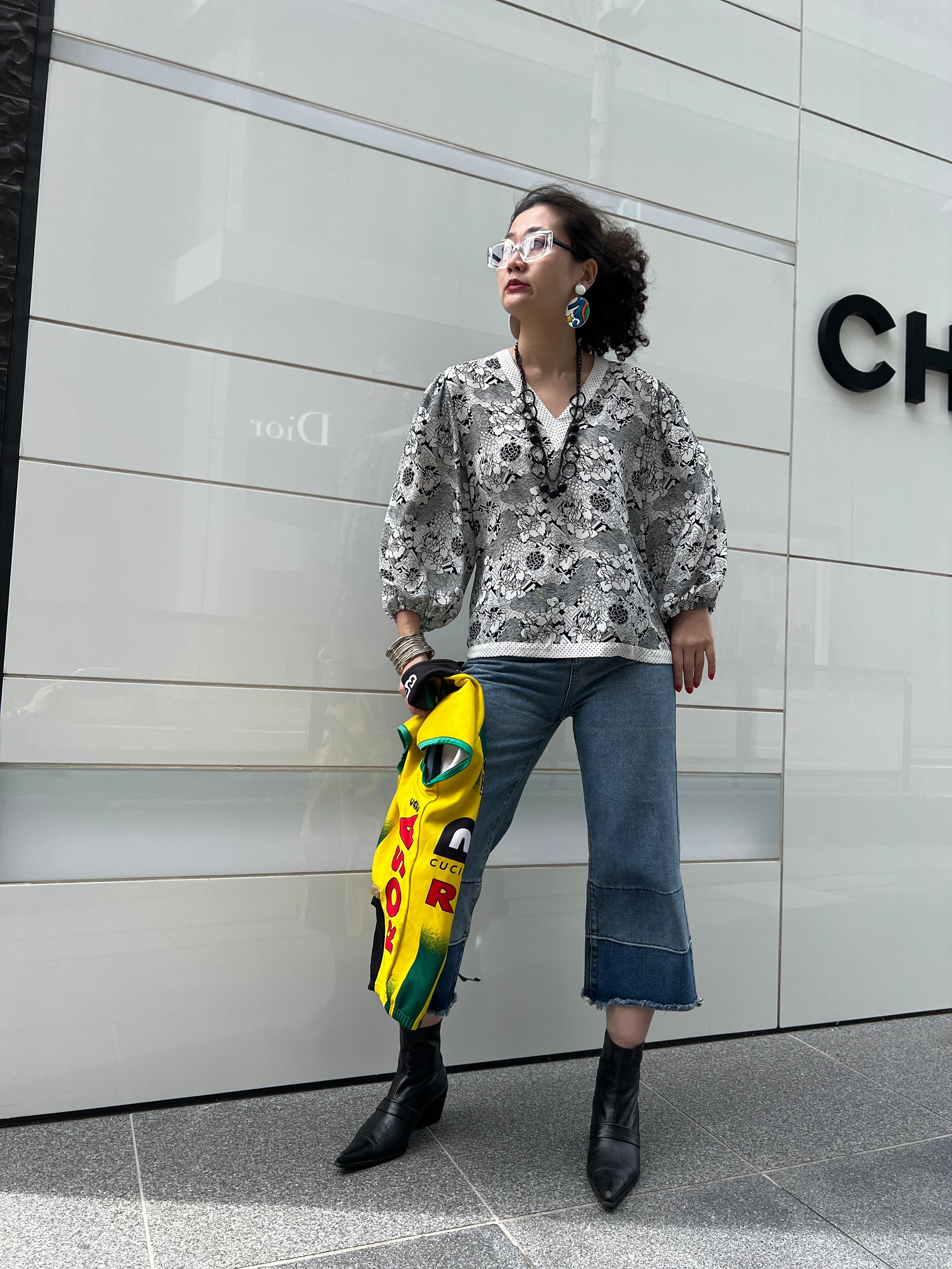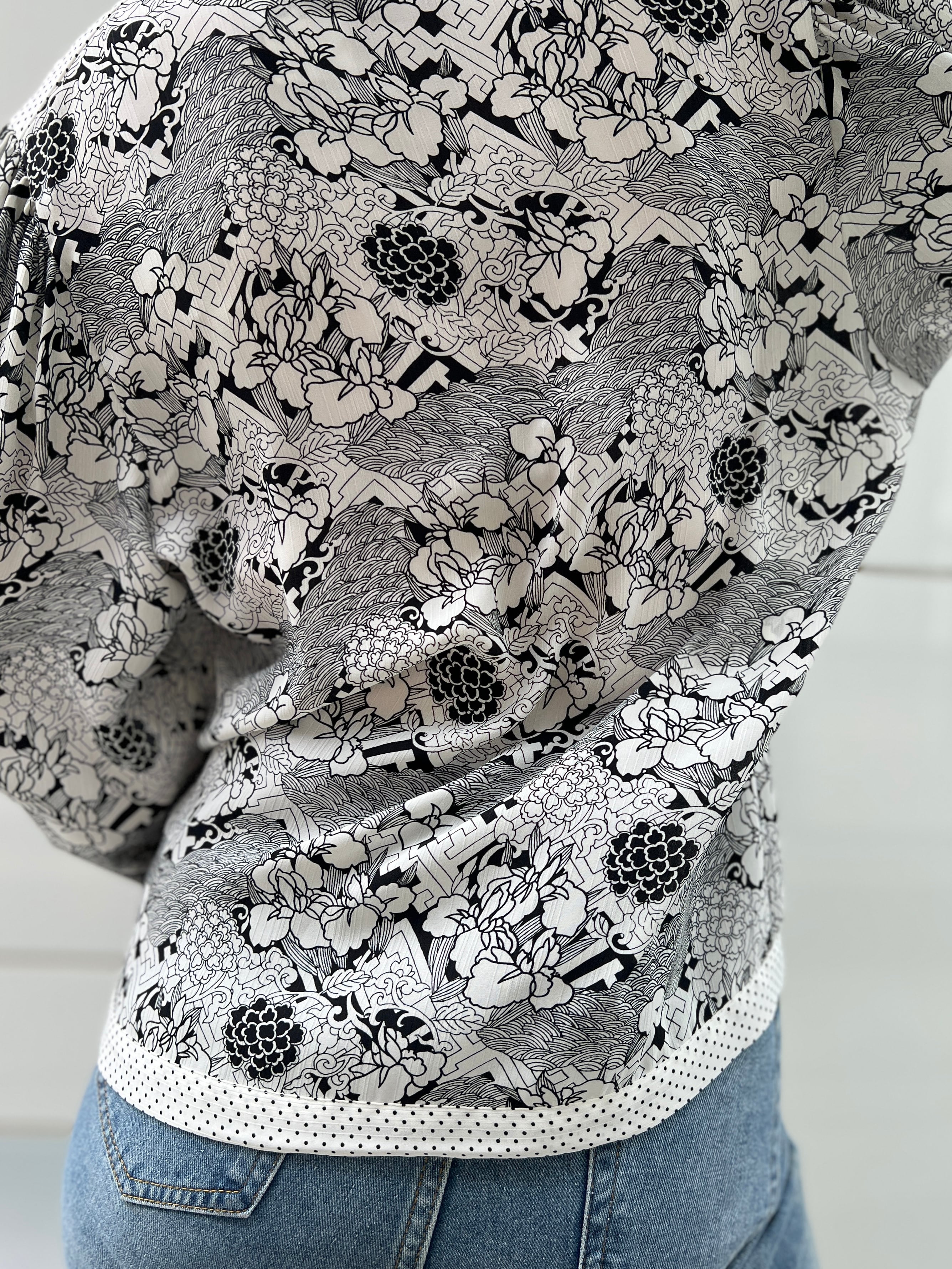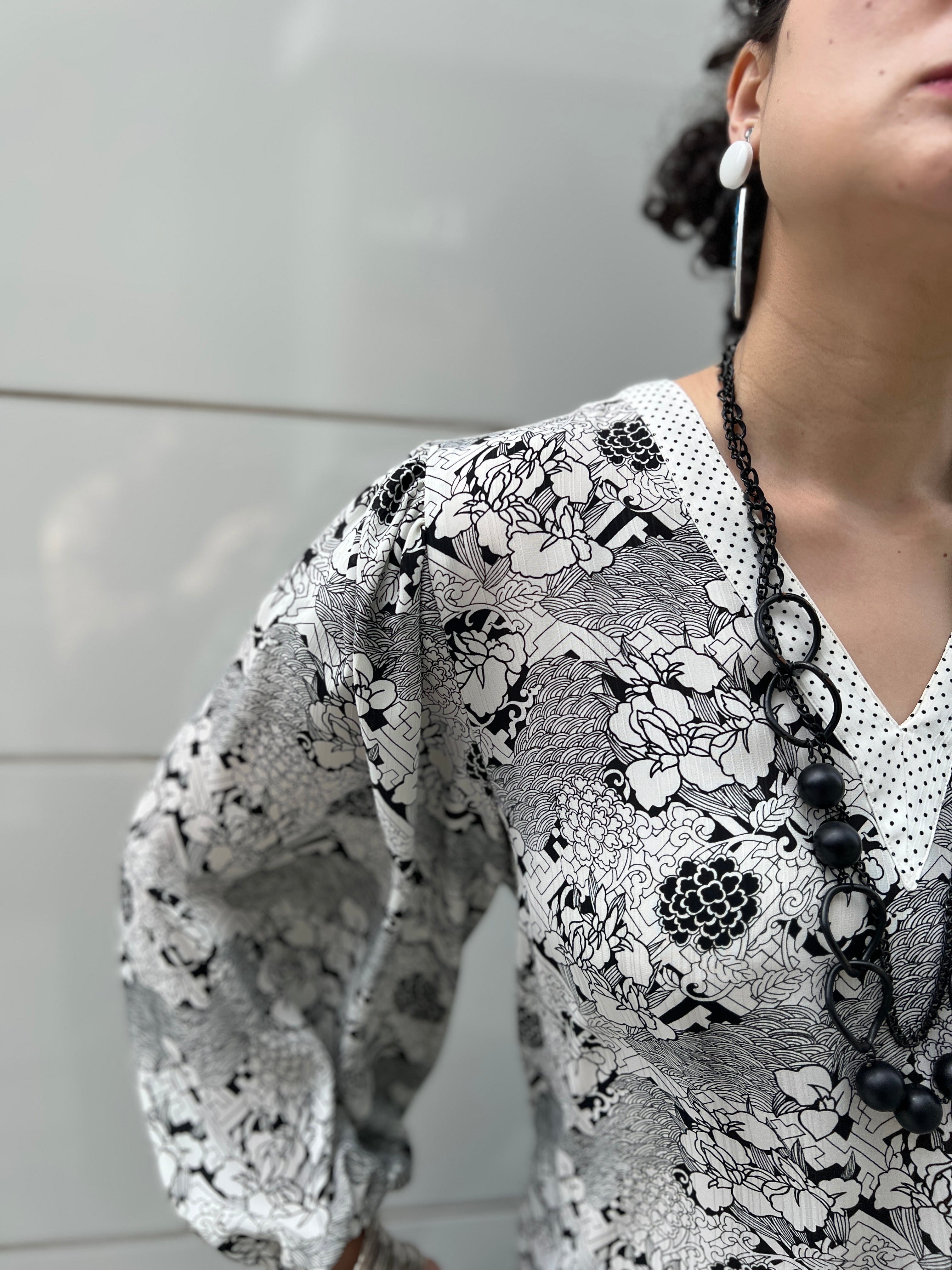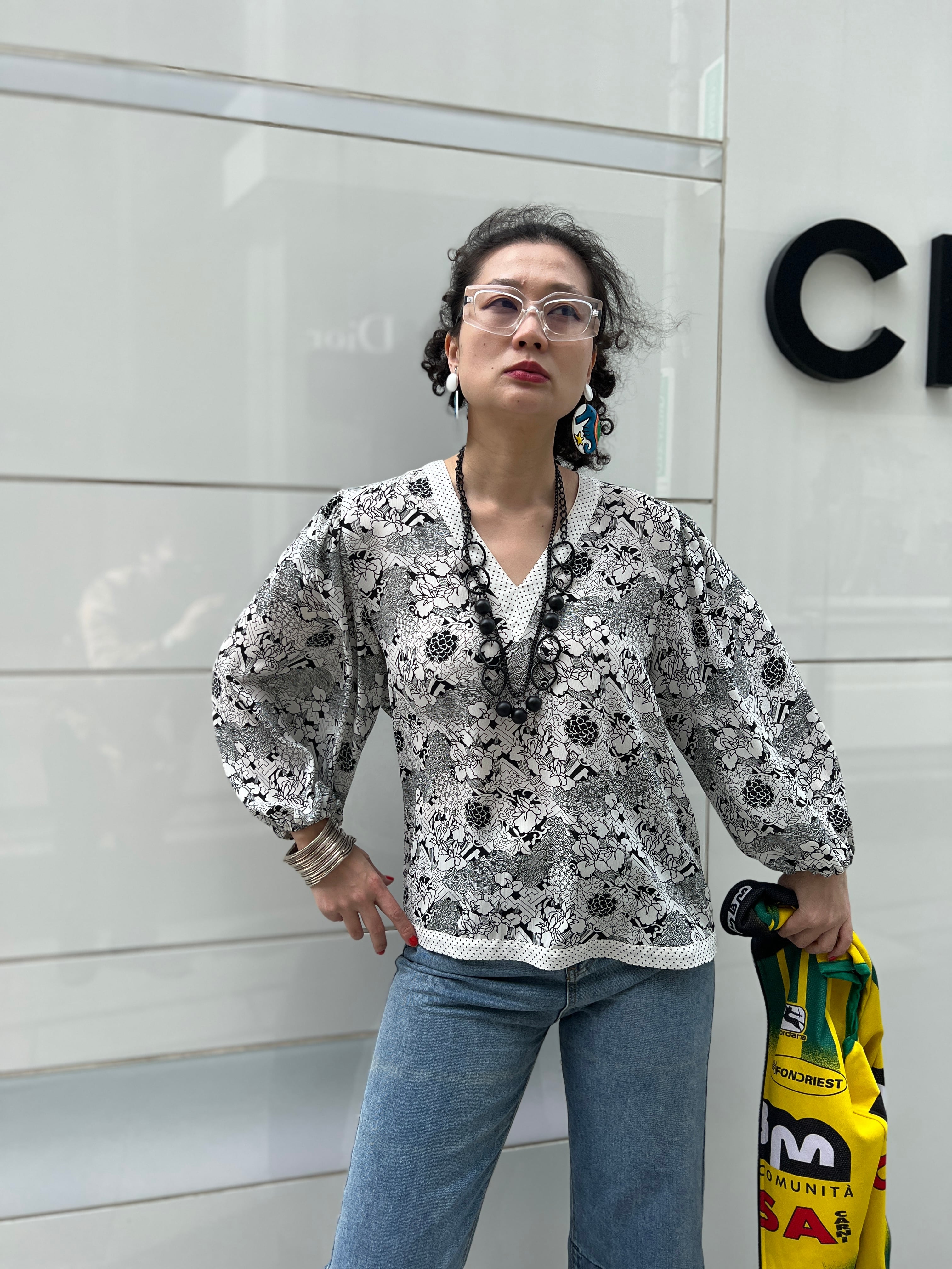 モノトーンで描かれた繊細なフラワーと幾何学模様が印象的な、ダイアンのヴィンテージブラウス。