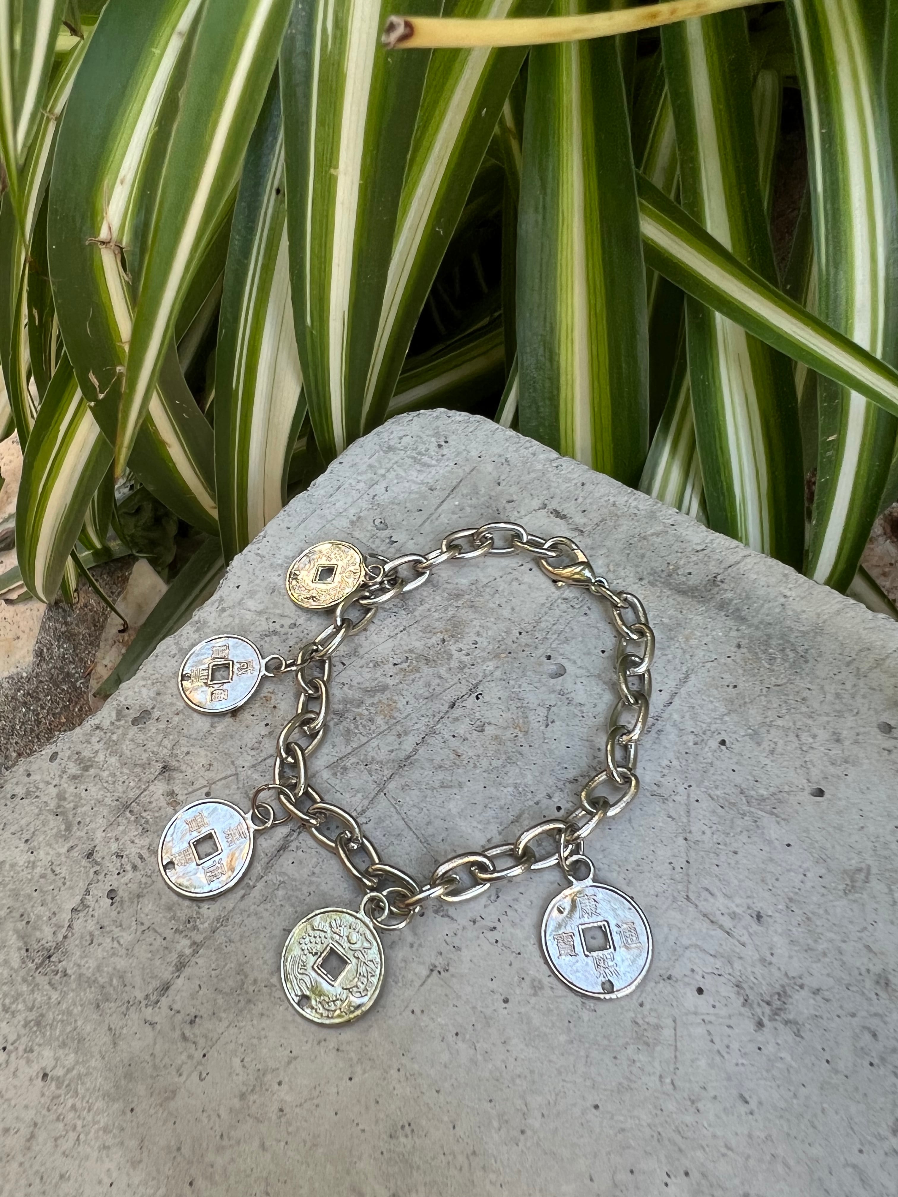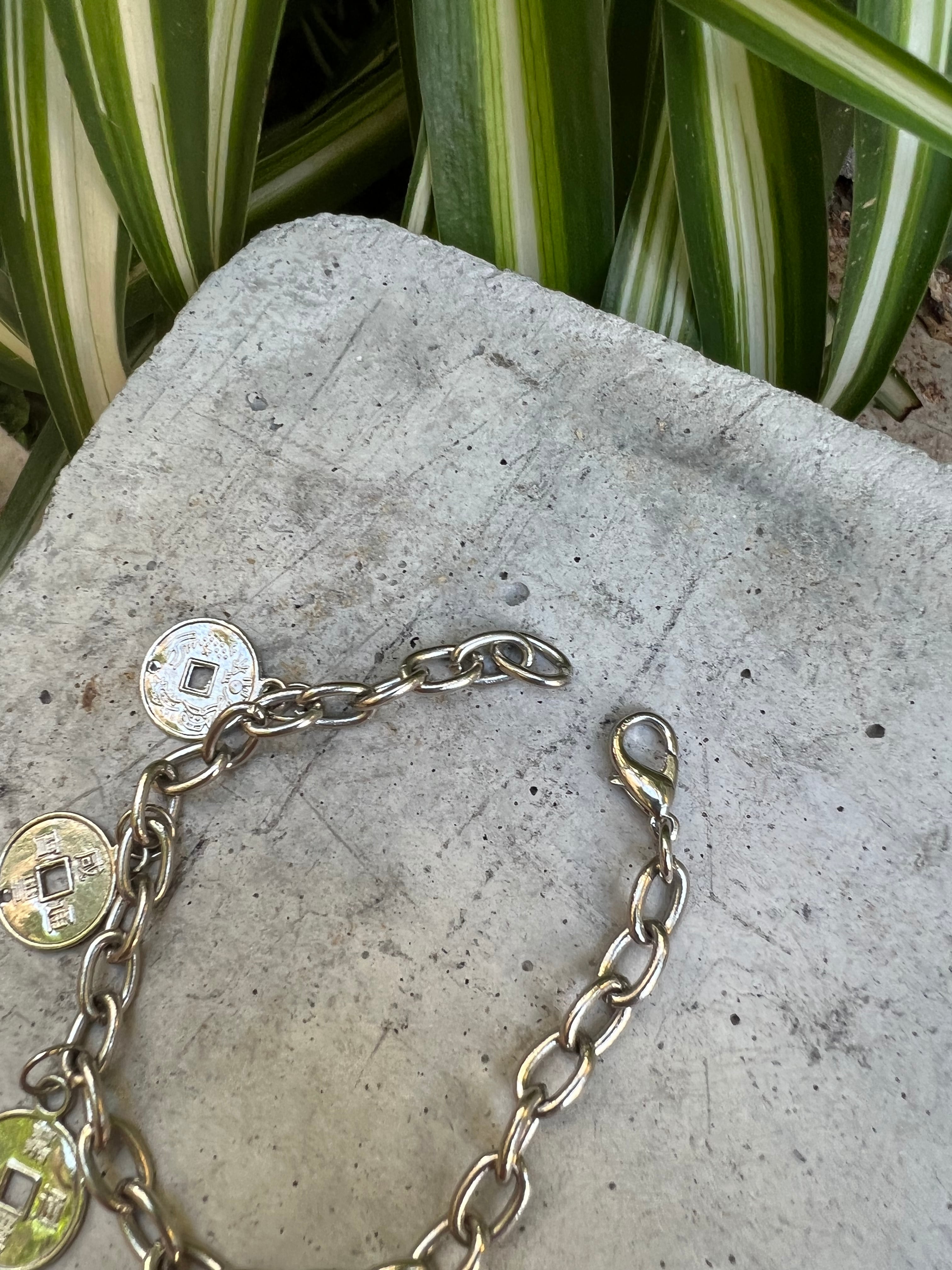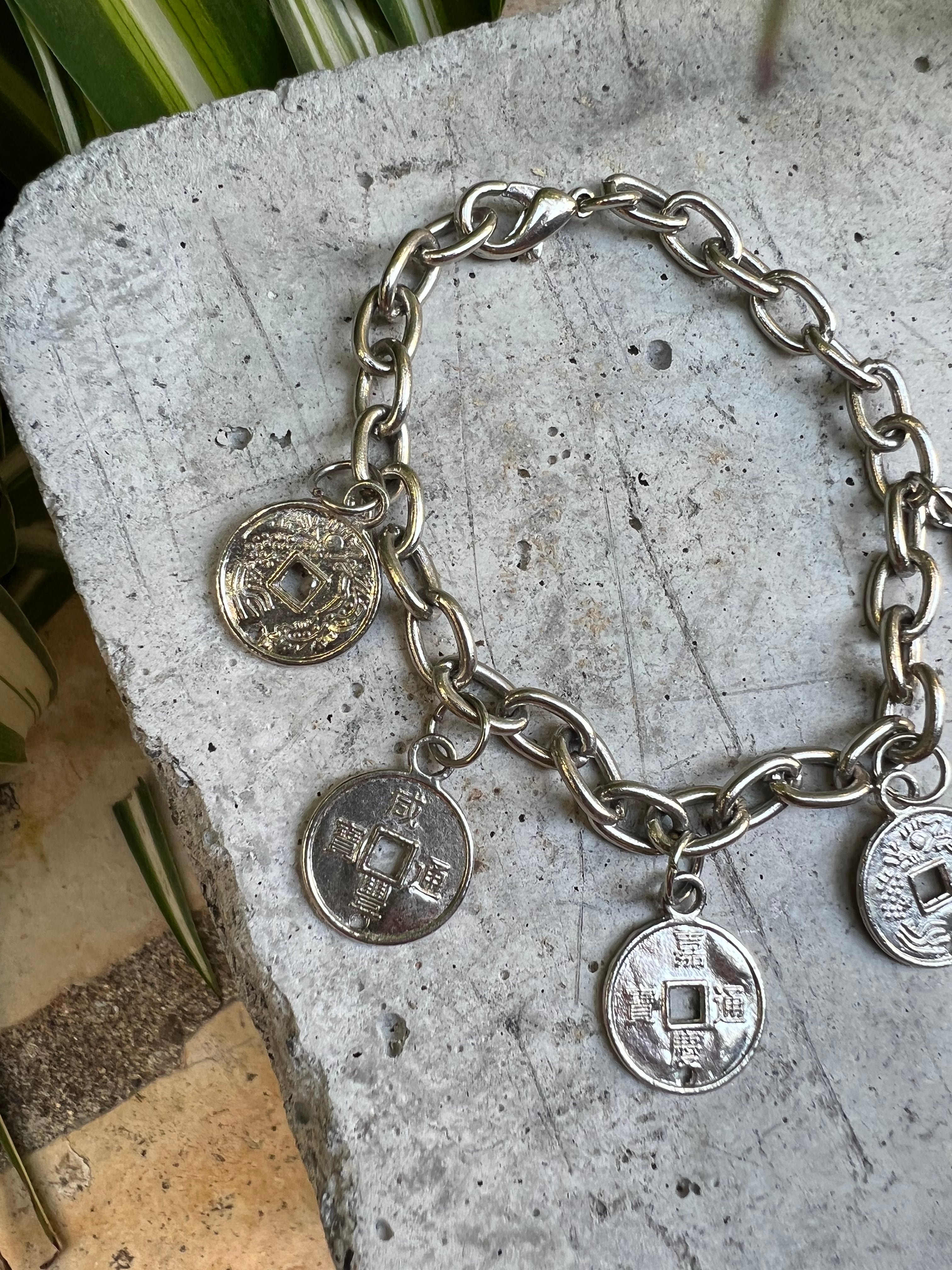 コインチャームが揺れる、ヴィンテージチェーンブレスレット。