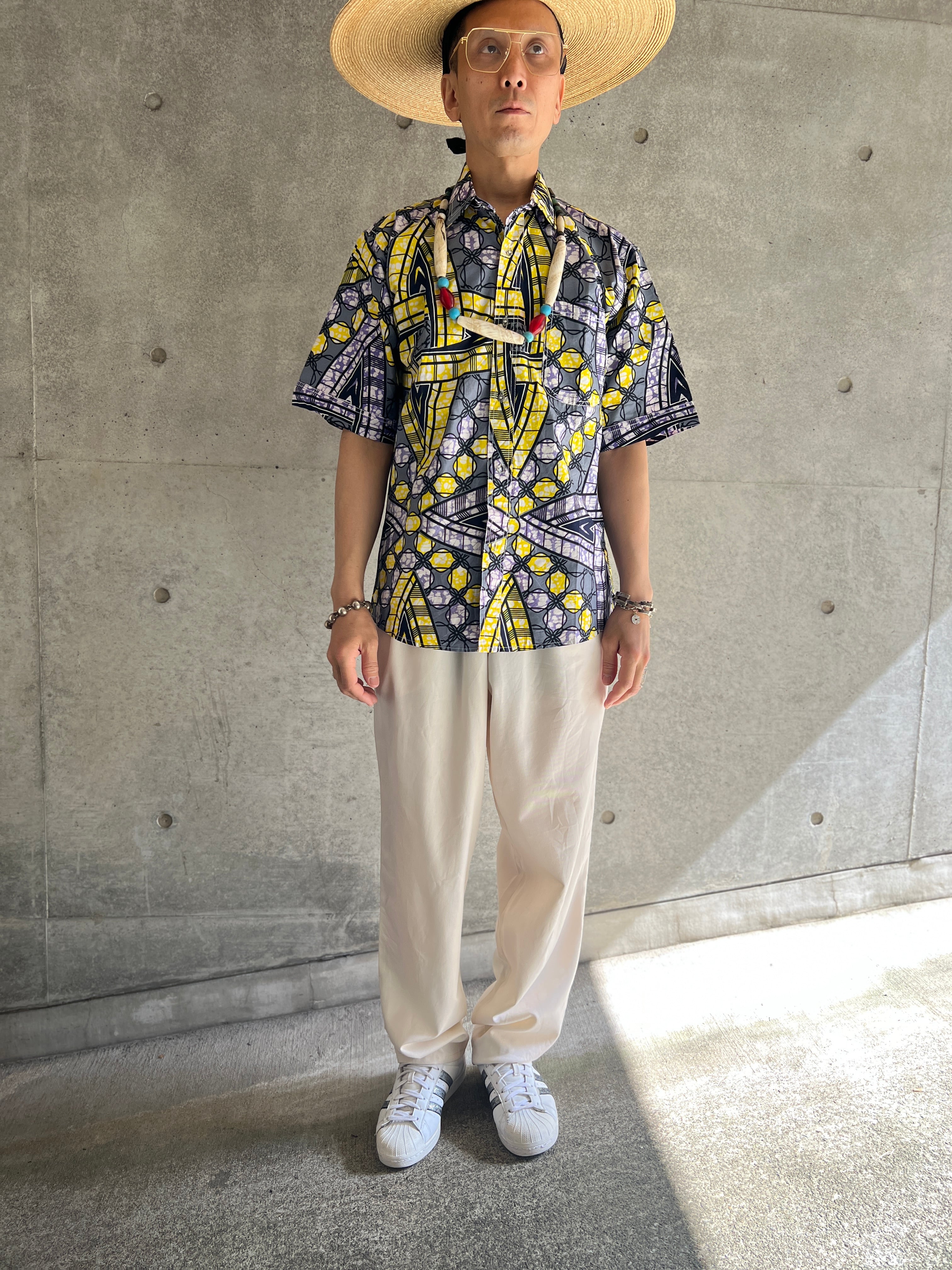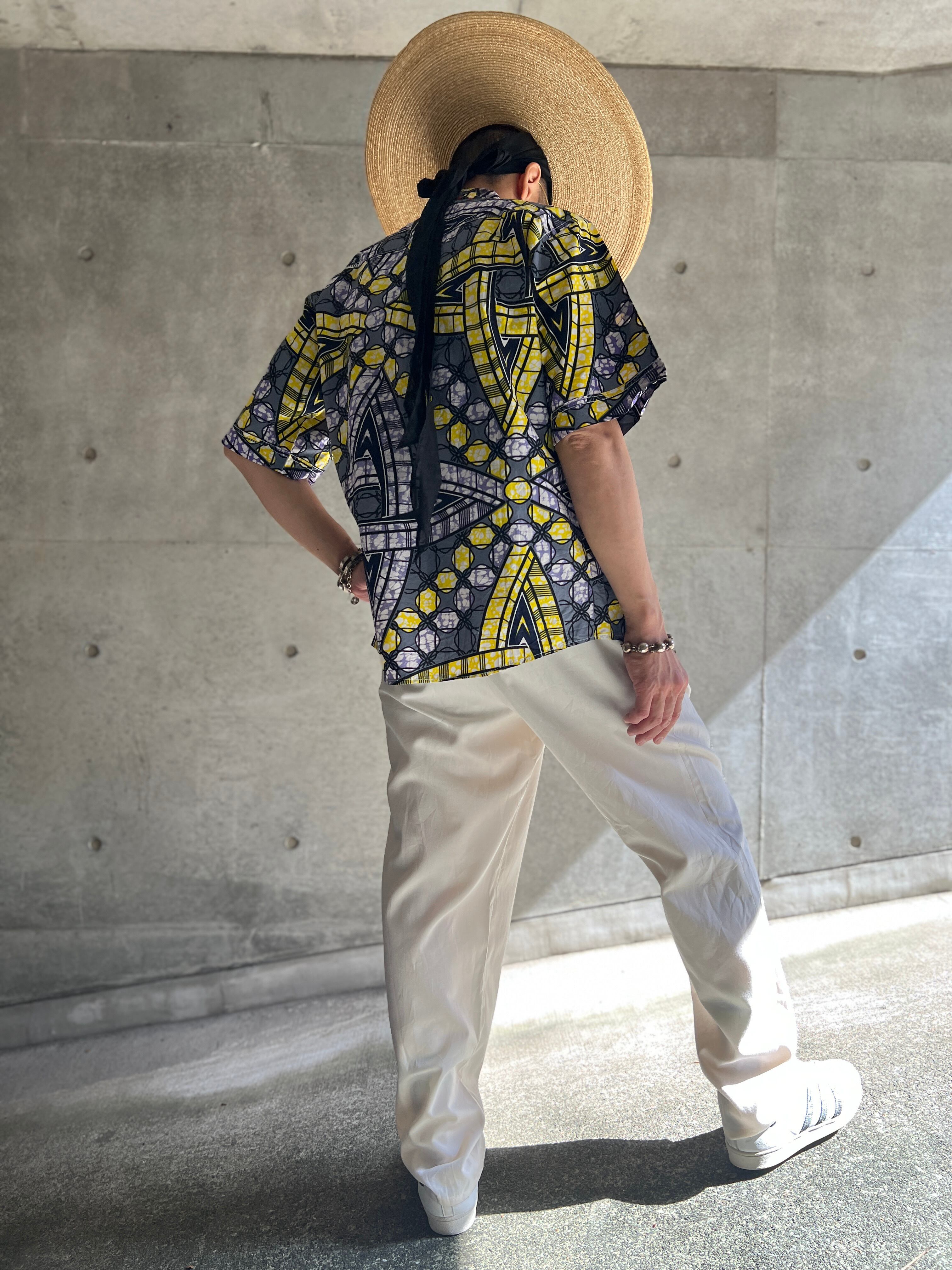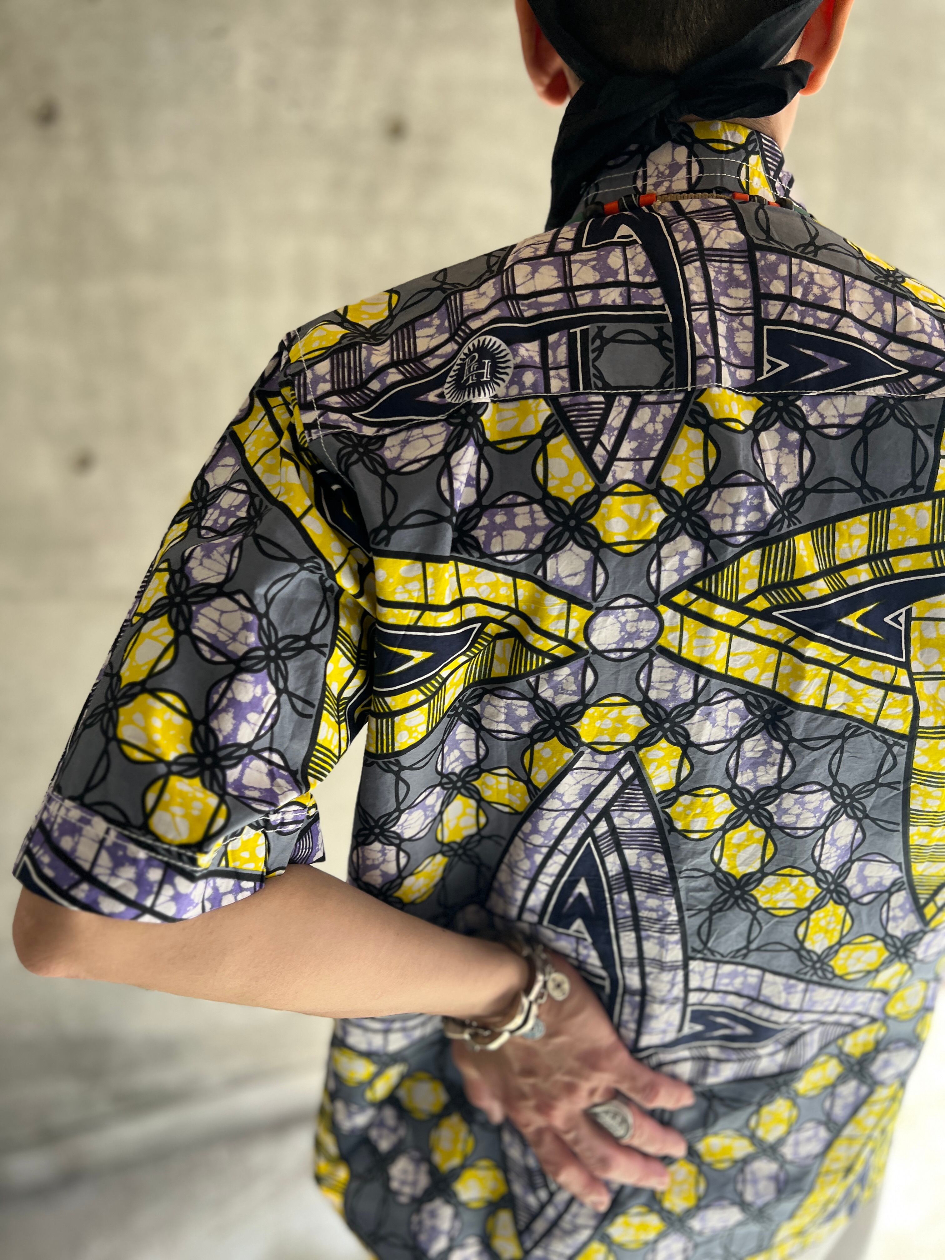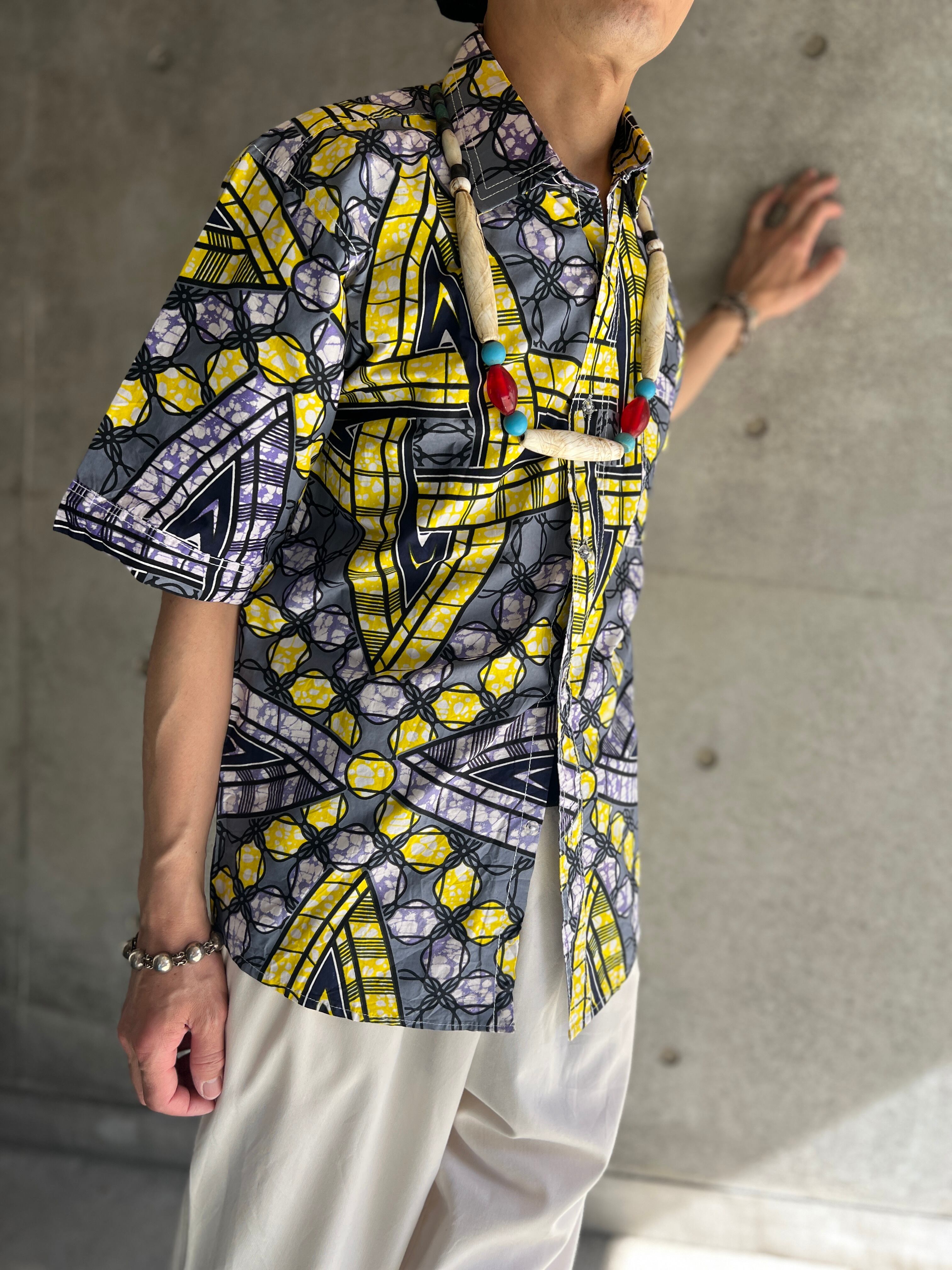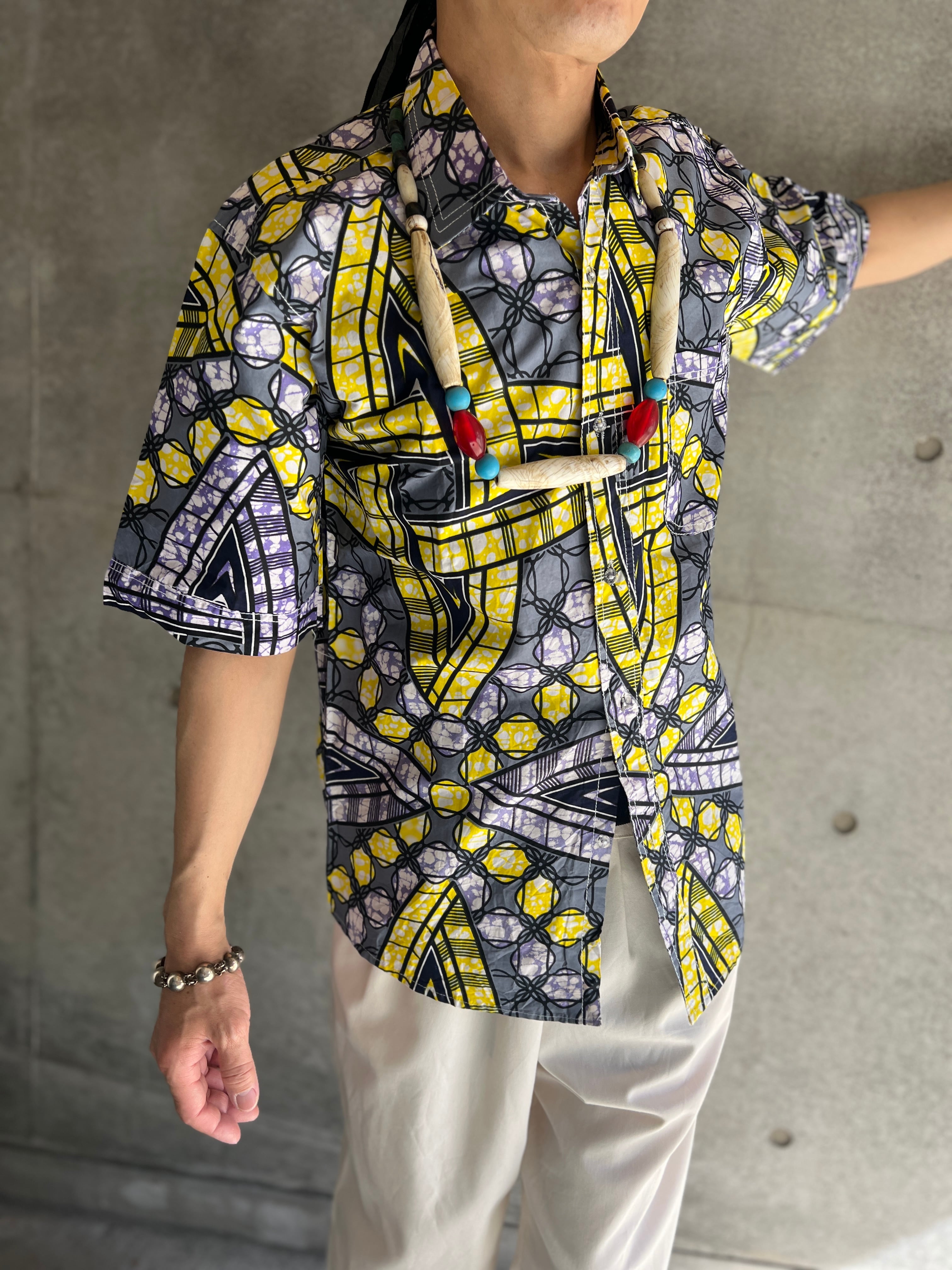アフリカンテキスタイル特有の大胆なパターンが印象的な半袖シャツ。