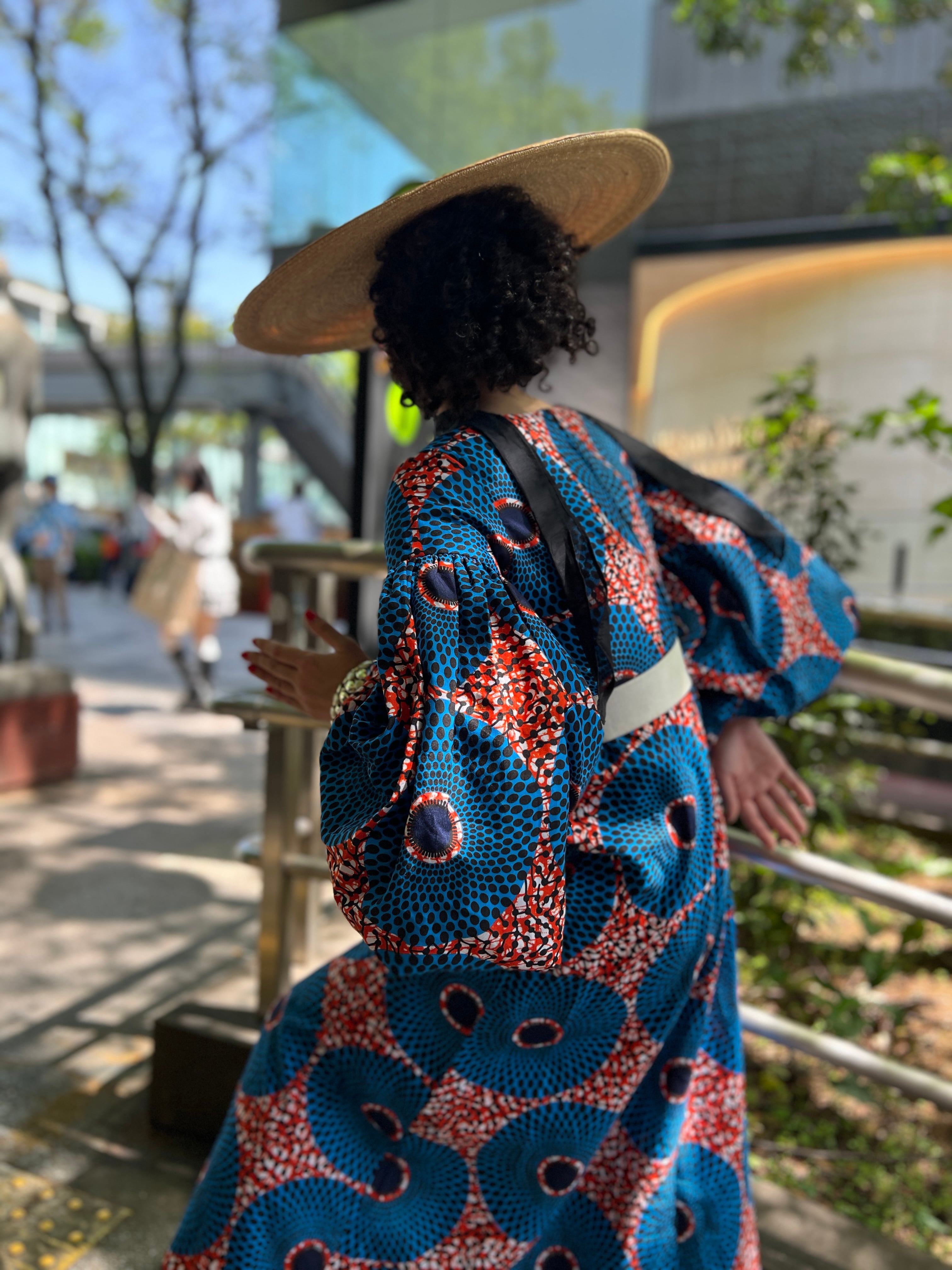 大胆な円形モチーフが印象的なアフリカンバティックのロングワンピース。