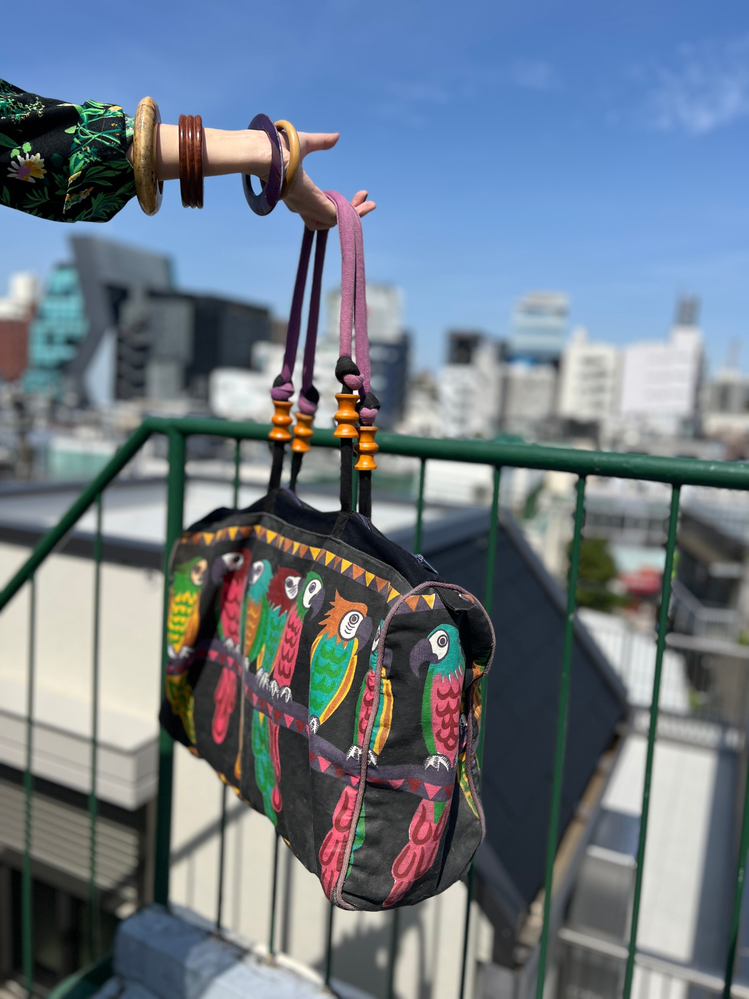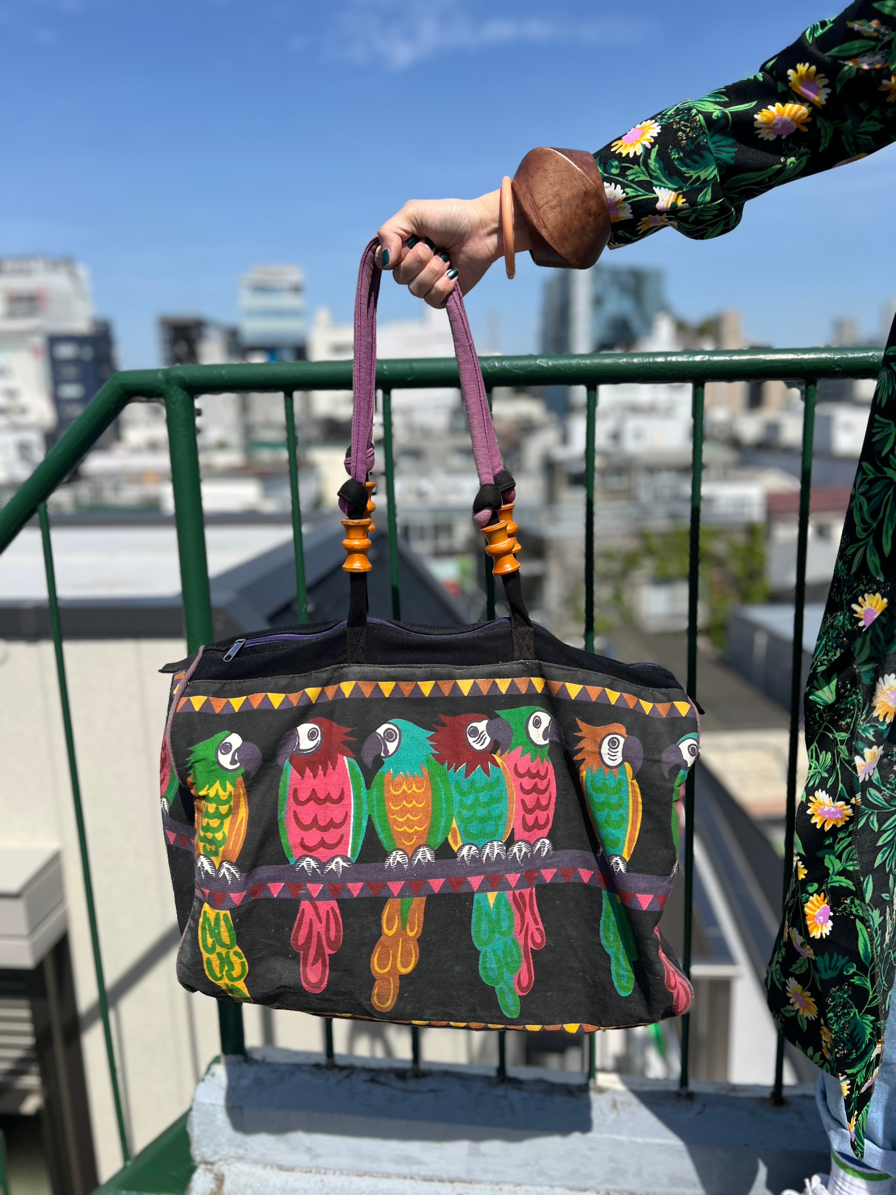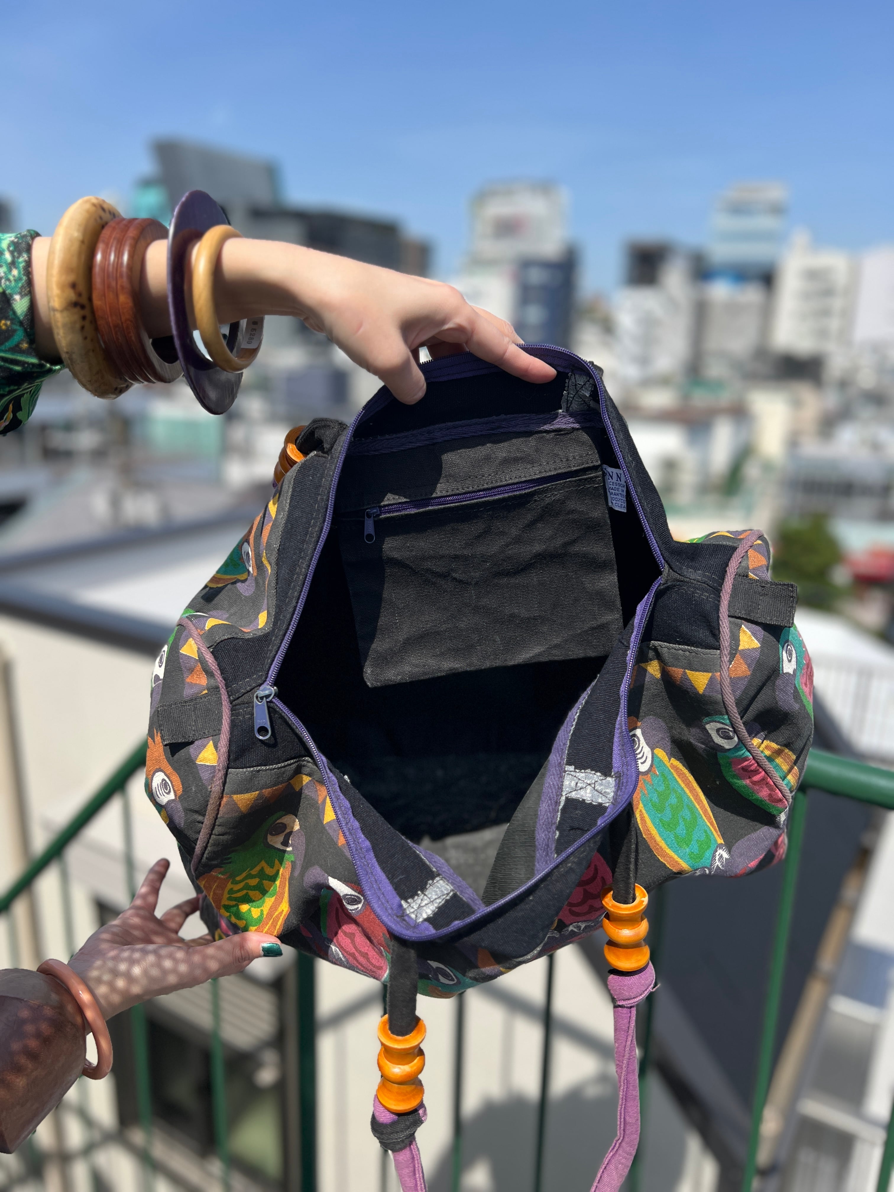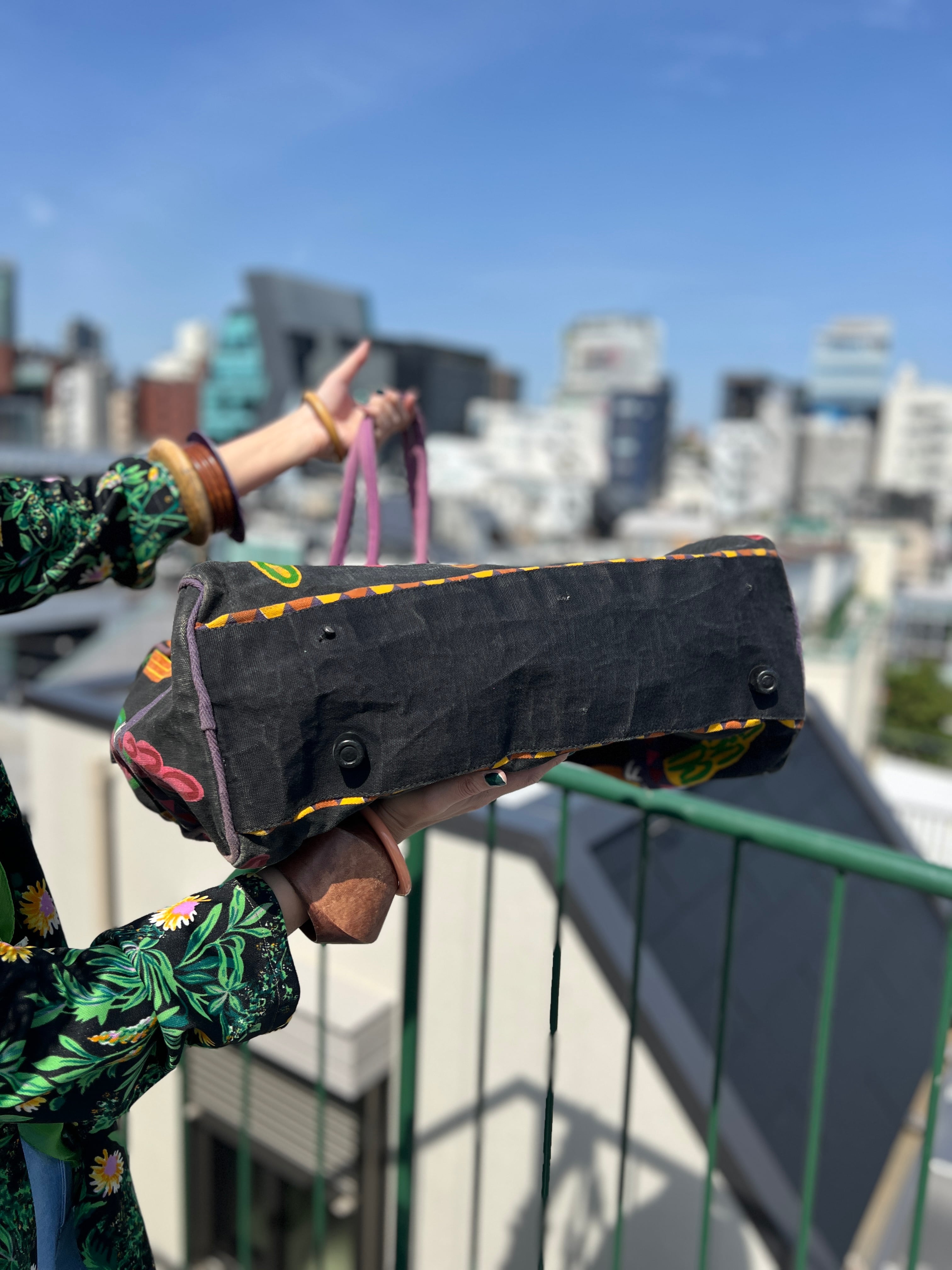 Vintage black × bird cotton big bag ( ヴィンテージ ブラック × 鳥 コットン ビッグ バッグ )