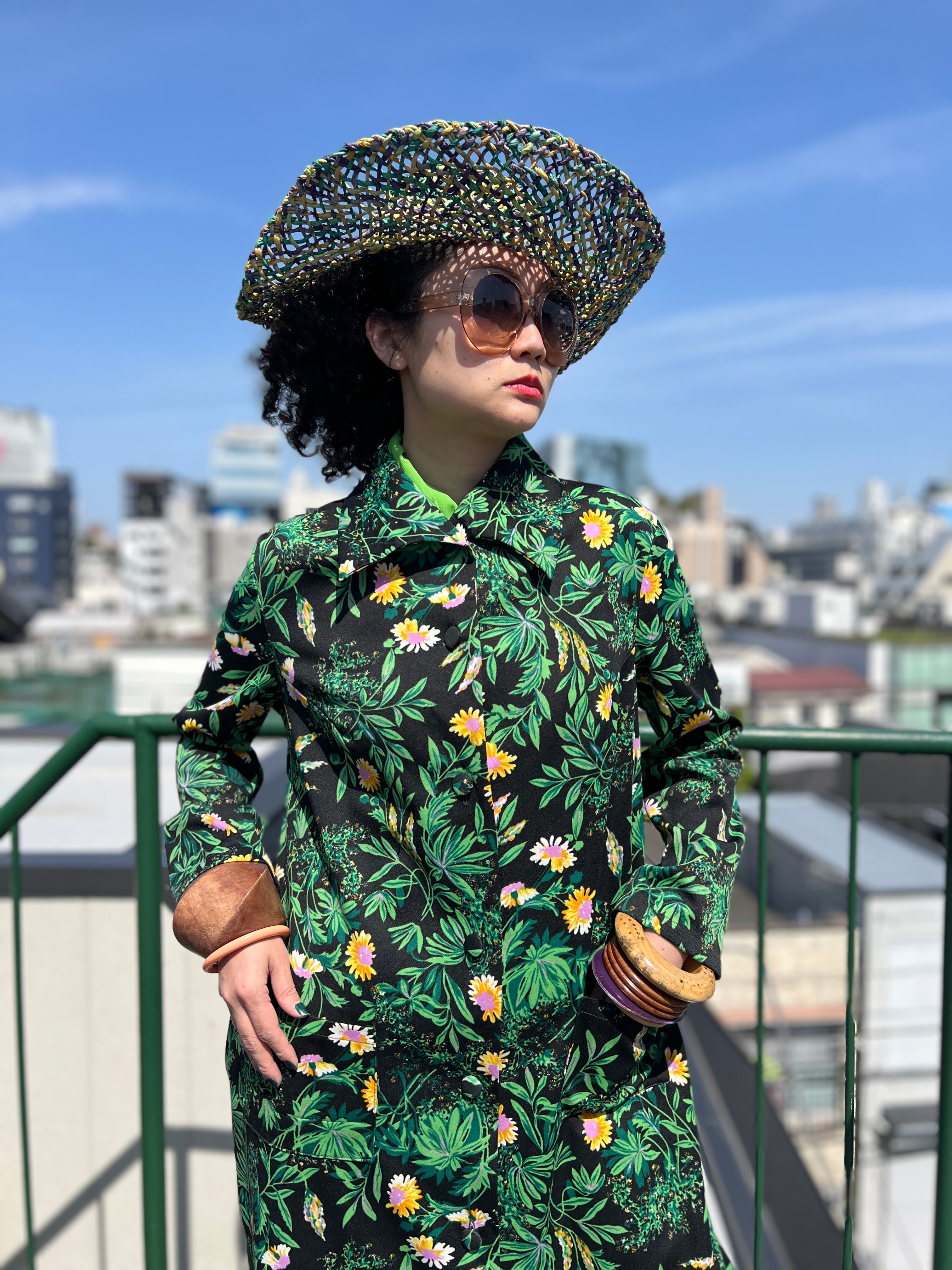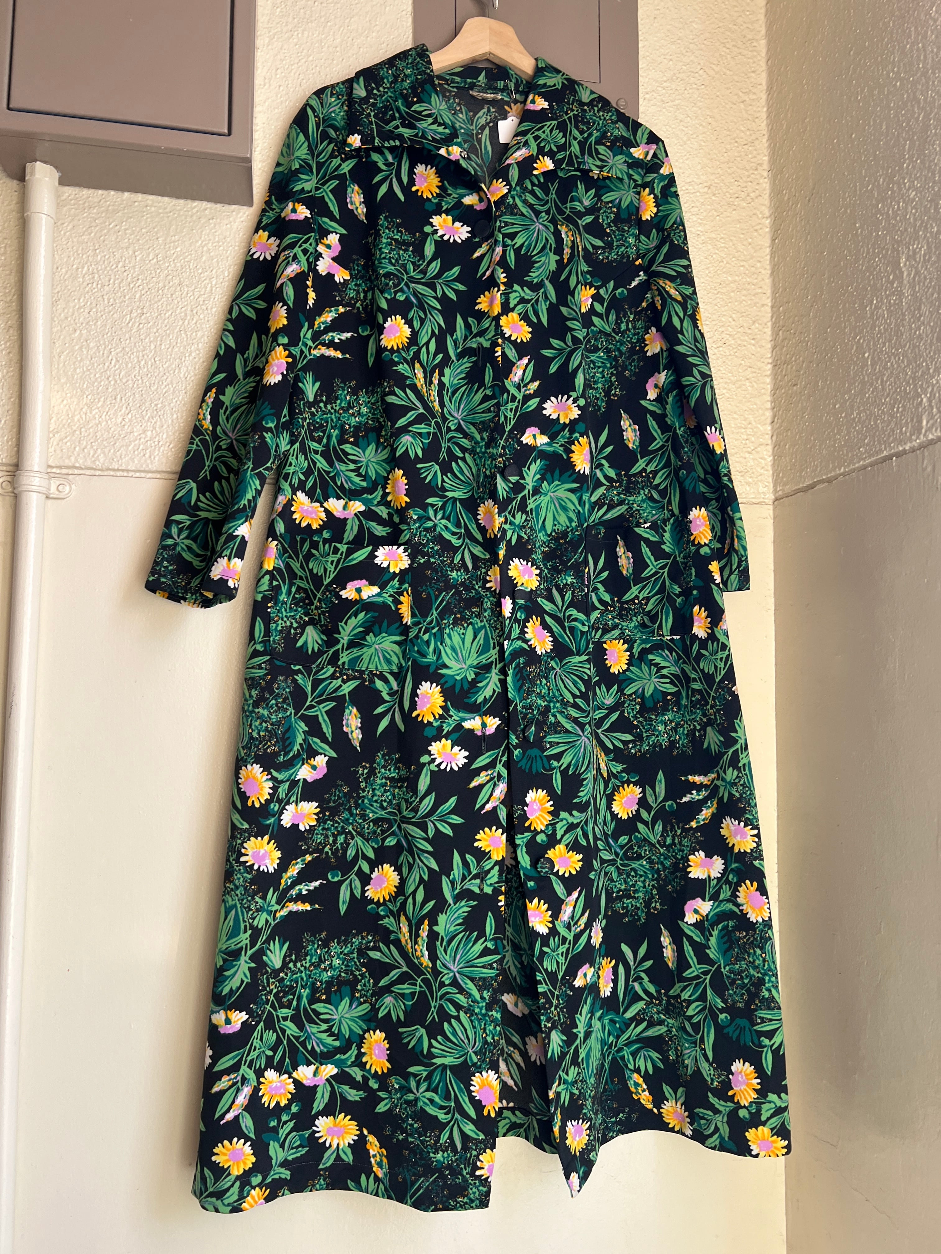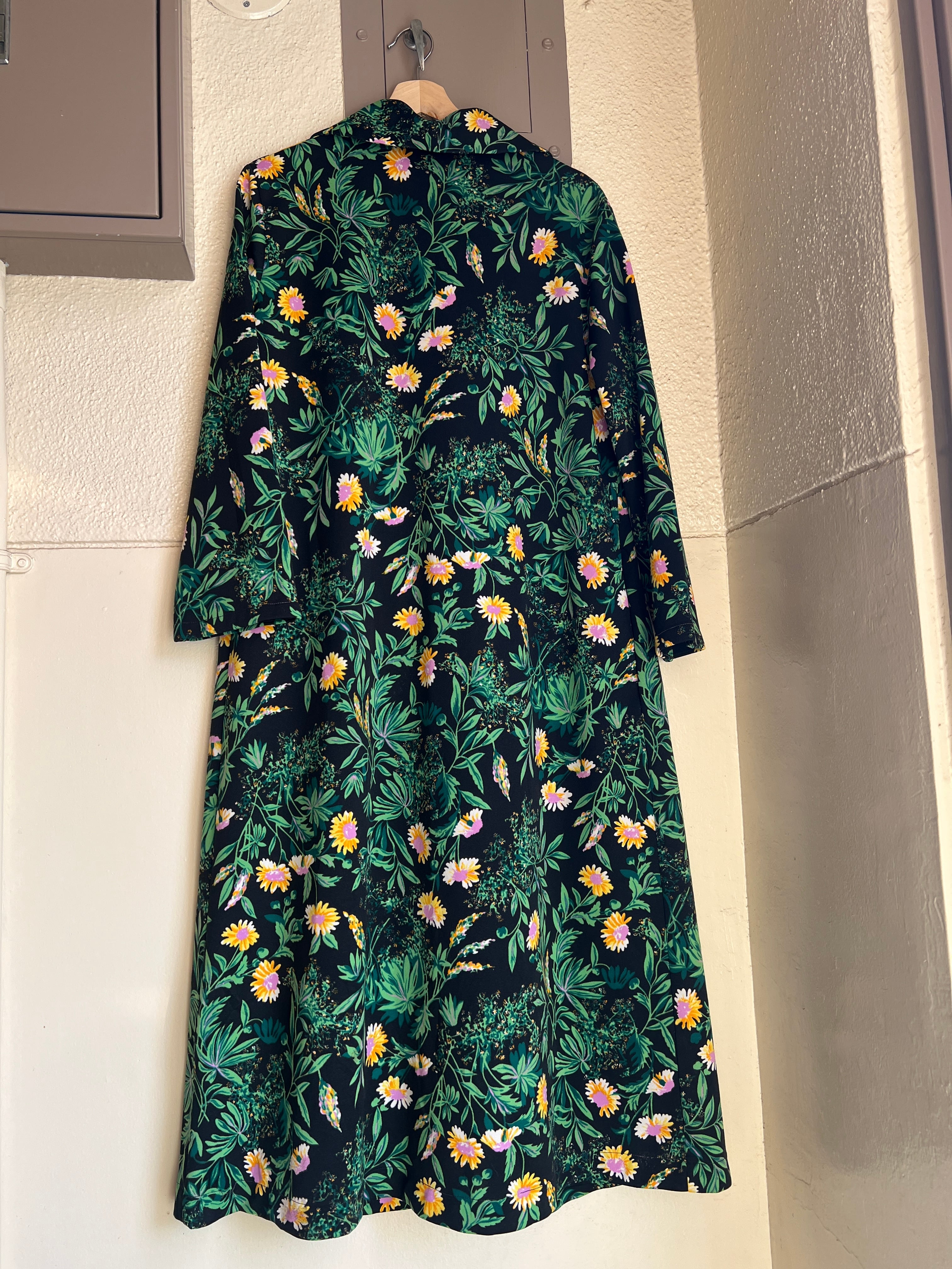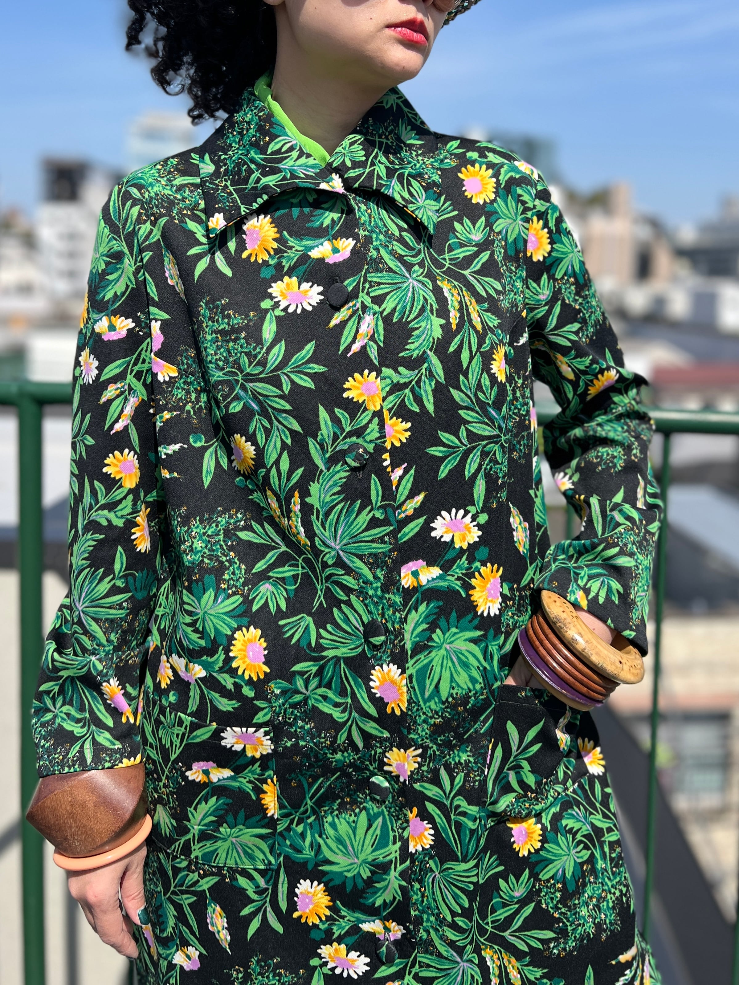 70年代 ブラック × グリーン 花柄 ポリ 羽織りワンピースになります。