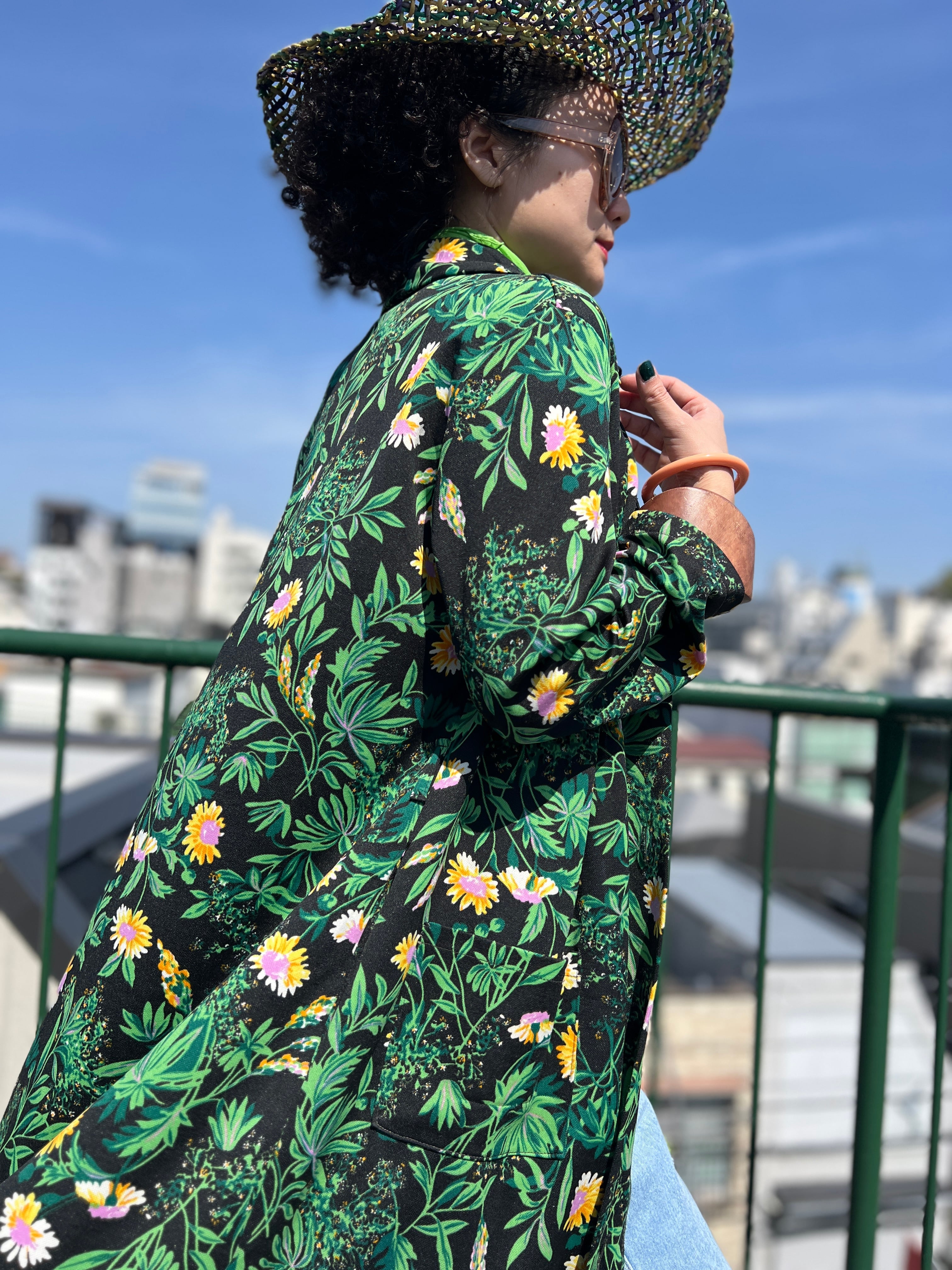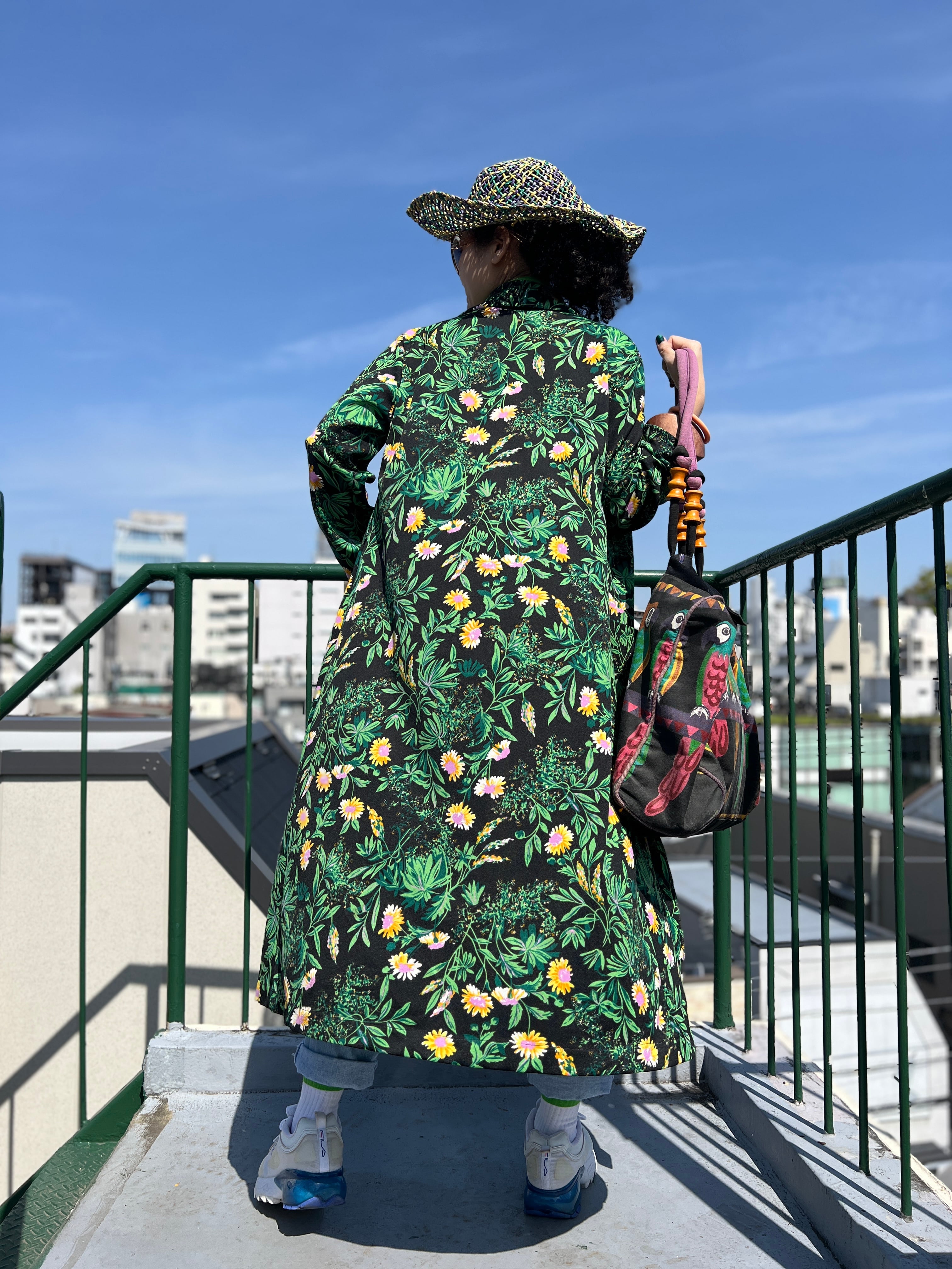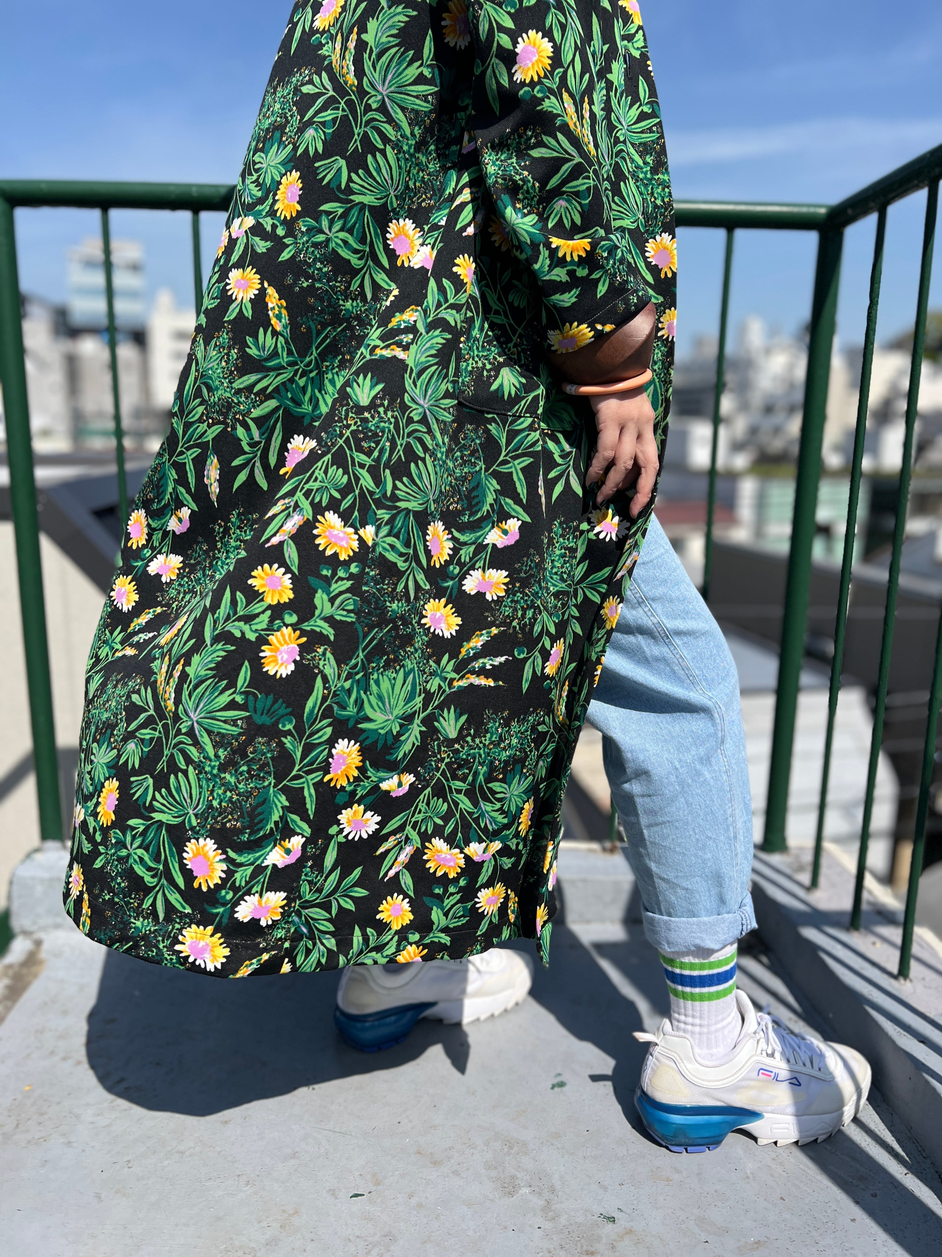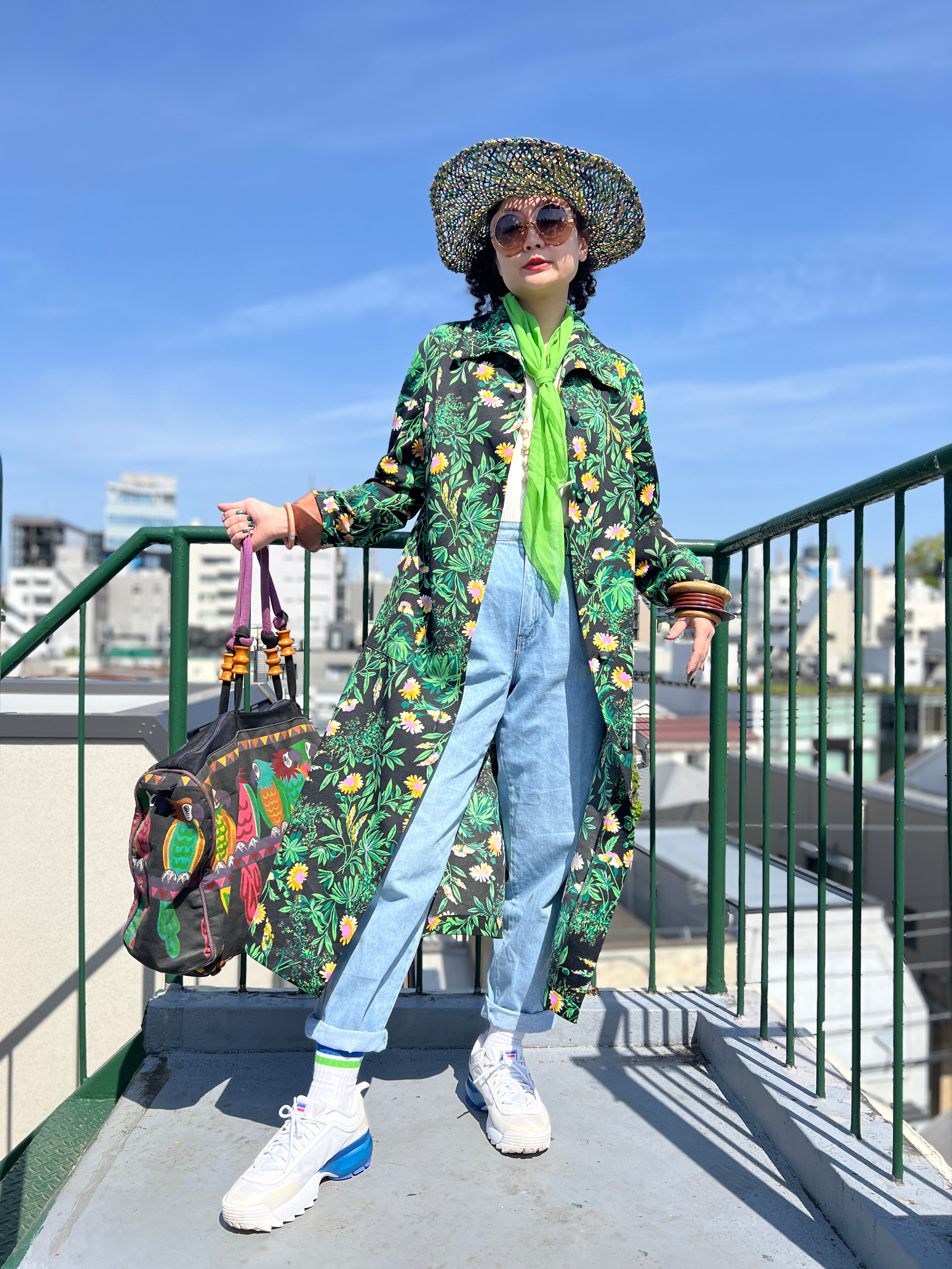 70年代 ブラック × グリーン 花柄 ポリ 羽織りワンピースになります。