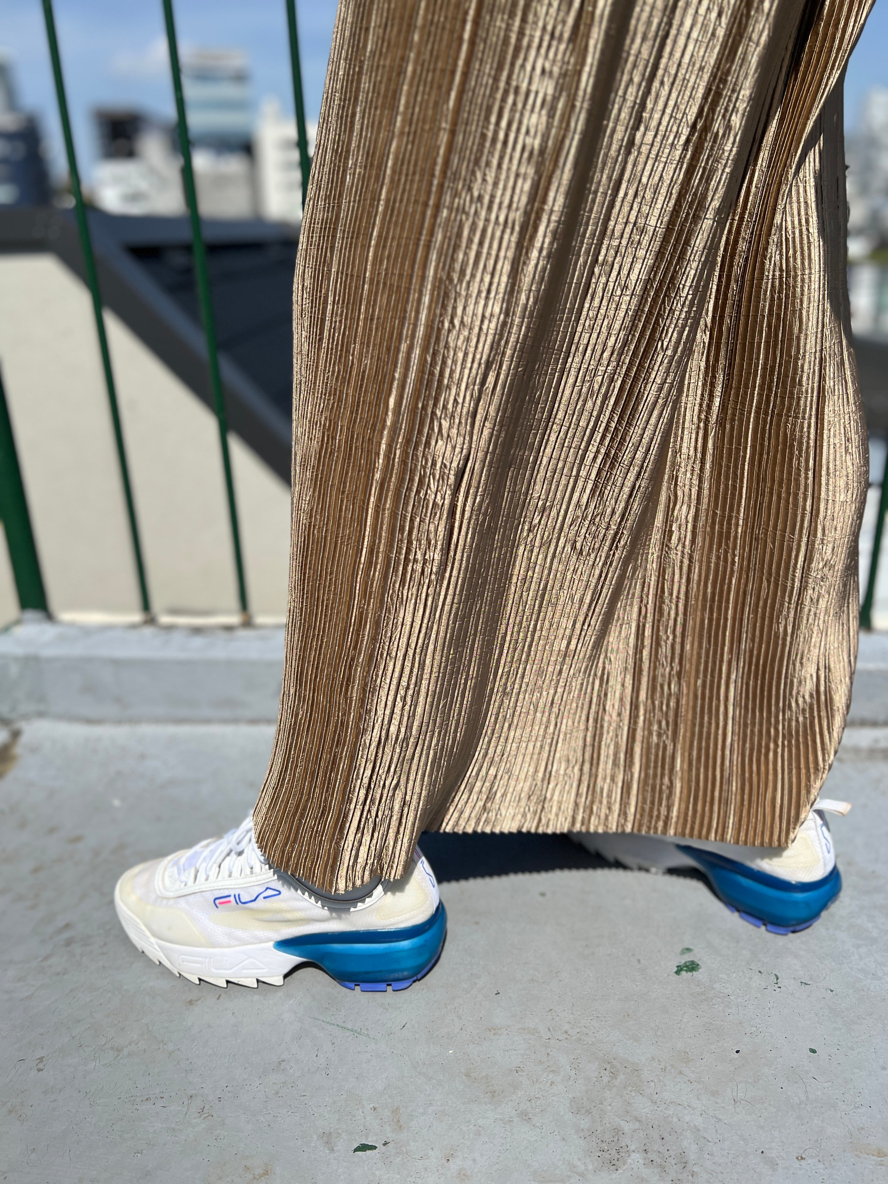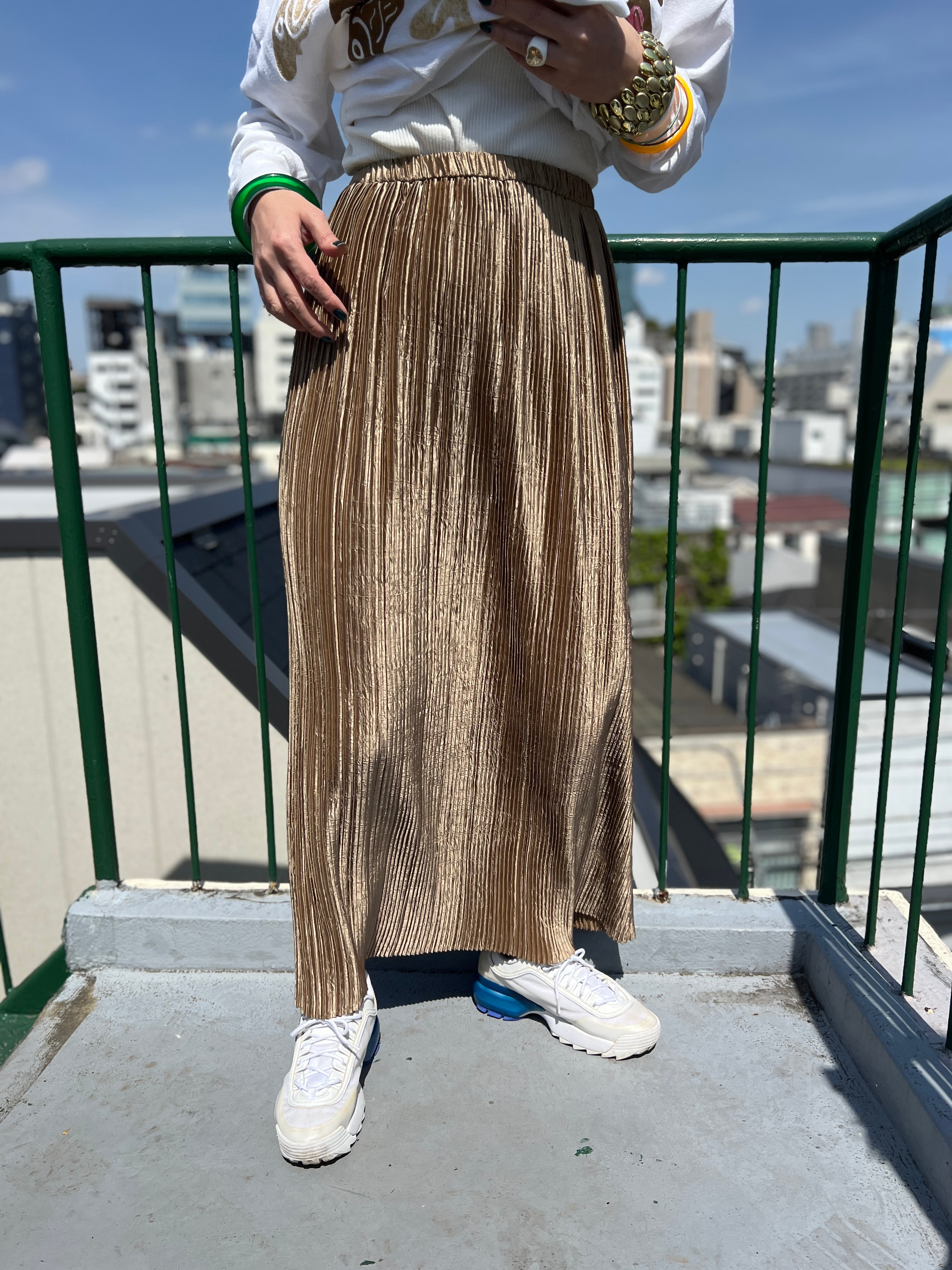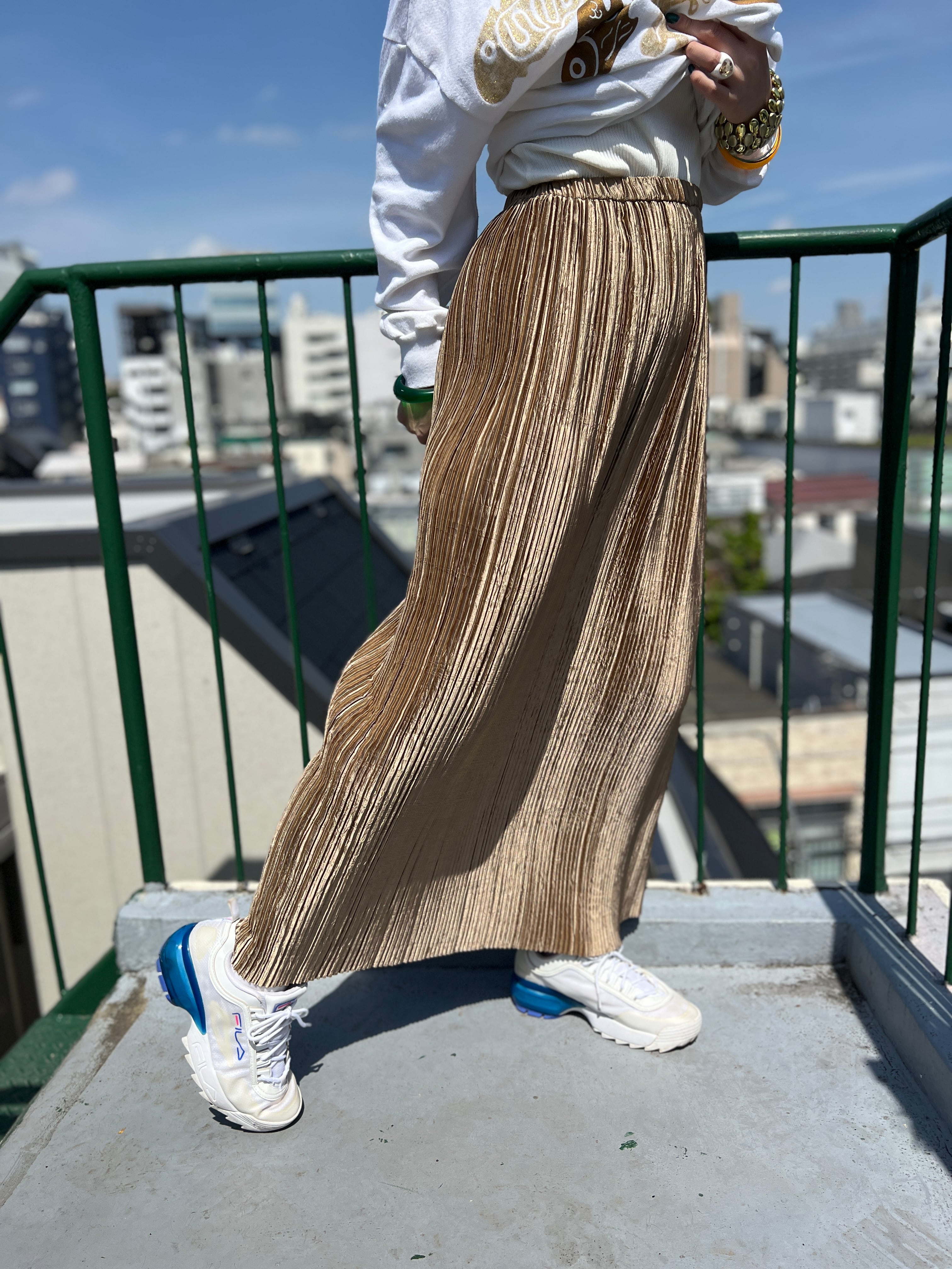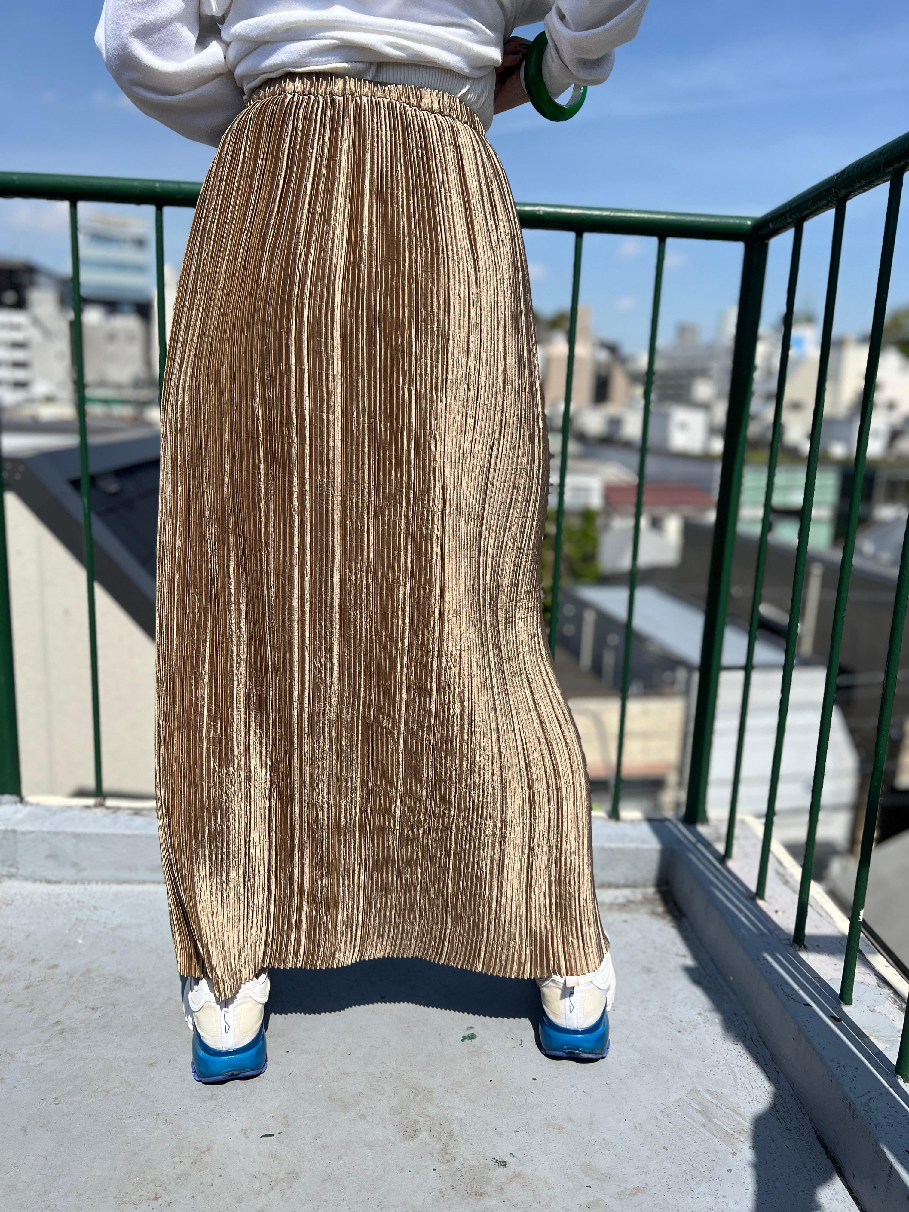 こちらは、光の当たり方で表情を変えるゴールドカラーが印象的な一着。細やかなプリーツが縦のラインを強調し、動くたびに美しく揺れ、スタイリング全体を一気に格上げしてくれます。