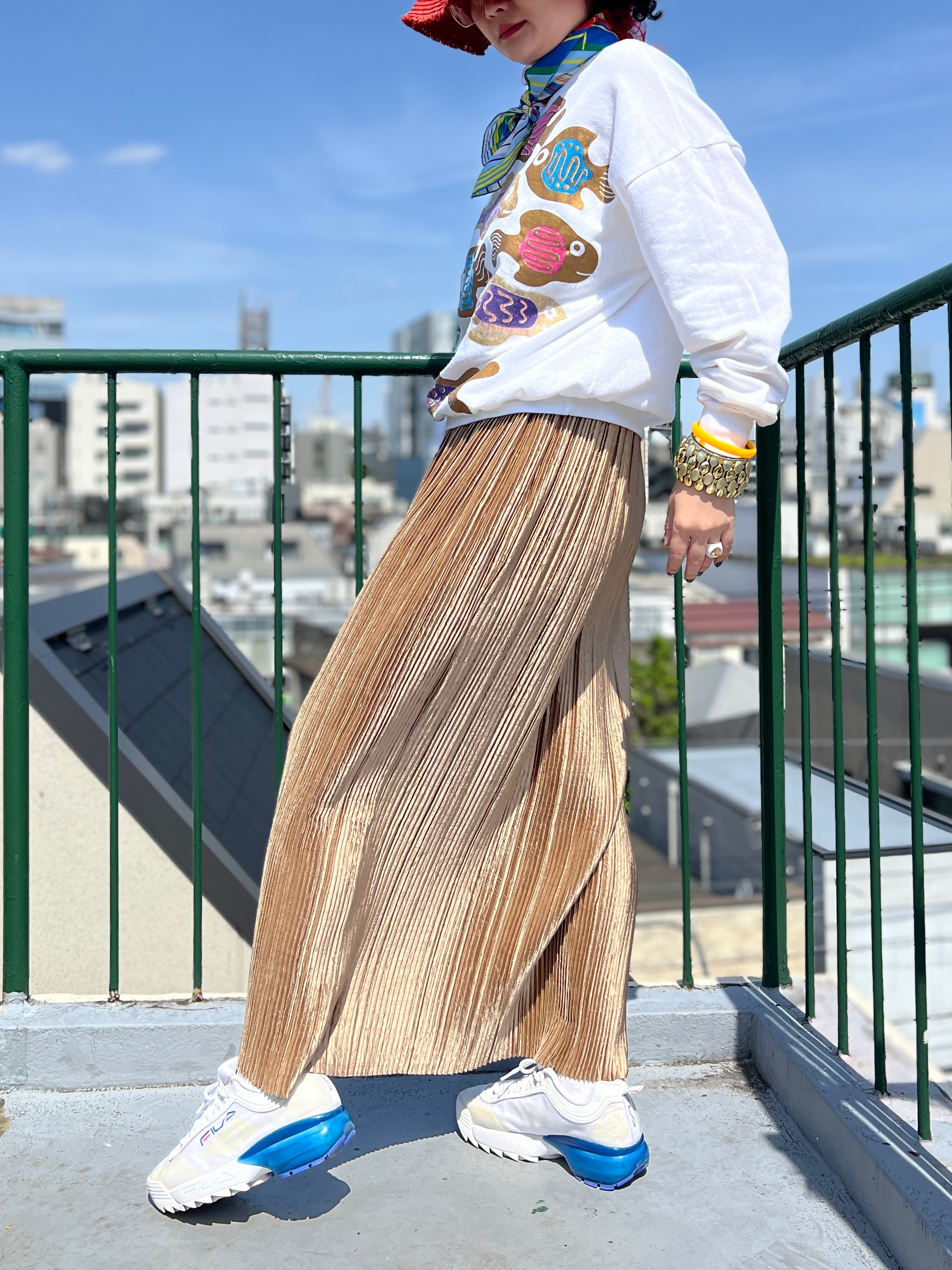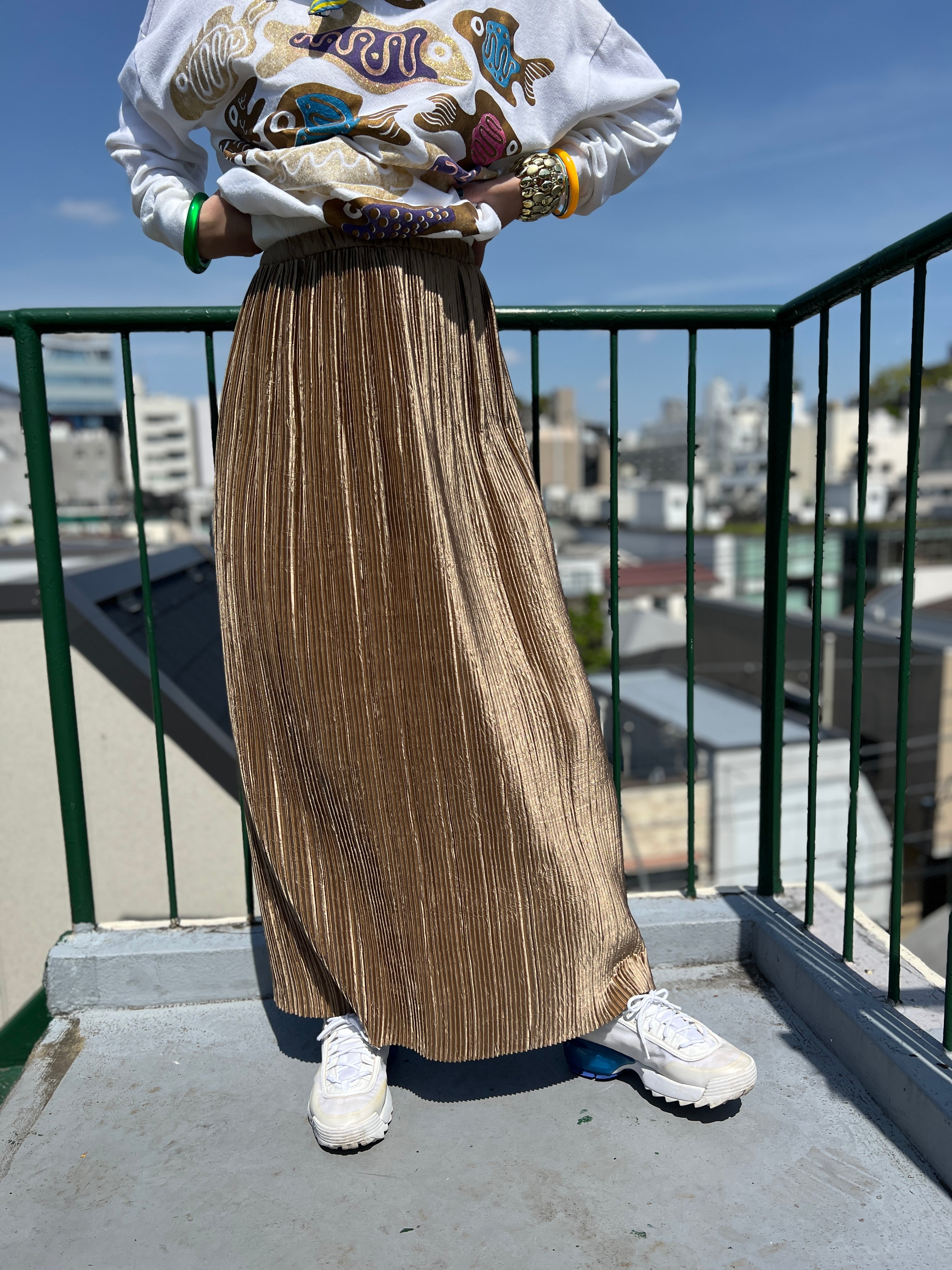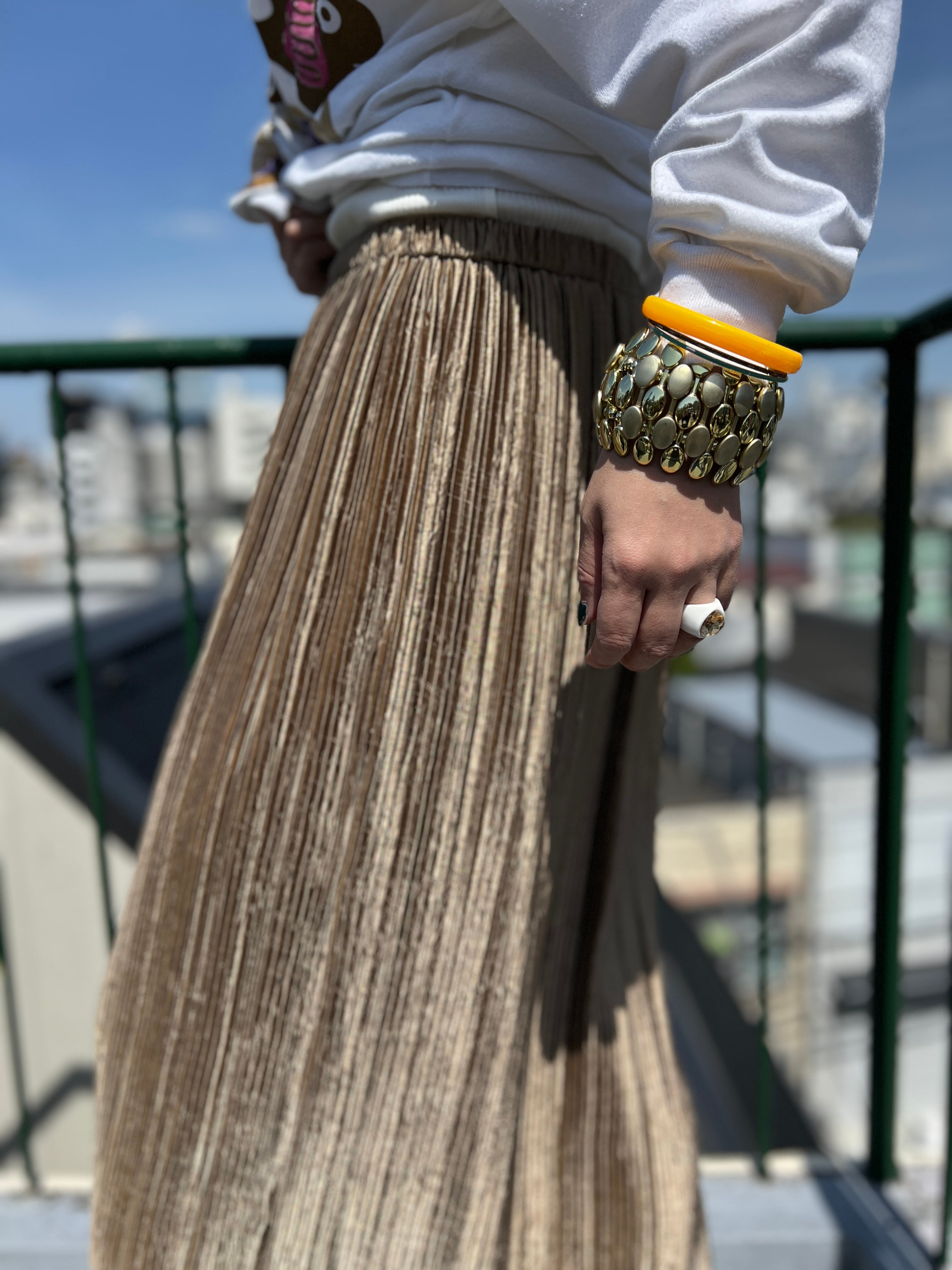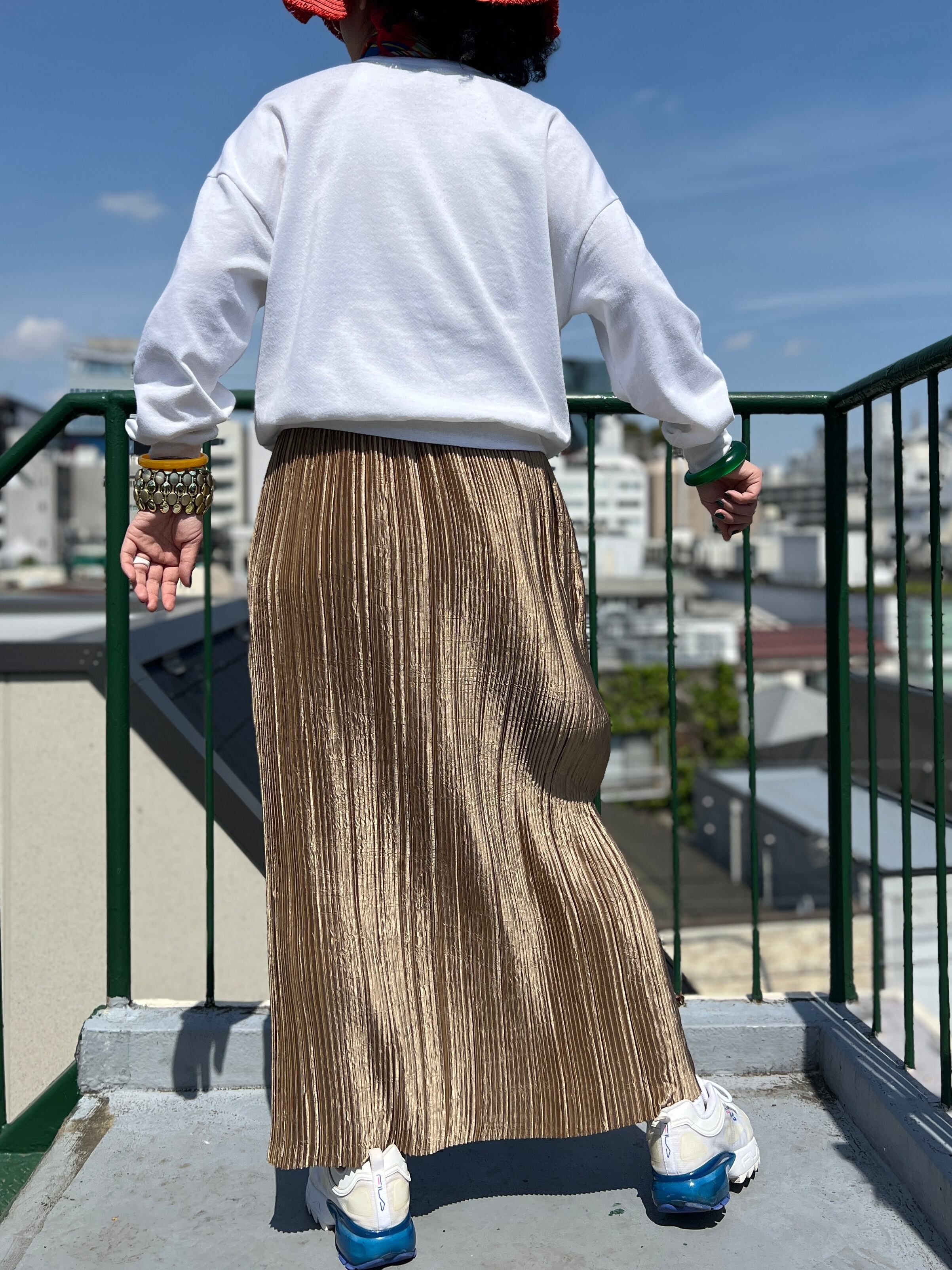 こちらは、光の当たり方で表情を変えるゴールドカラーが印象的な一着。細やかなプリーツが縦のラインを強調し、動くたびに美しく揺れ、スタイリング全体を一気に格上げしてくれます。