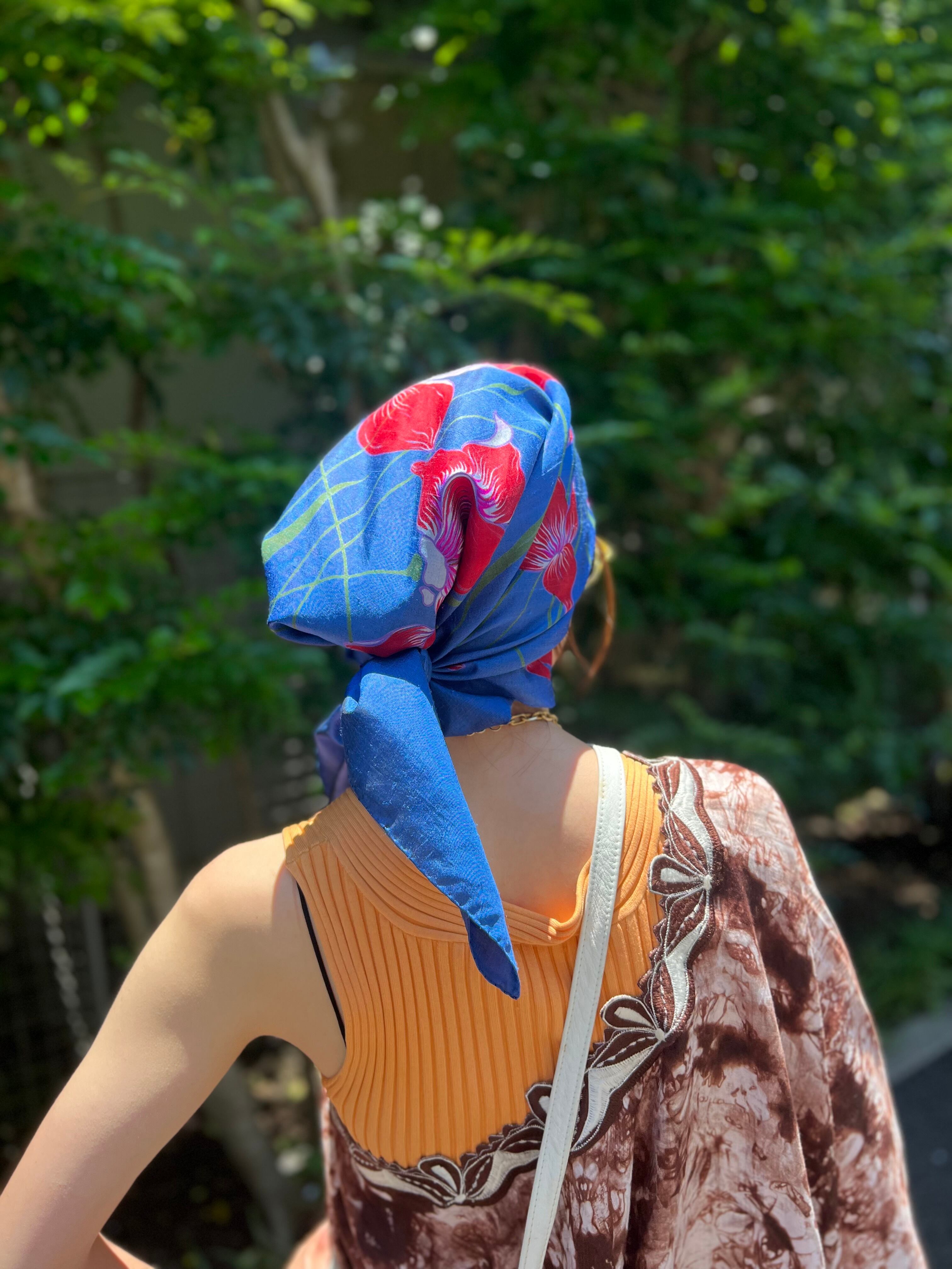 Vintage Thai silk navy × floral scarf ( ヴィンテージ タイシルク ネイビー × 花柄 スカーフ )